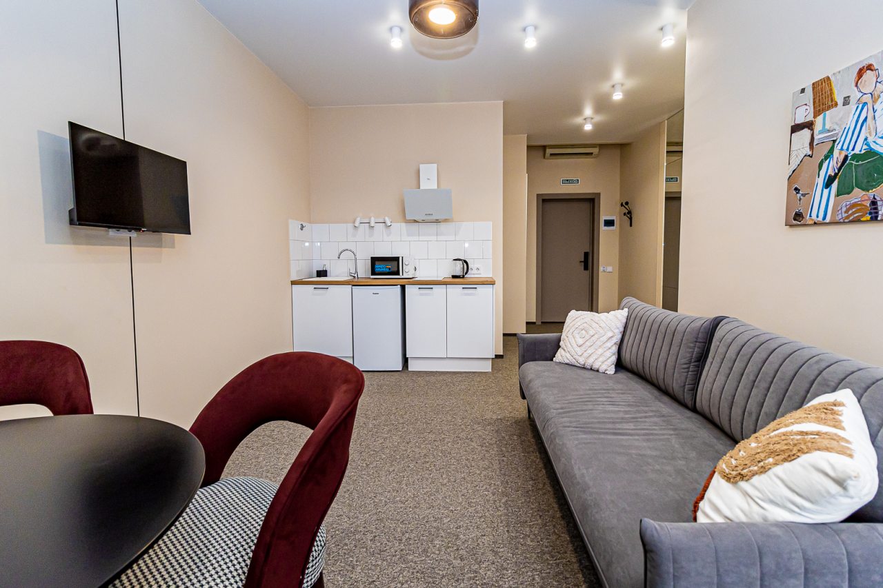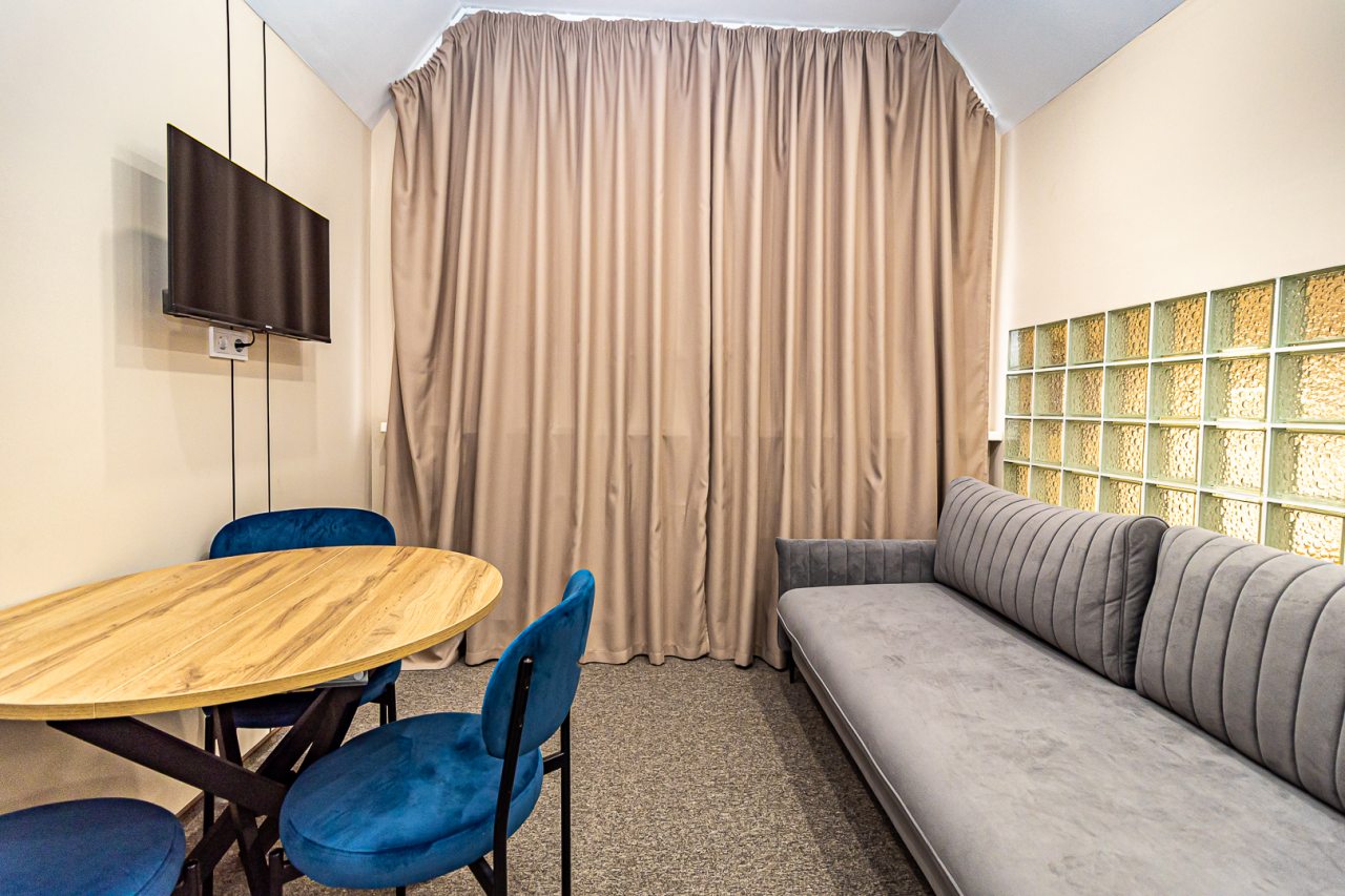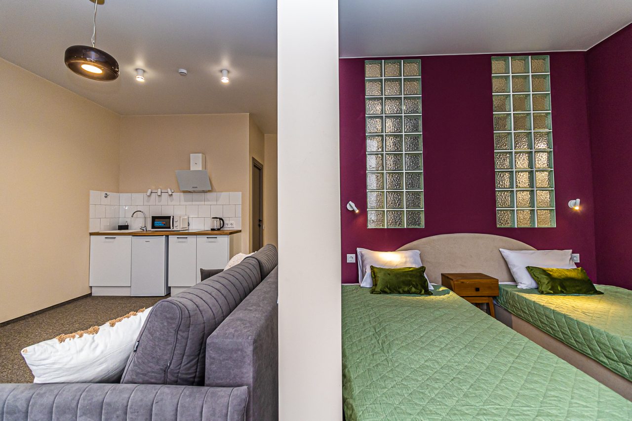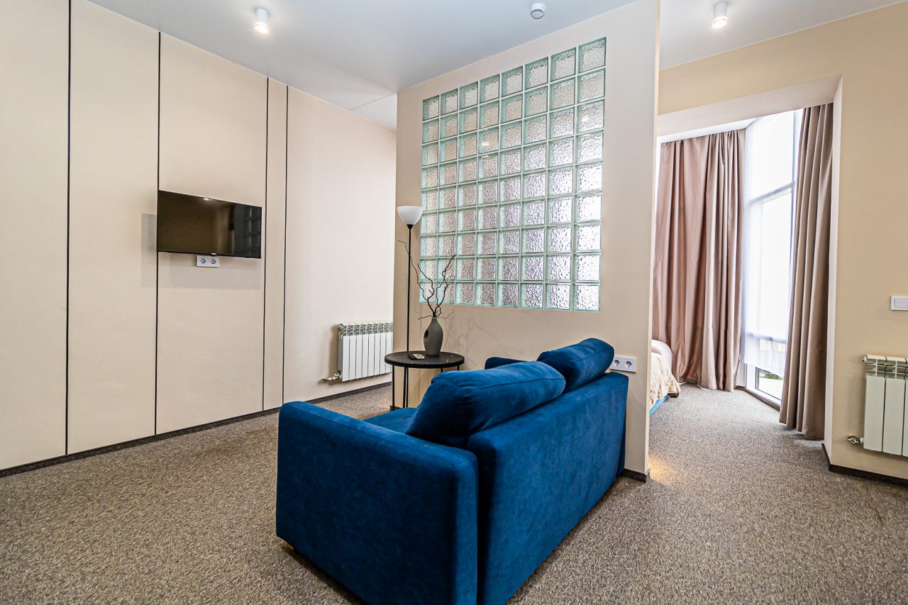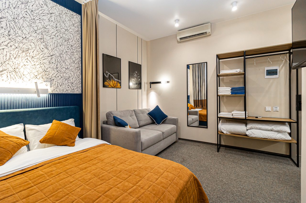 Гостям предлагаются комфортные и стильные номера, оснащённые всем необходимым: широкой двуспальной кроватью со свежим бельём, диваном, плазменным телевизором, высокоскоростным интернетом. В ванной комнате есть вся необходимая сантехника, халат, тапочки, набор полотенец, фен, косметические средства.