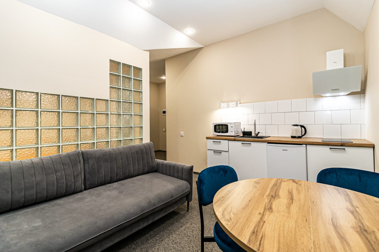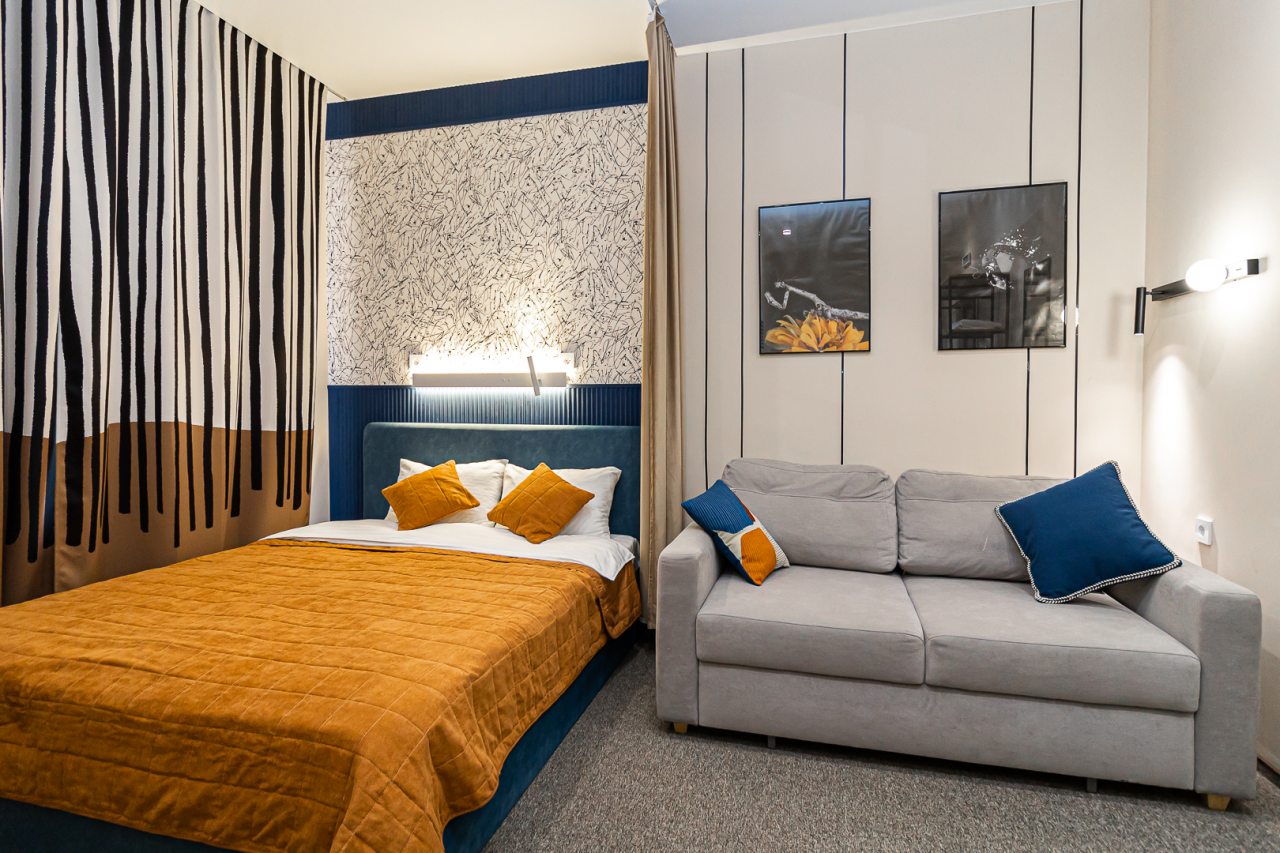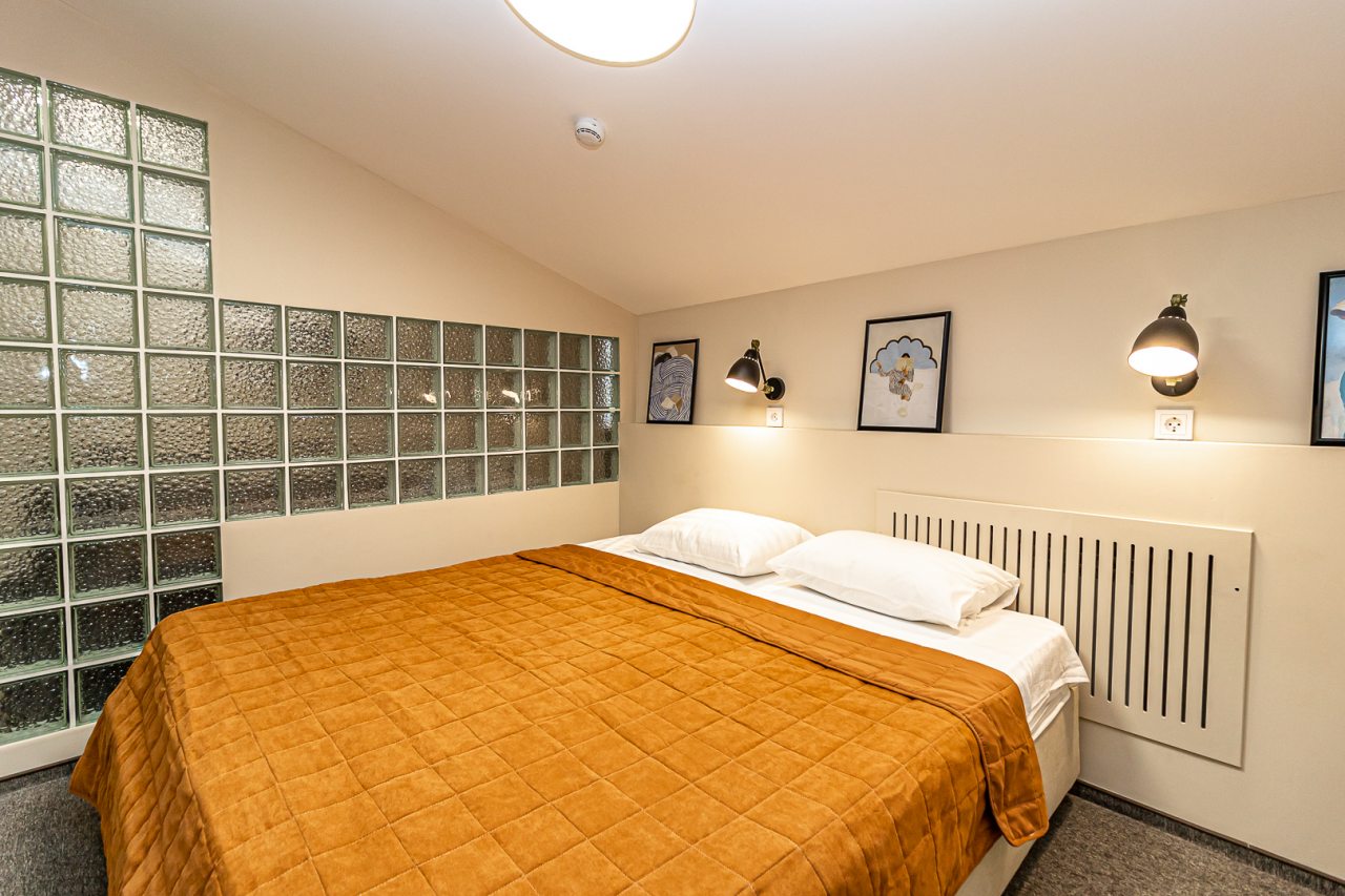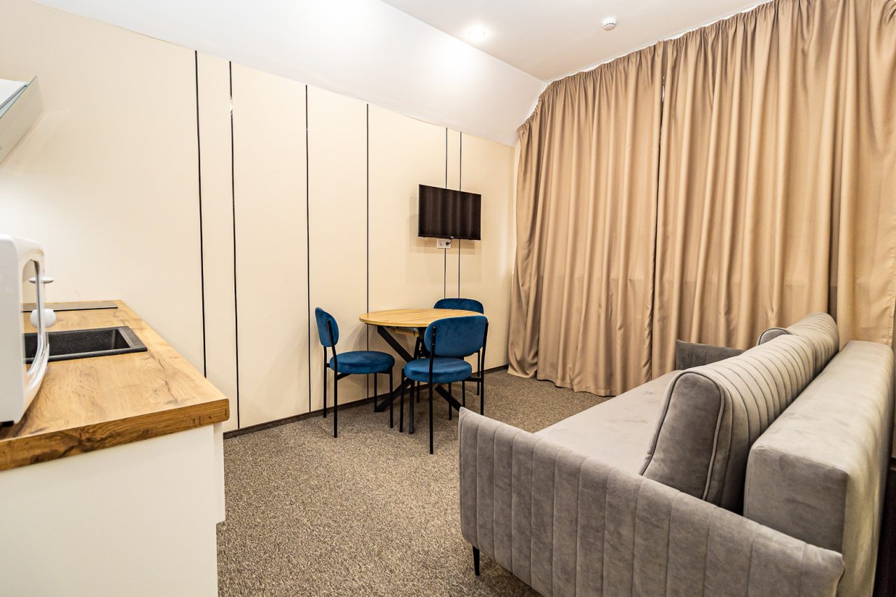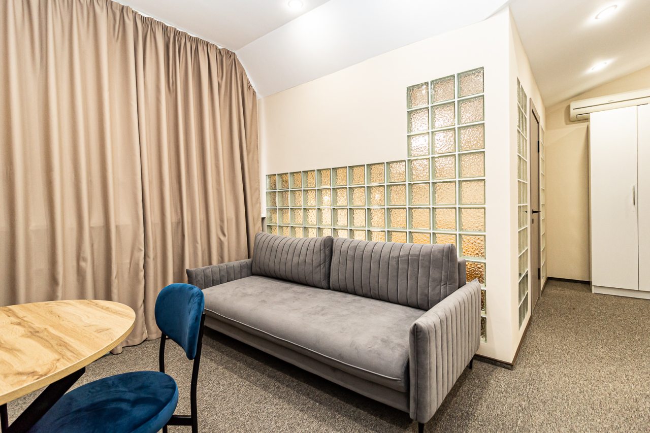 Гостям предлагаются комфортные и стильные номера, оснащённые всем необходимым: широкой двуспальной кроватью со свежим бельём, диваном, плазменным телевизором, высокоскоростным интернетом. В ванной комнате есть вся необходимая сантехника, халат, тапочки, набор полотенец, фен, косметические средства.