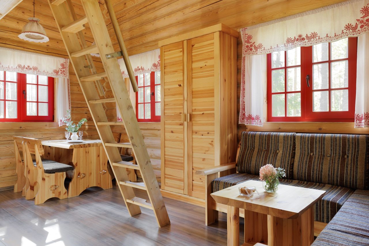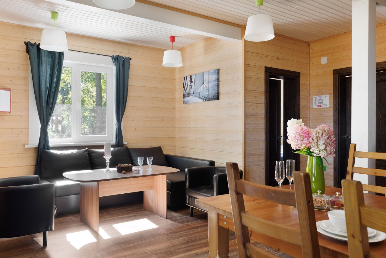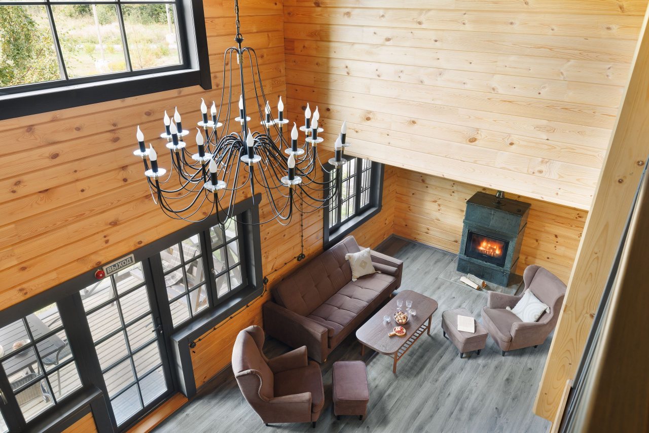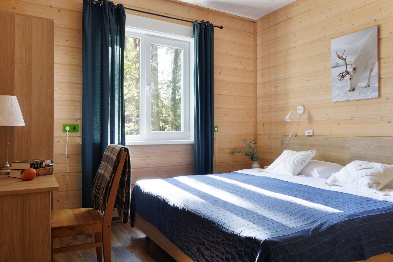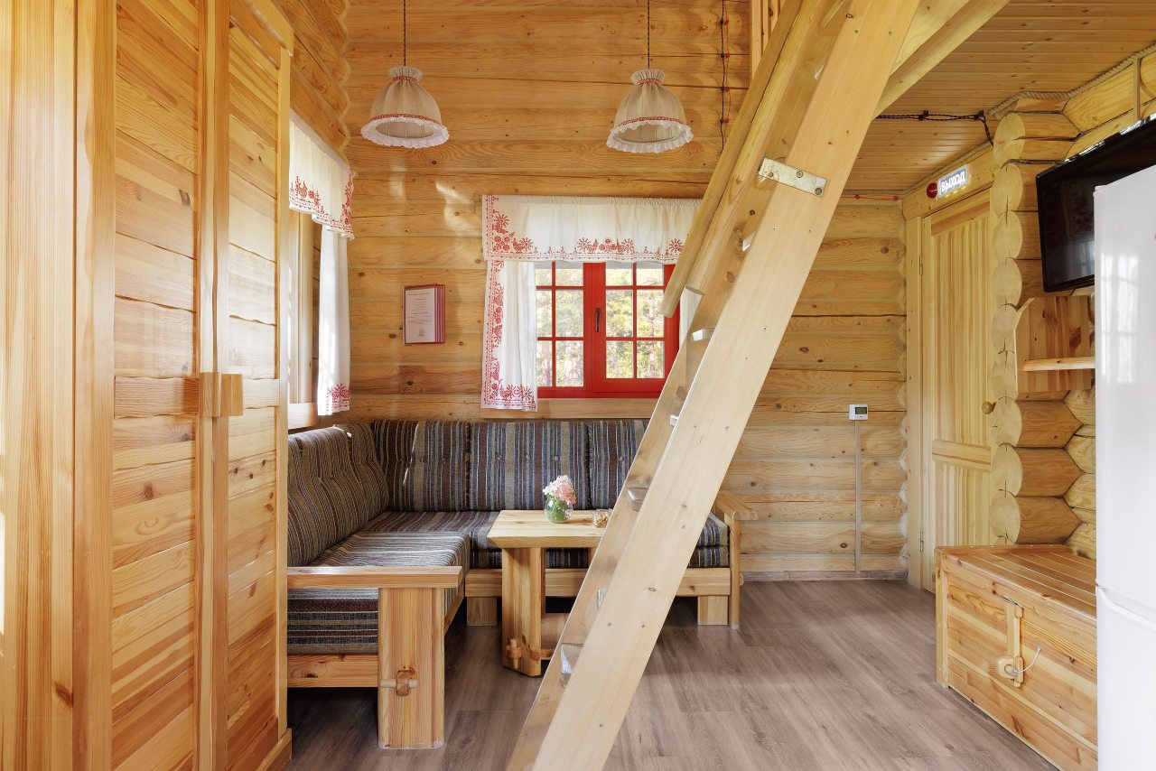 Все коттеджи полностью оборудованы, на первых этажах просторные гостиные с диванами и телевизором, ванные комнаты, кухня со всем необходимым оборудованием, сауна на дровах. На втором две спальни с одно и двухместными кроватями. Все имеют балконы и террасы или мансарды. Для маленьких постояльцев предоставляется высокий стульчик и детские кроватки.