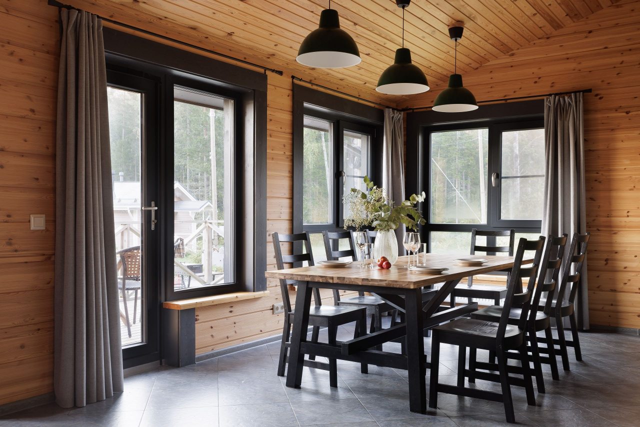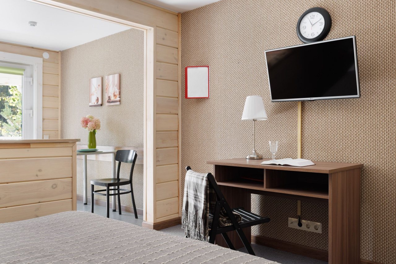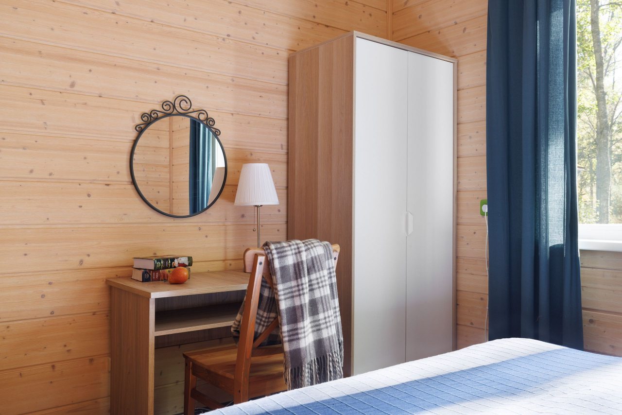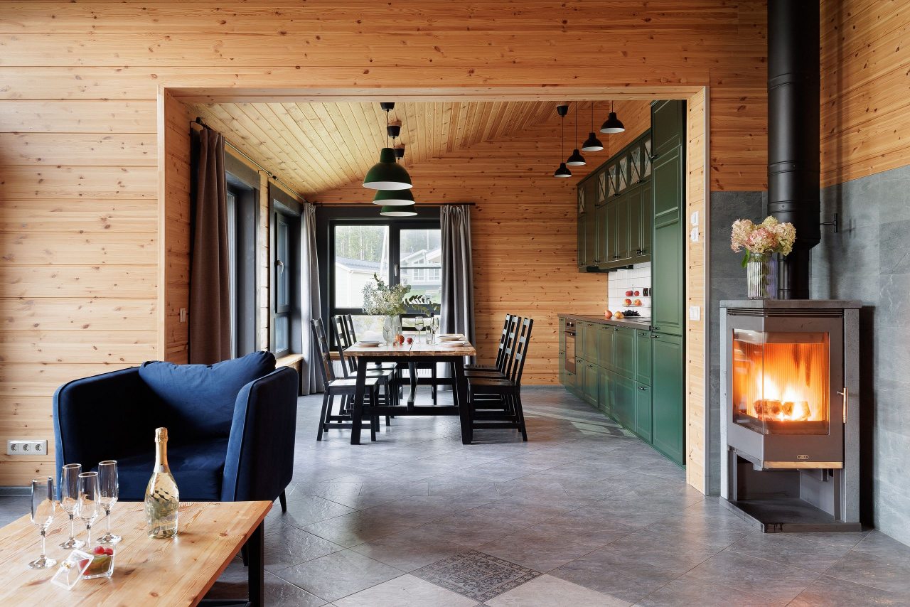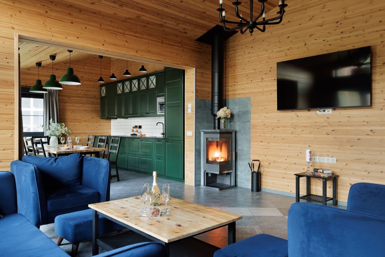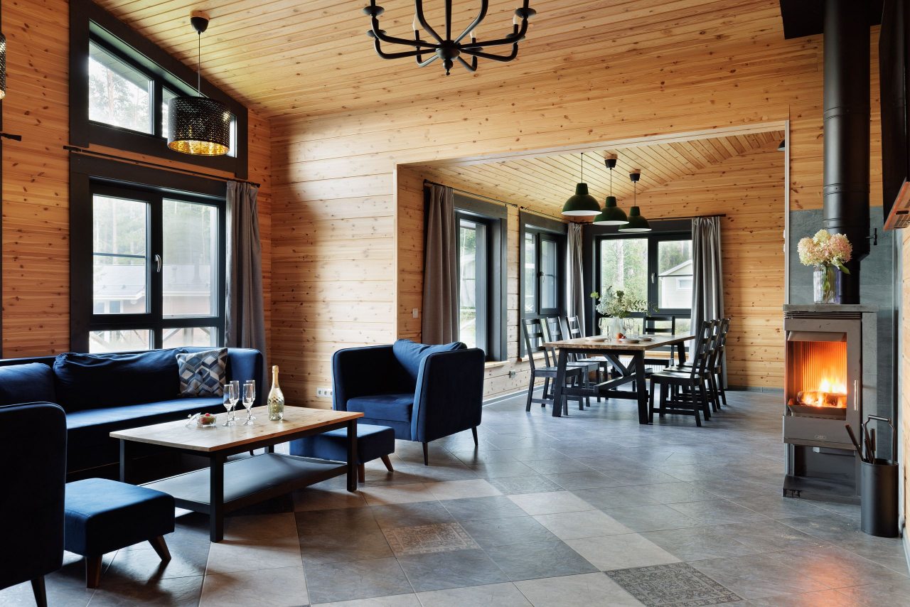 Все коттеджи полностью оборудованы, на первых этажах просторные гостиные с диванами и телевизором, ванные комнаты, кухня со всем необходимым оборудованием, сауна на дровах. На втором две спальни с одно и двухместными кроватями. Все имеют балконы и террасы или мансарды. Для маленьких постояльцев предоставляется высокий стульчик и детские кроватки.