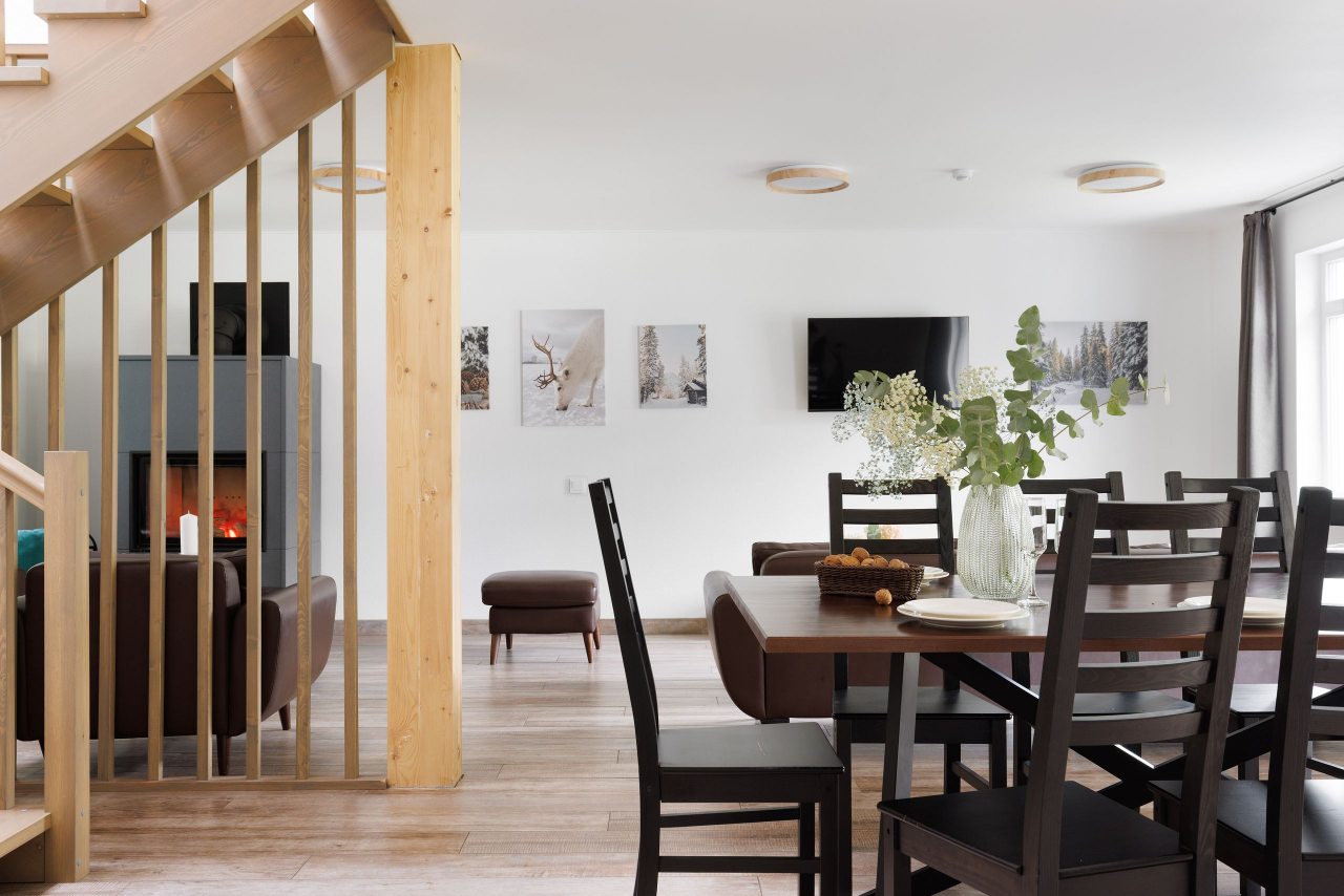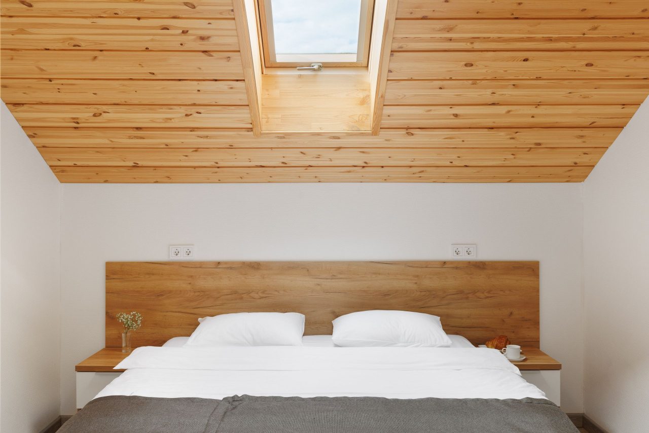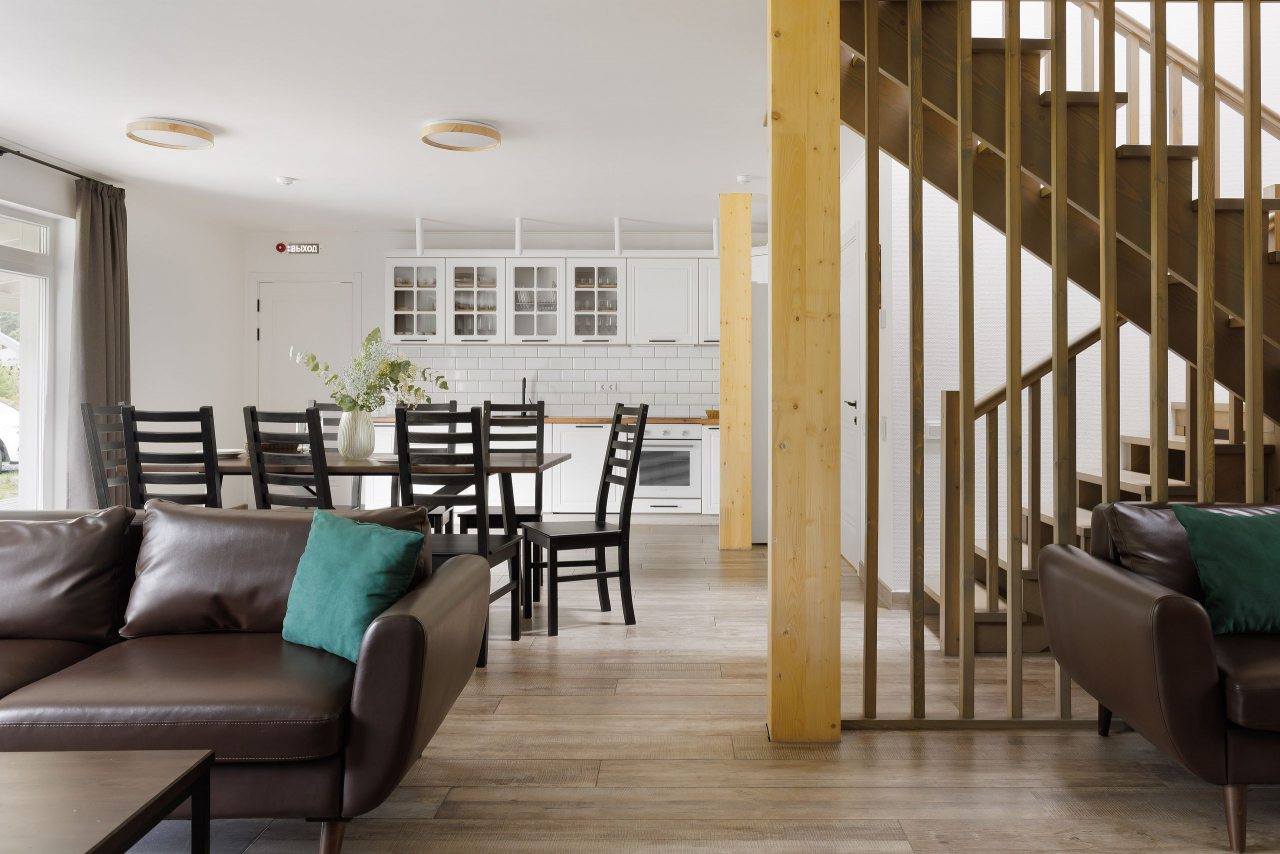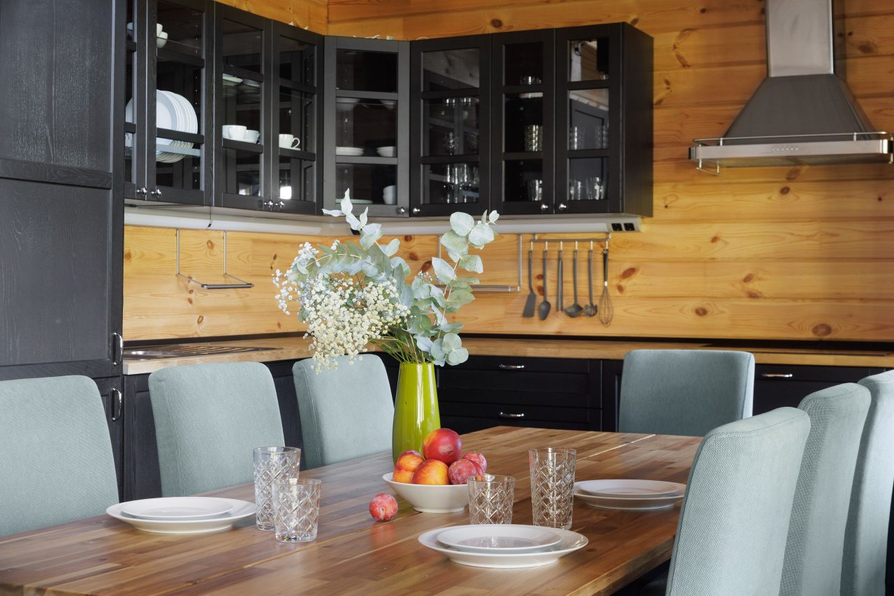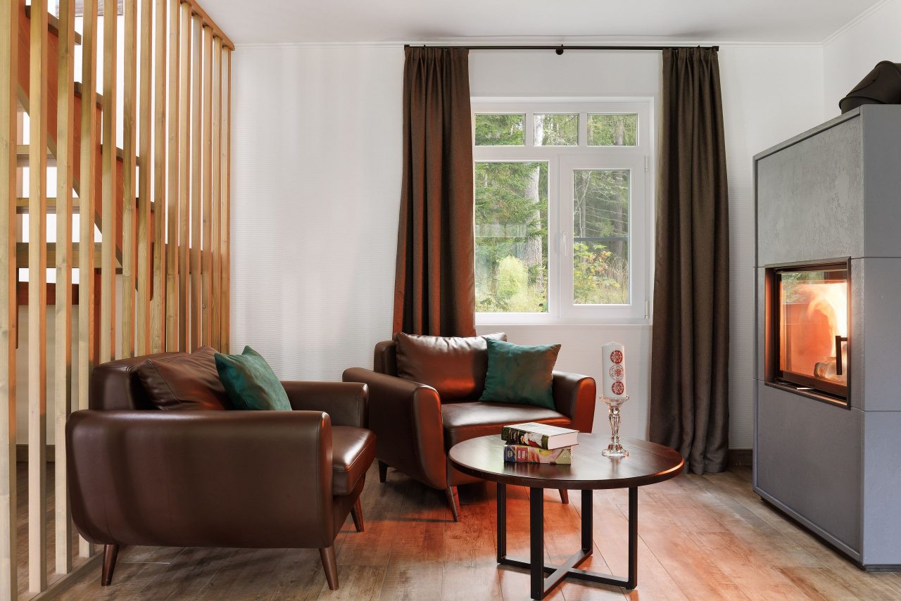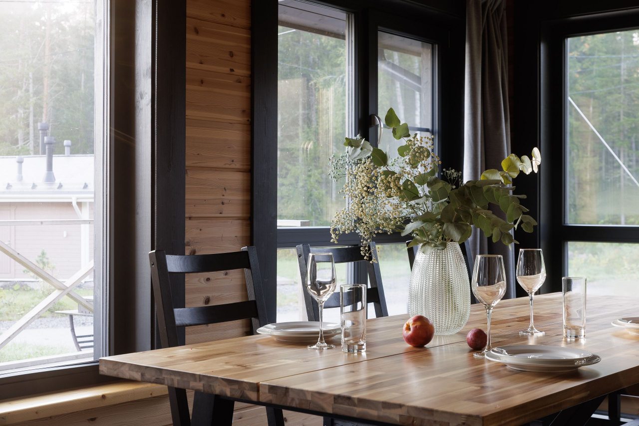 Все коттеджи полностью оборудованы, на первых этажах просторные гостиные с диванами и телевизором, ванные комнаты, кухня со всем необходимым оборудованием, сауна на дровах. На втором две спальни с одно и двухместными кроватями. Все имеют балконы и террасы или мансарды. Для маленьких постояльцев предоставляется высокий стульчик и детские кроватки.