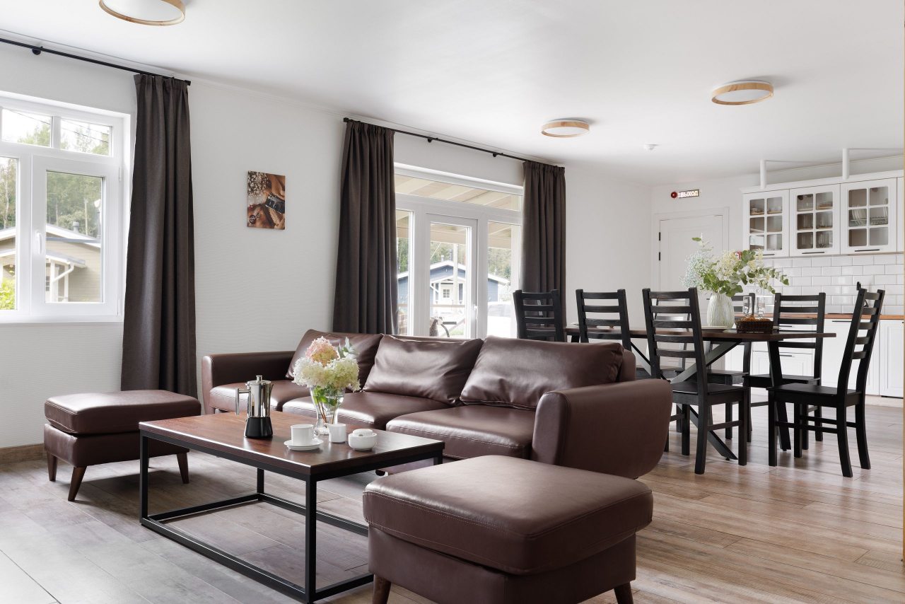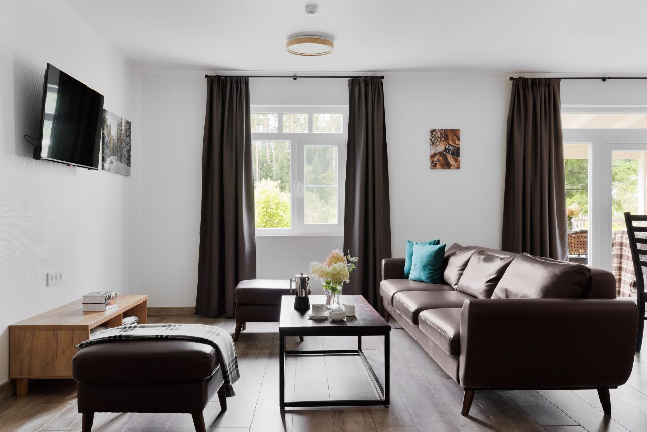 При заезде администратору оставляется залог наличными 5000 руб. за апартаменты, 10000 руб. за сосновый дом и коттеджи с 2 спальнями, 20000 руб. за коттеджи с 3 и 5 спальнями.