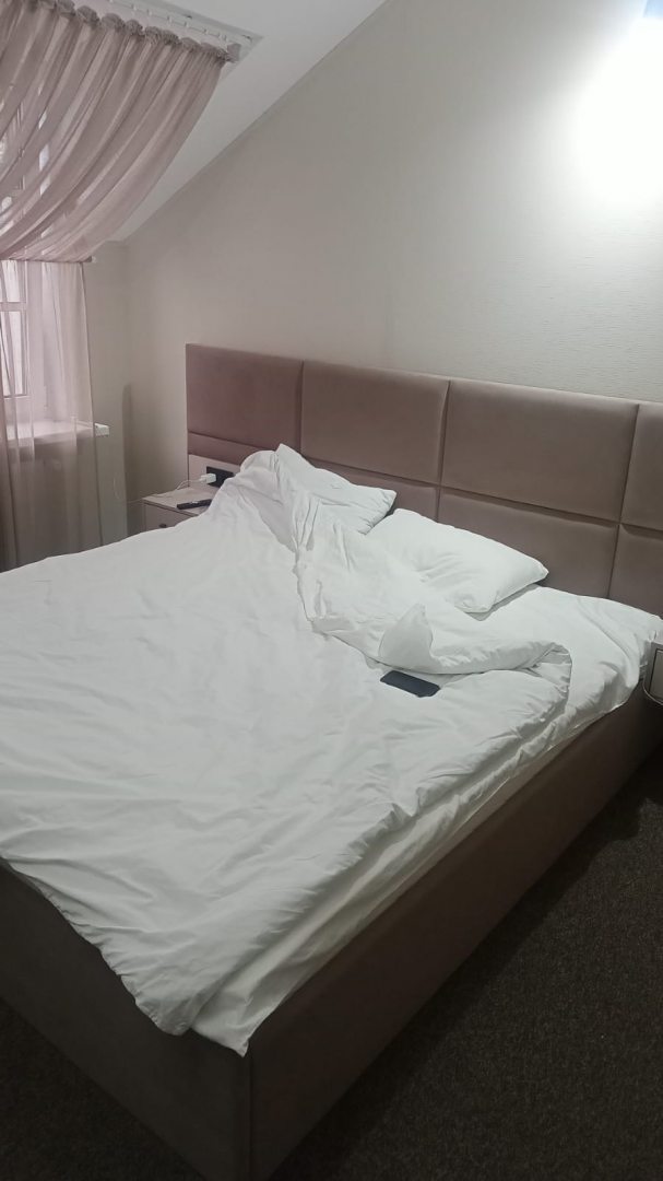 Постельное белье и набор полотенец белоснежные. Кровать комфортная, выспались просто чудесный. Завтрак можно заказать рядом в кафе, а на первом этаже лобио бар. Ужинали в кафе рядом, который в комплексе с гостевым домом. Выбор блюд просто шикарный. Рядом магазин пятёрочка