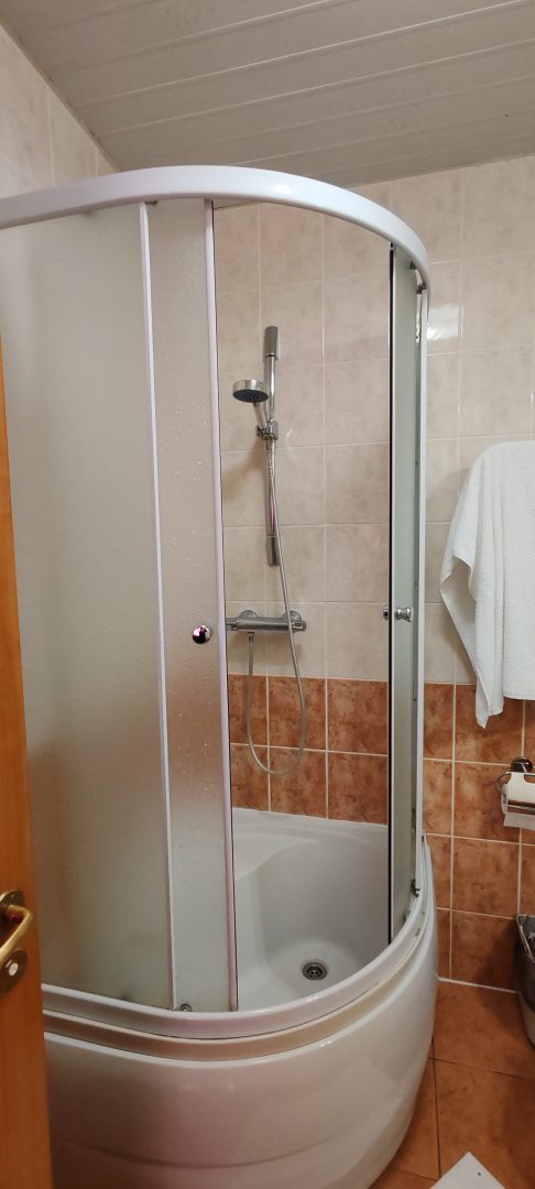 Просторная душевая кабинка в строительном исполнении со сдвижной дверью.