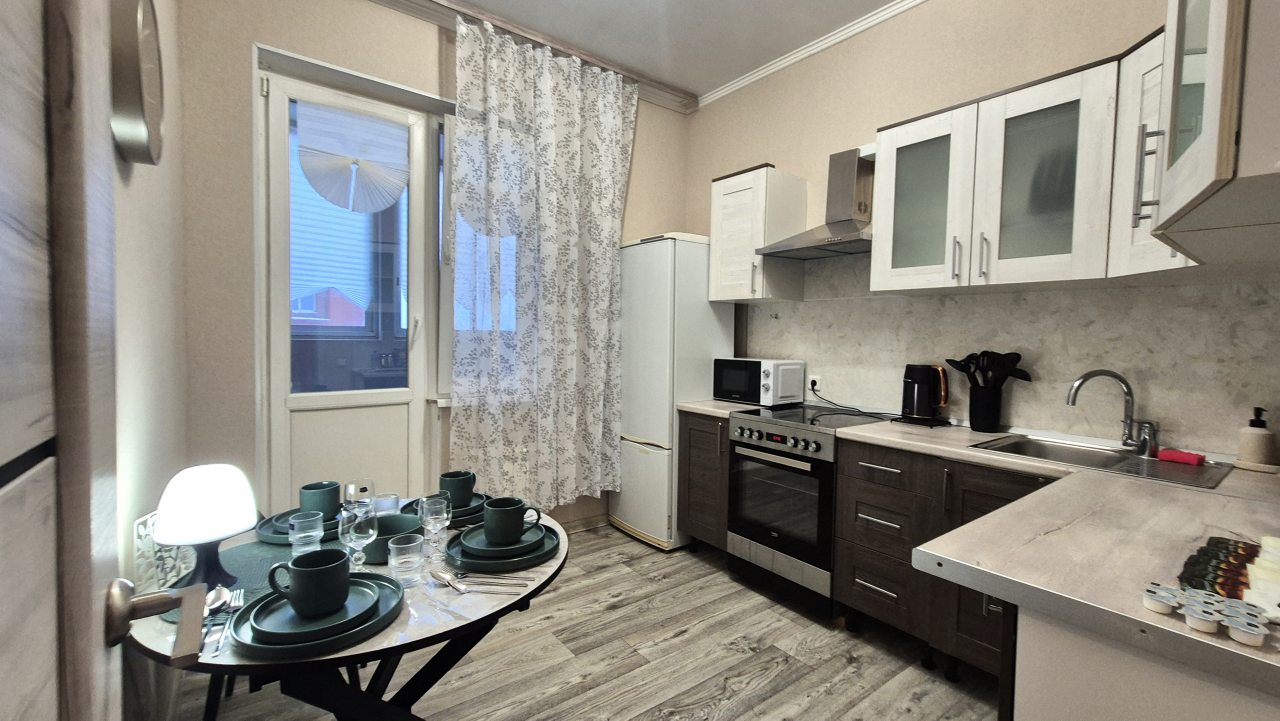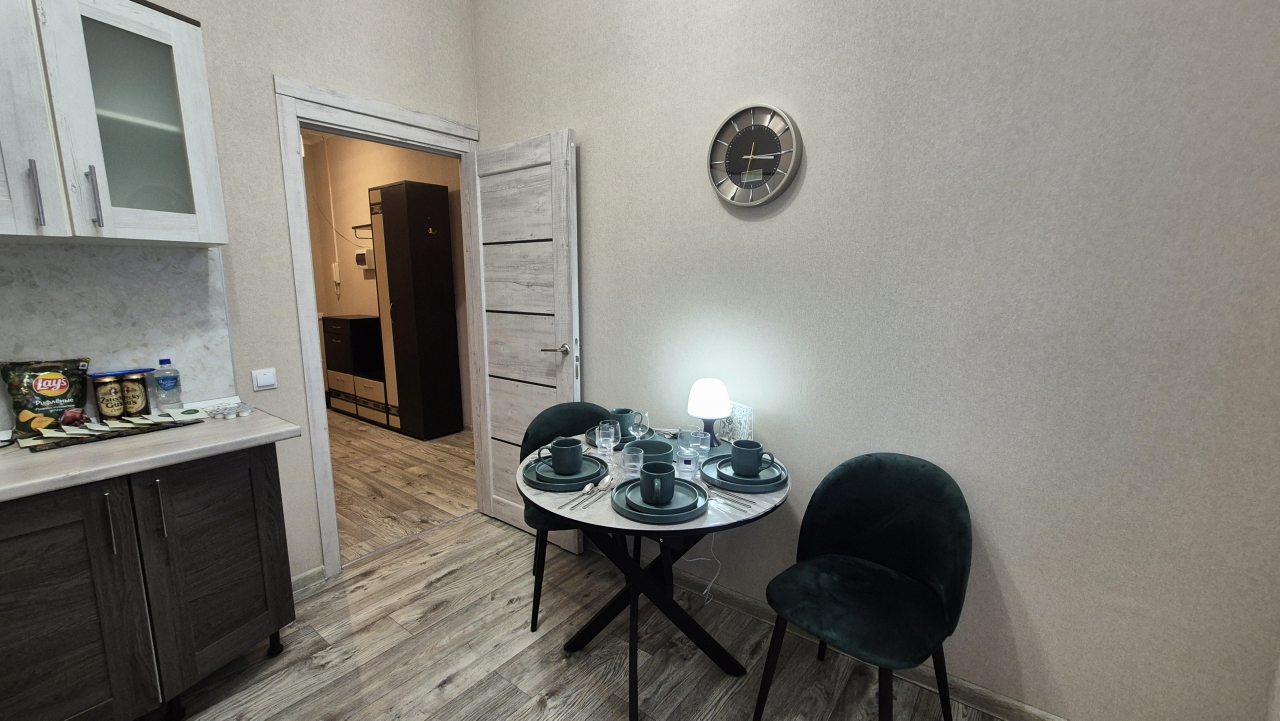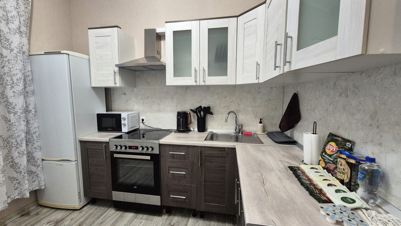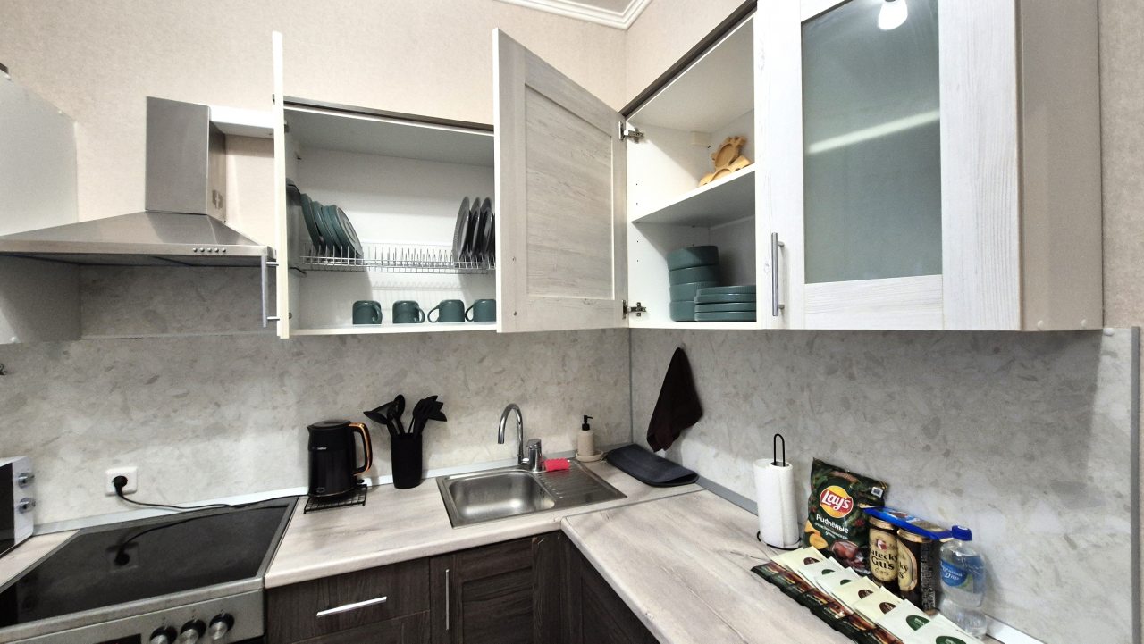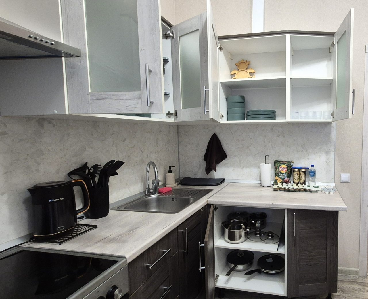 Стильная кухня оборудована комплектом гарнитура, духовым шкафом, электрочайником, микроволновой печью, варочной панелью, вытяжкой. Пообедать можно в одном из ближайших кафе.