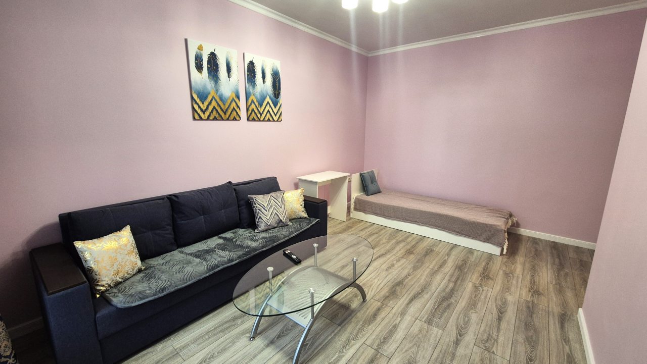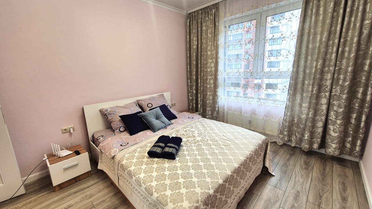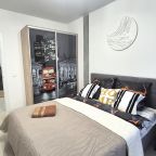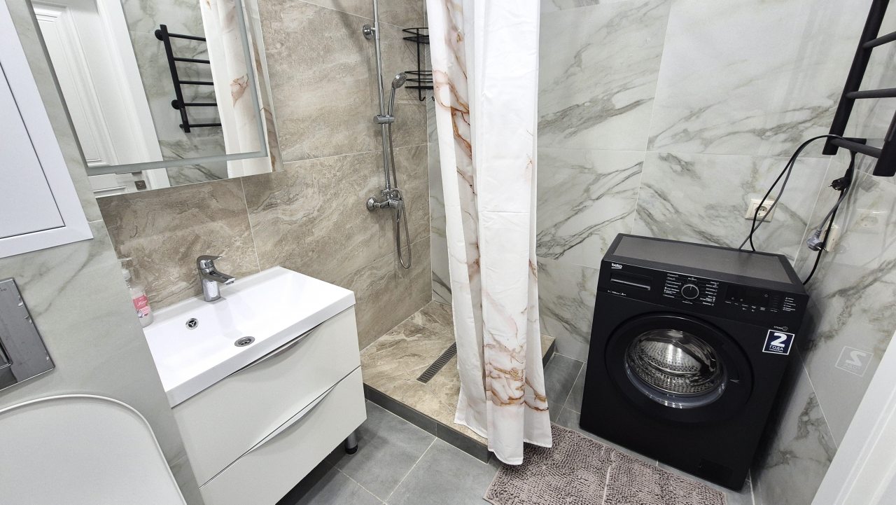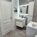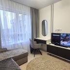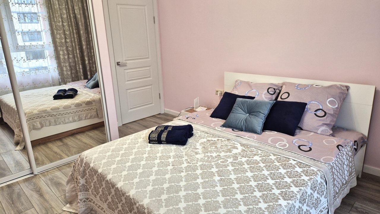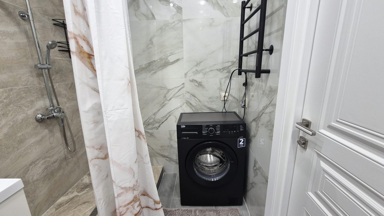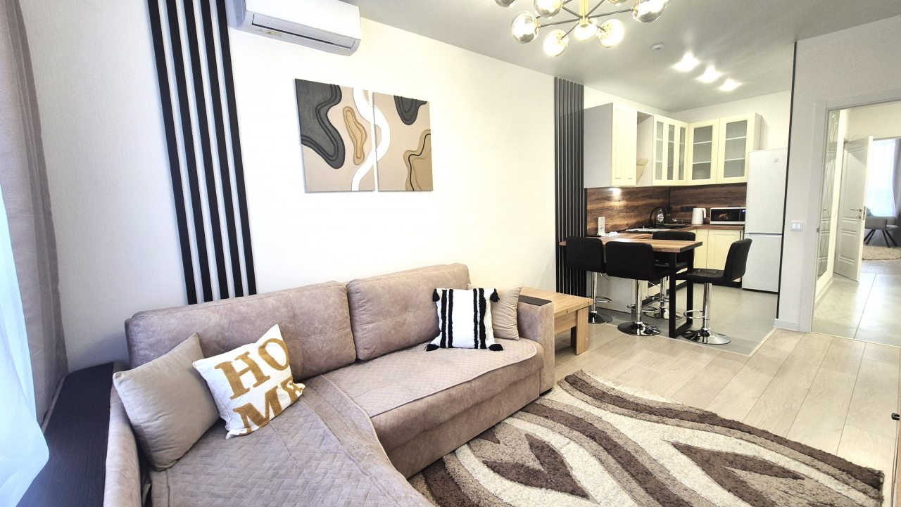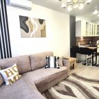 Это хороший вариант для размещения семьей или небольшой компанией, так как в наличии удобная двуспальная кровать и мягкие диваны, а также кондиционеры, телевизор, шкафы, ванная комната со стиральной машиной, средствами для личной гигиены, феном.