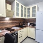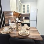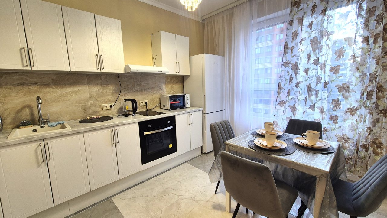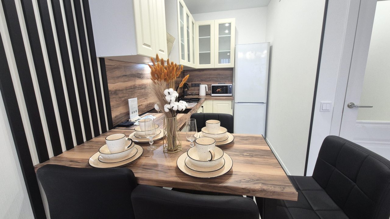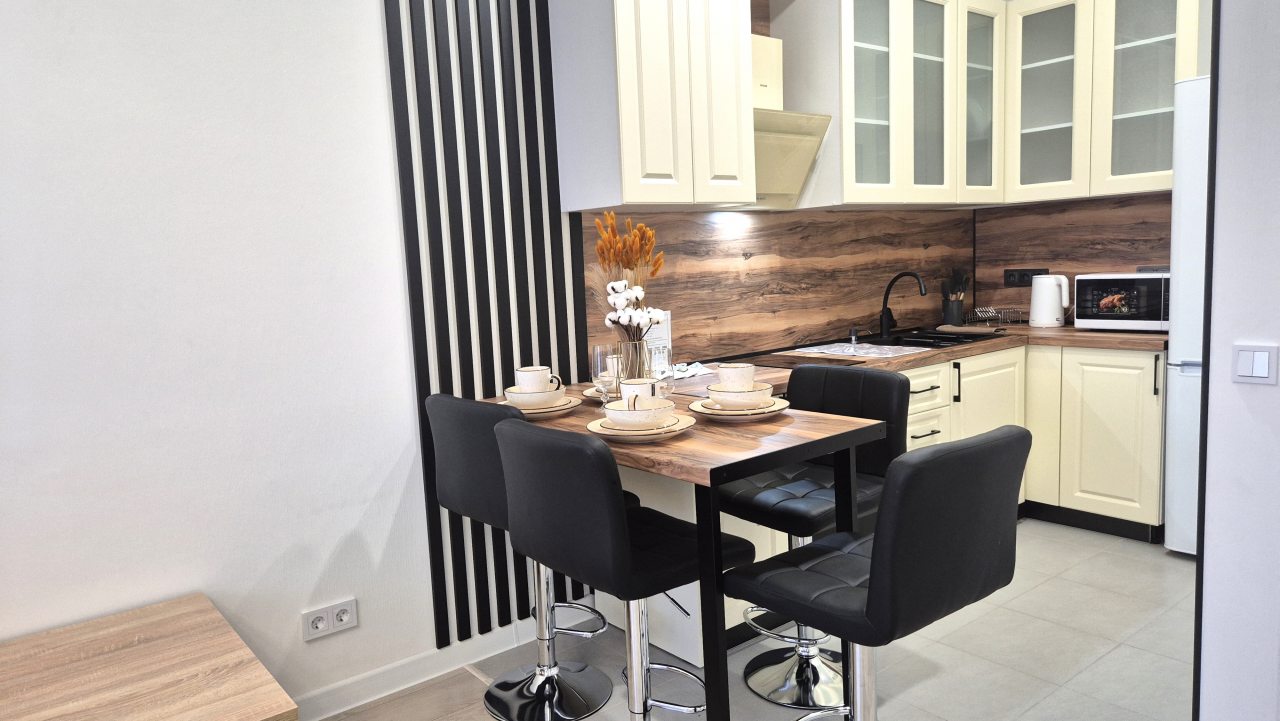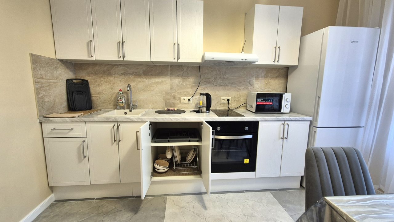 Кухонная зона укомплектована варочной панелью, духовым шкафом, СВЧ, холодильником, чайником, обеденным столом и стульями, чтобы вы всегда могли порадовать себя любимыми напитками и блюдами.