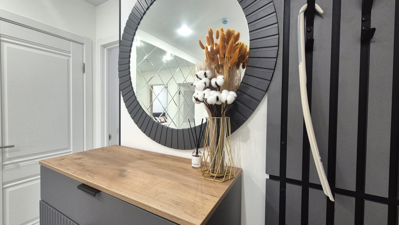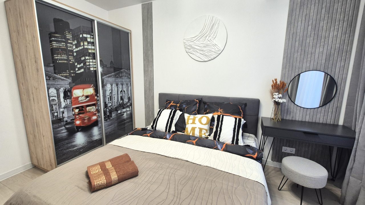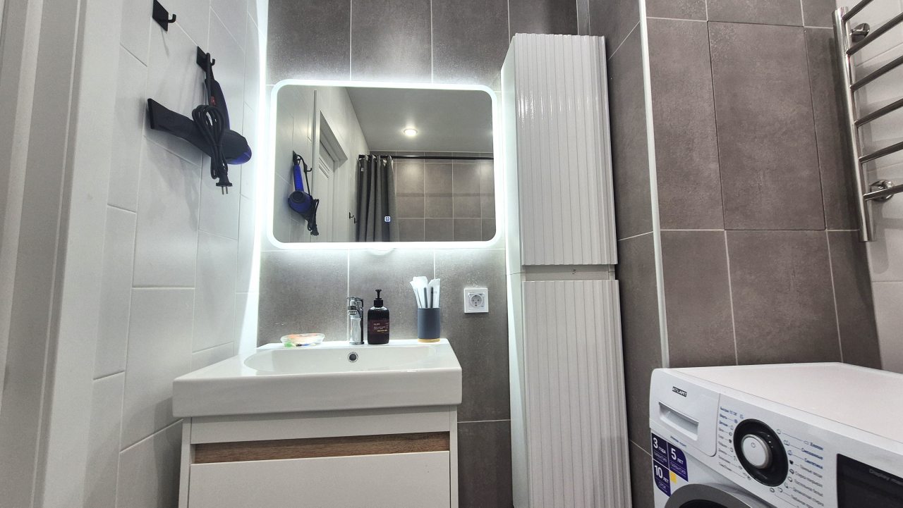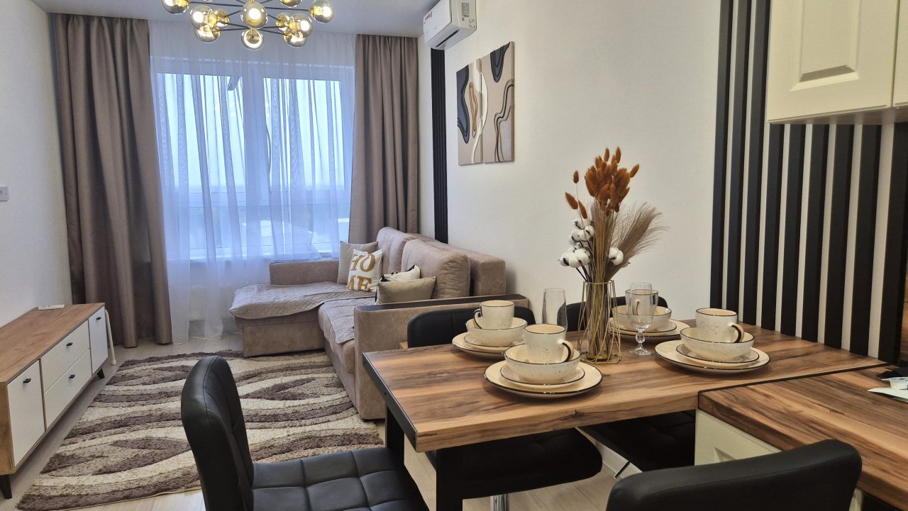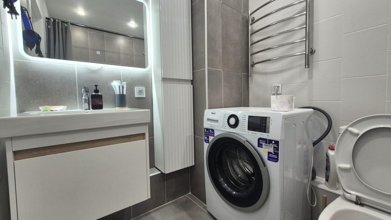 Внутри вас ожидает двуспальная кровать с качественным матрасом, мягкий и удобный диван, телевизор, кондиционер, полноценная ванна, стиральная машина, балкон с зоной отдыха, шкаф.