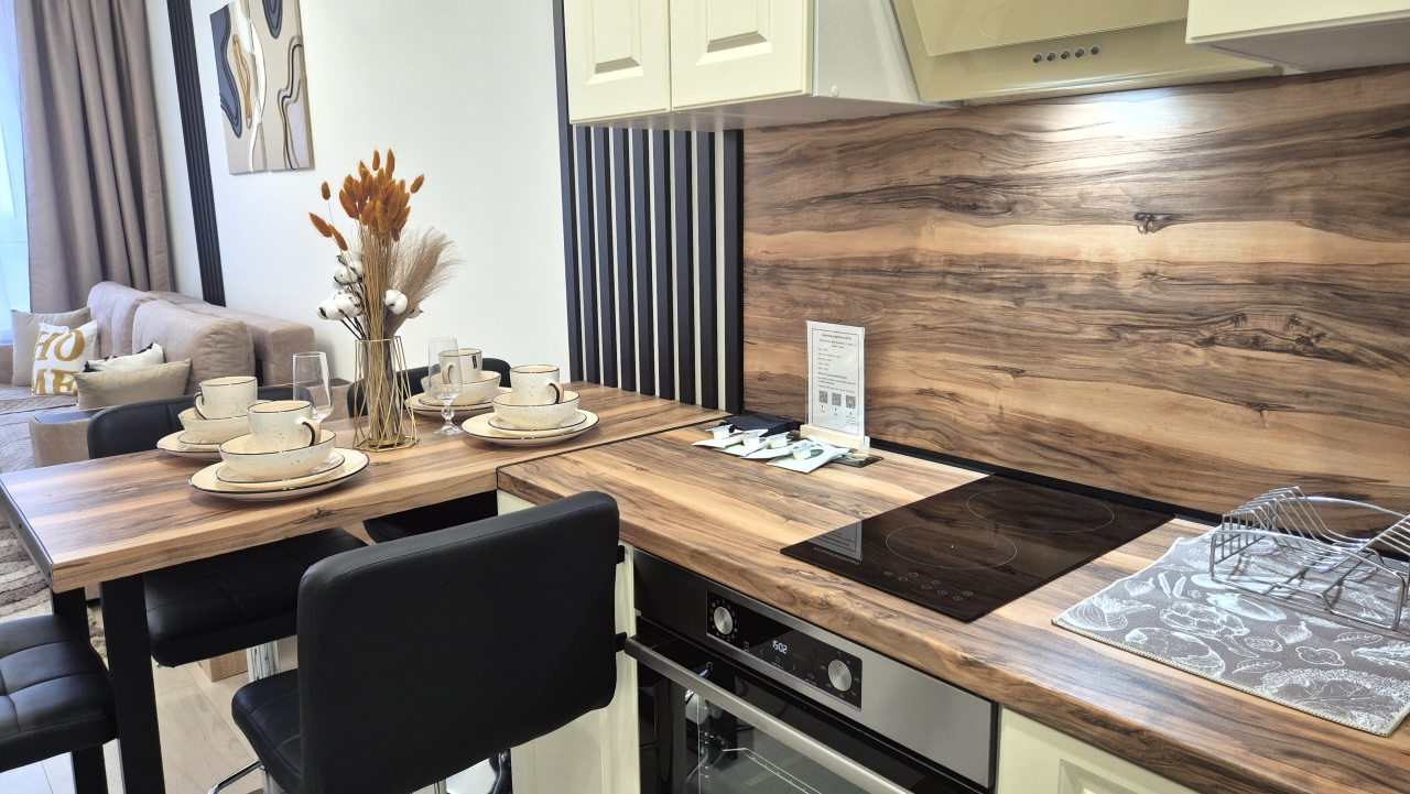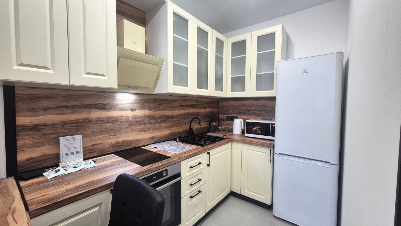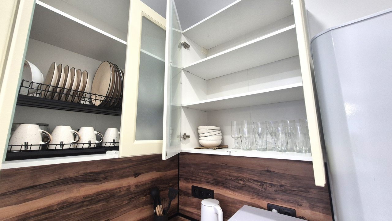 Кухня оснащена всем необходимым, включая посуду, варочную панель с вытяжкой, духовой шкаф, холодильник, чайник, СВЧ, обеденный стол и стулья.