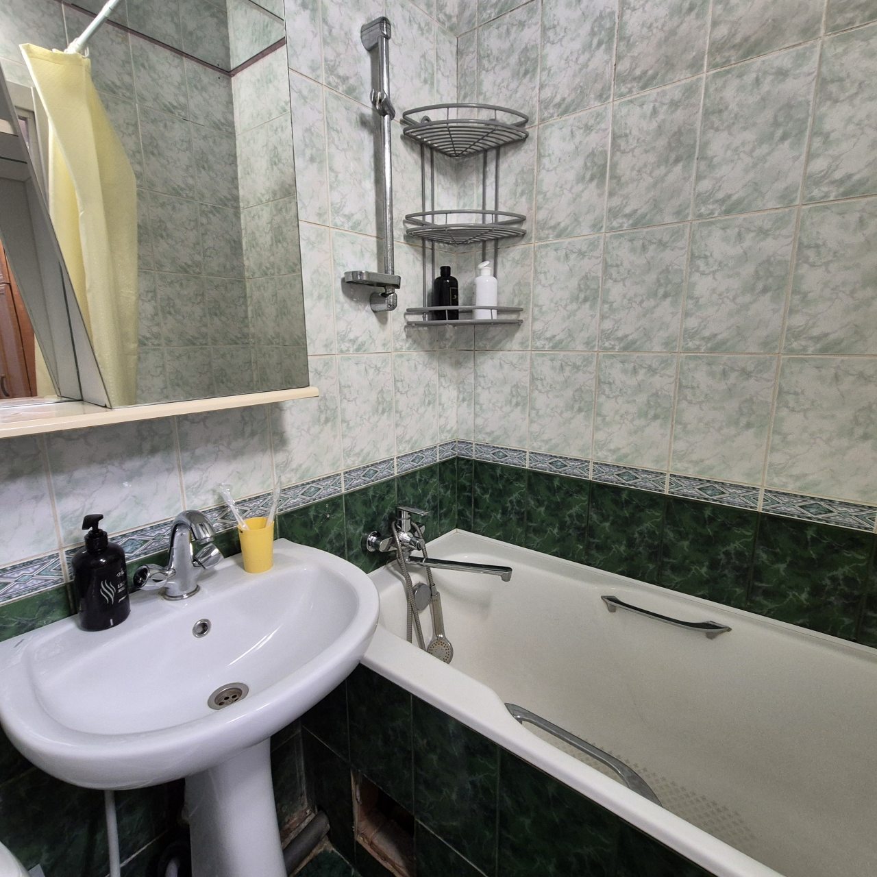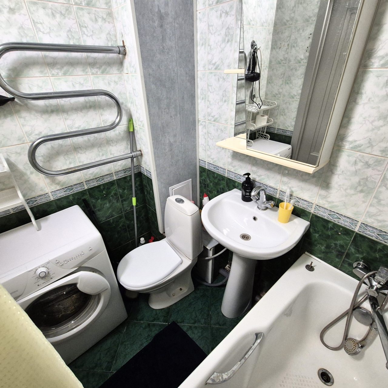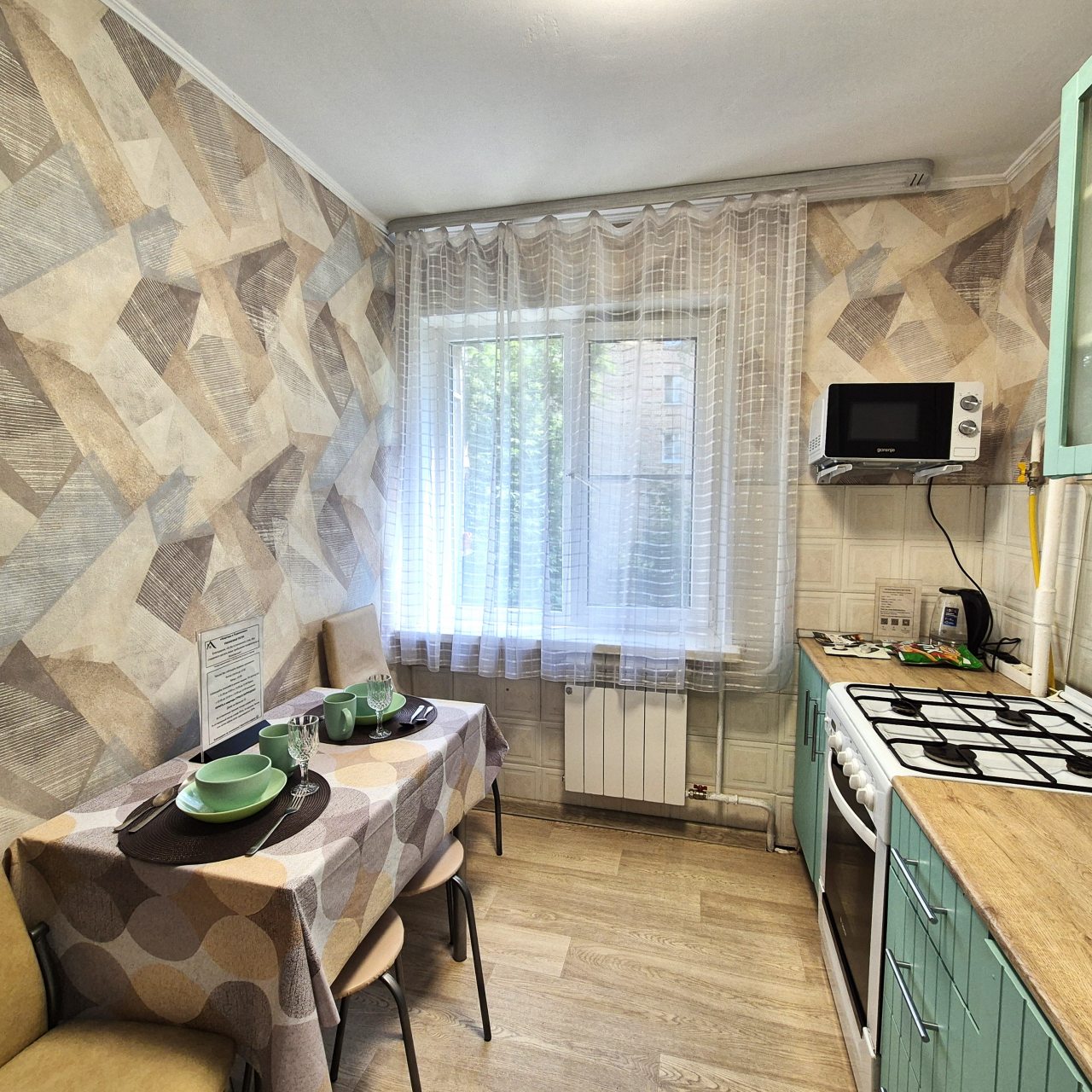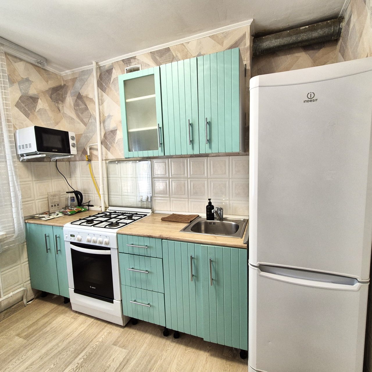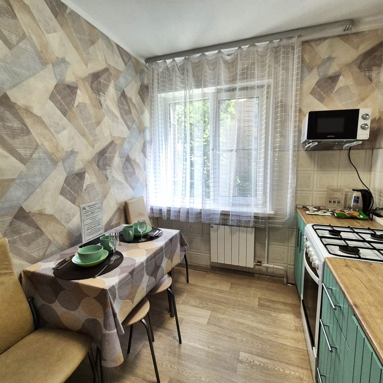 Кухня укомплектована ярким гарнитуром, обеденным столом и необходимой бытовой техникой, например: микроволновой печью, электрочайником, газовой плитой, холодильником и др. В шаговой доступности пиццерия, продуктовый магазин, пекарня, кафе.