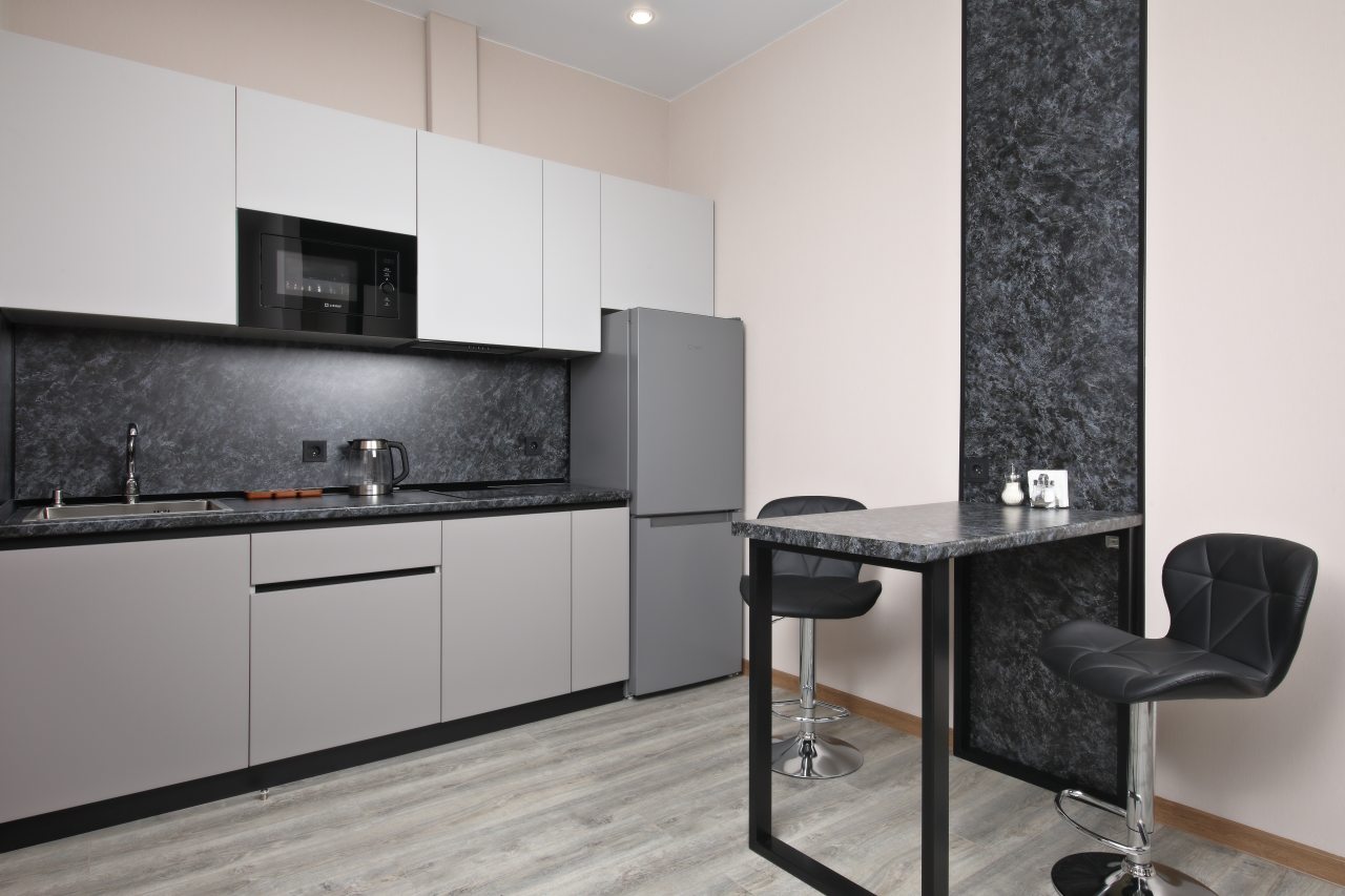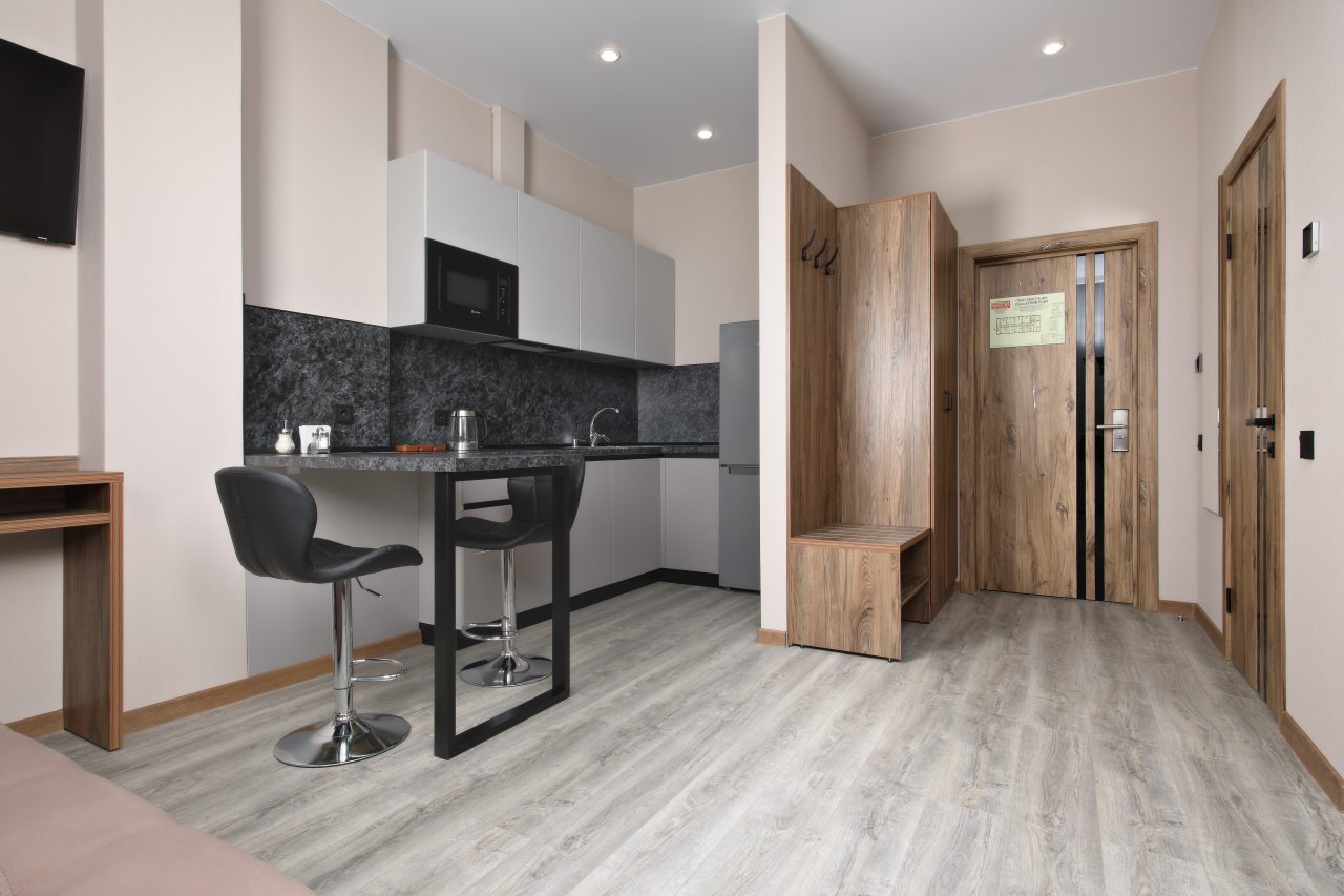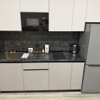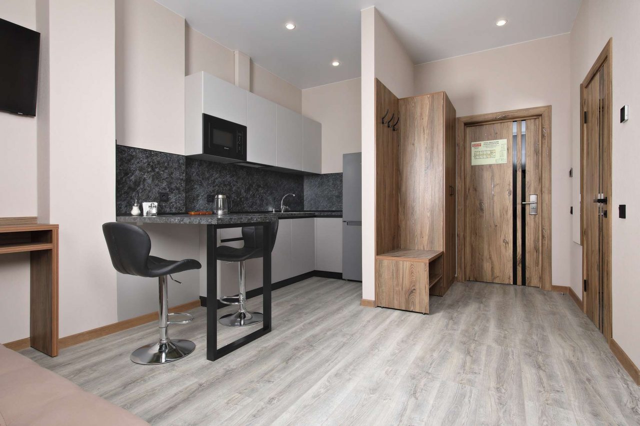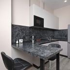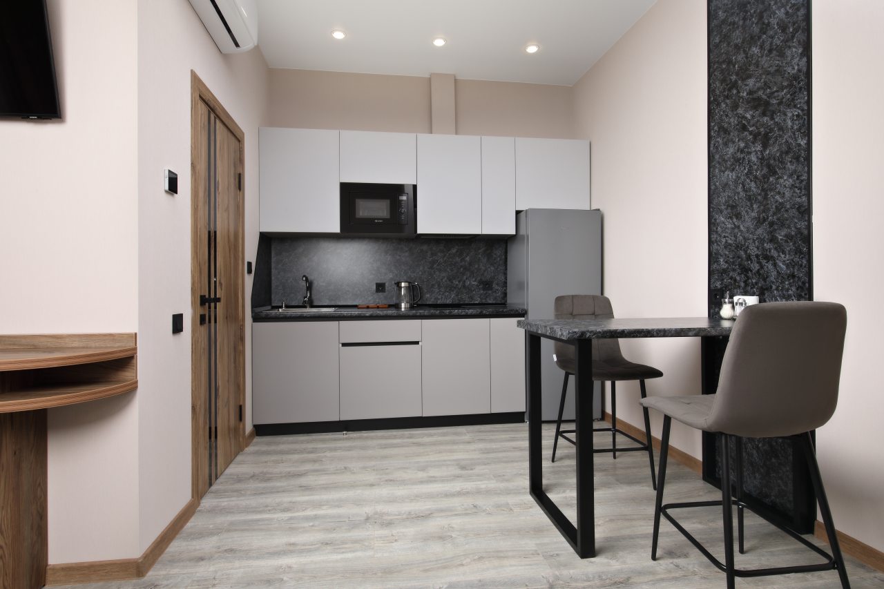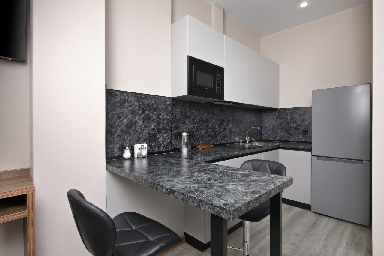 В номерах имеются кухонная и обеденная зоны, которые оснащены гарнитуром, бытовой техникой и столовыми приборами для приготовления еды.