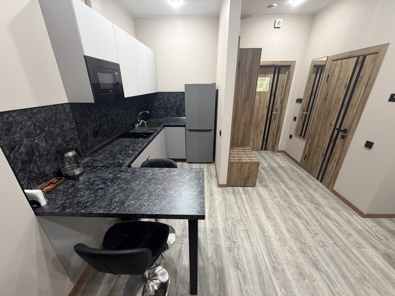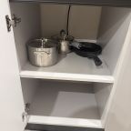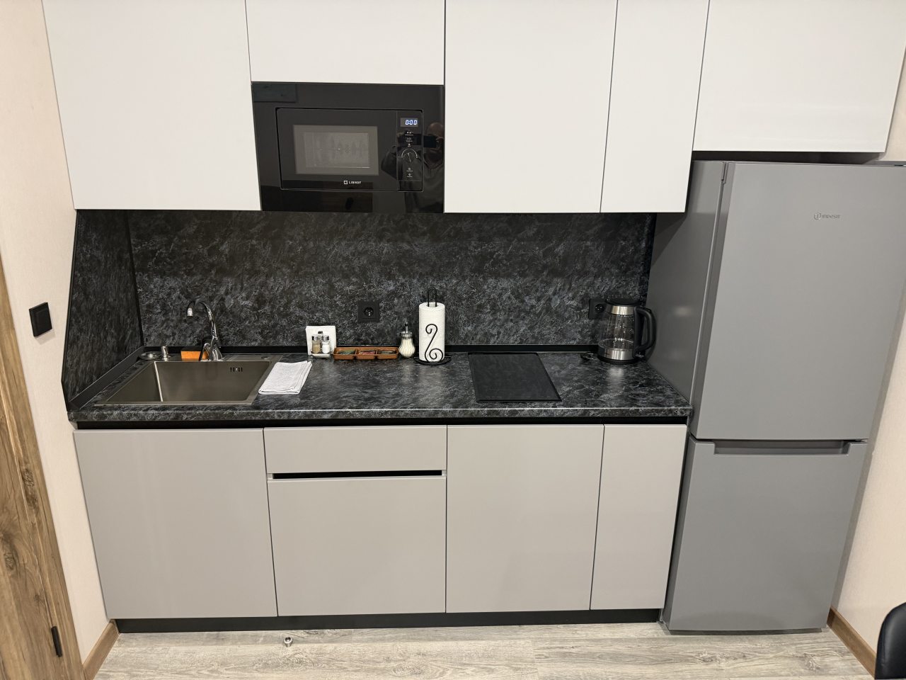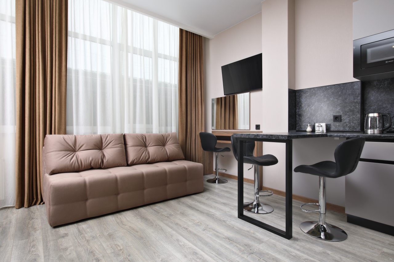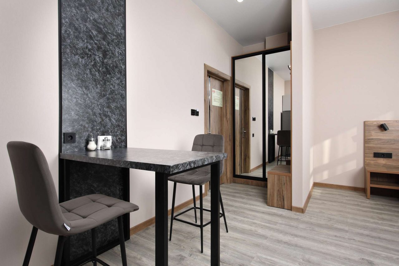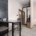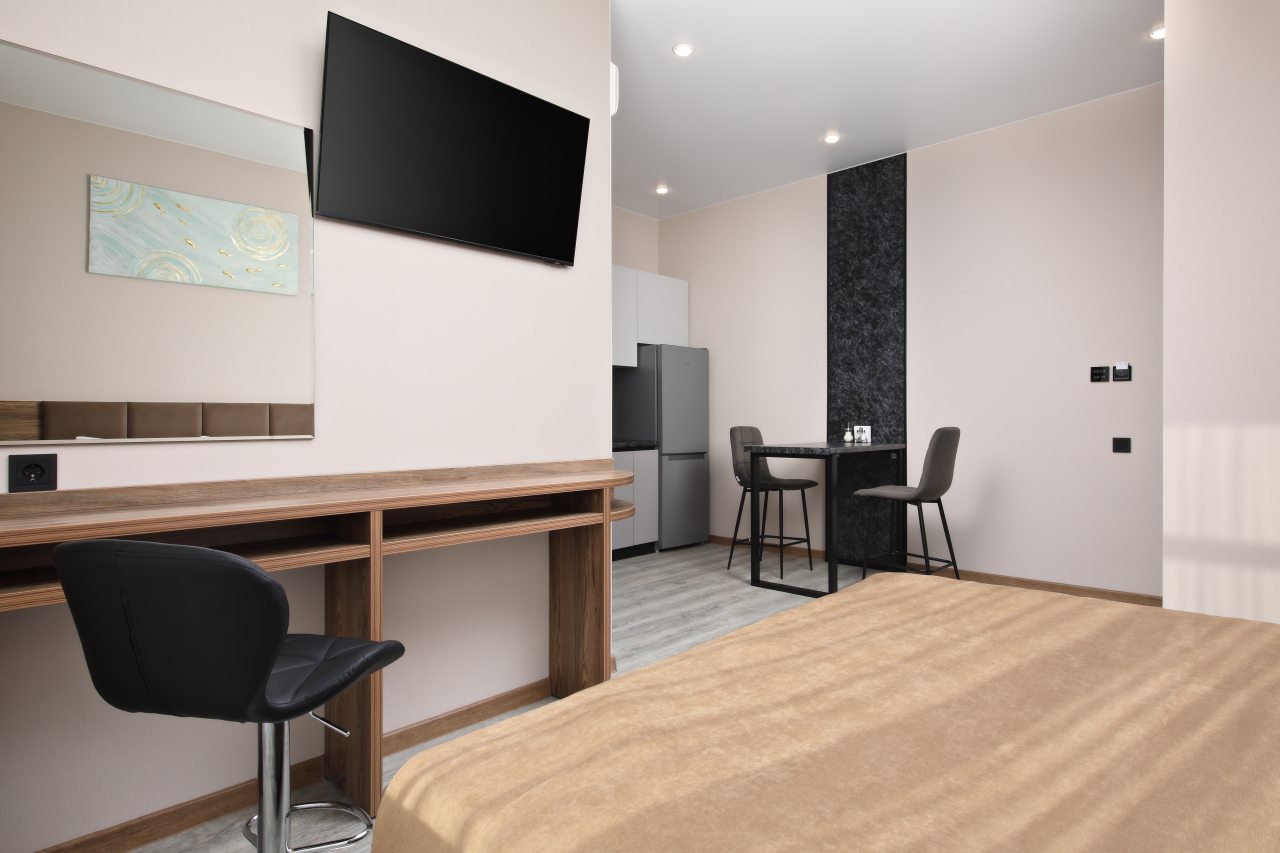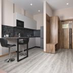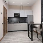 В номерах имеются кухонная и обеденная зоны, которые оснащены гарнитуром, бытовой техникой и столовыми приборами для приготовления еды.
