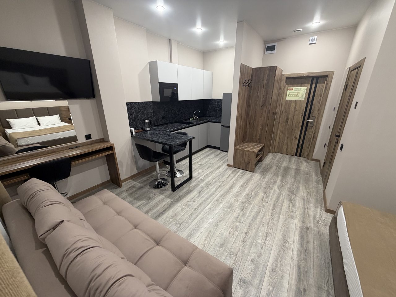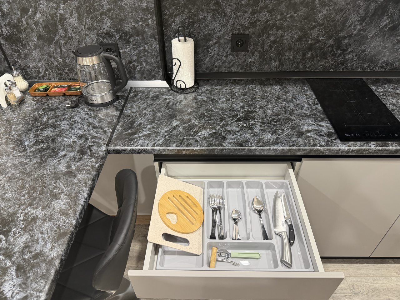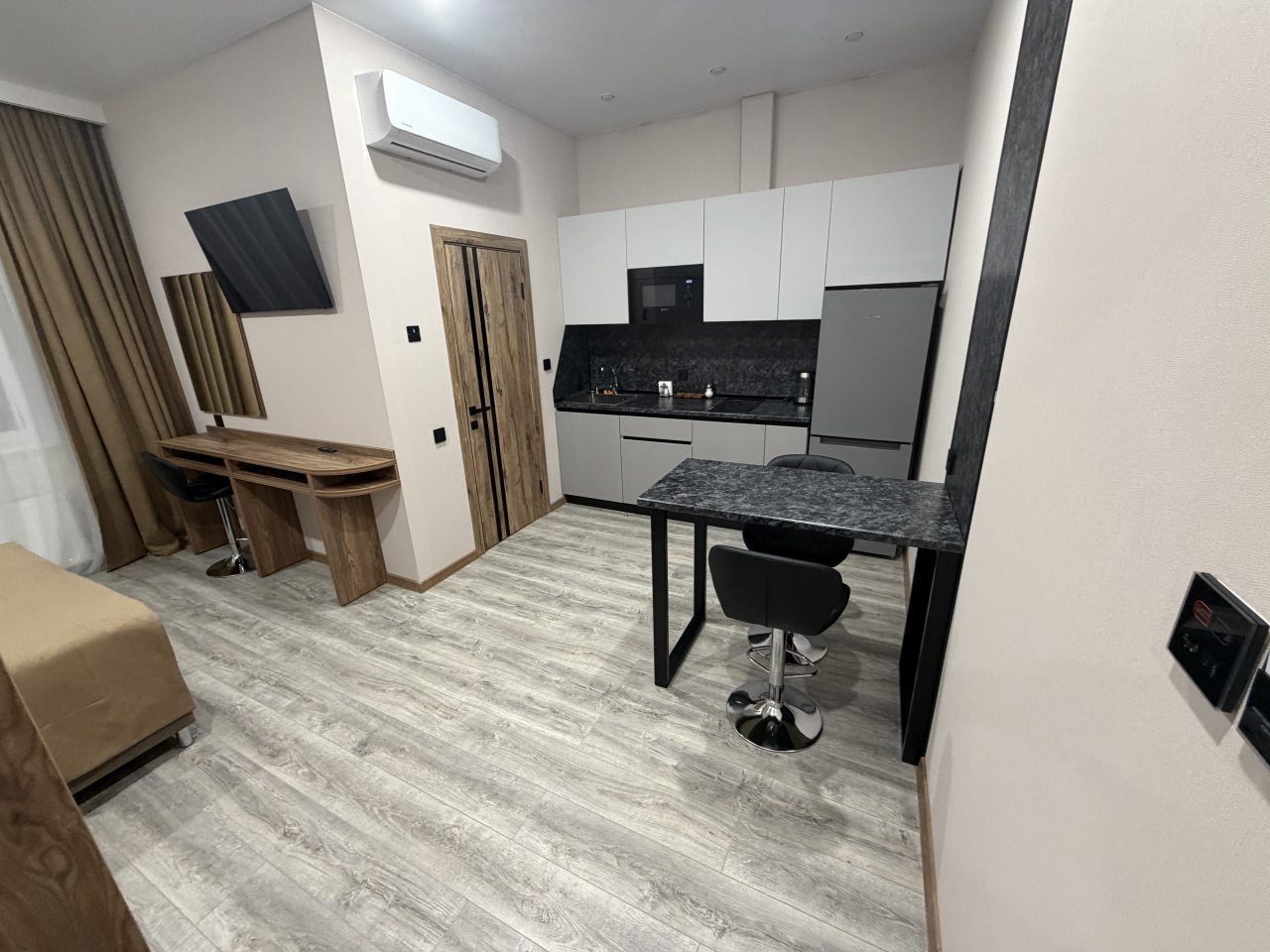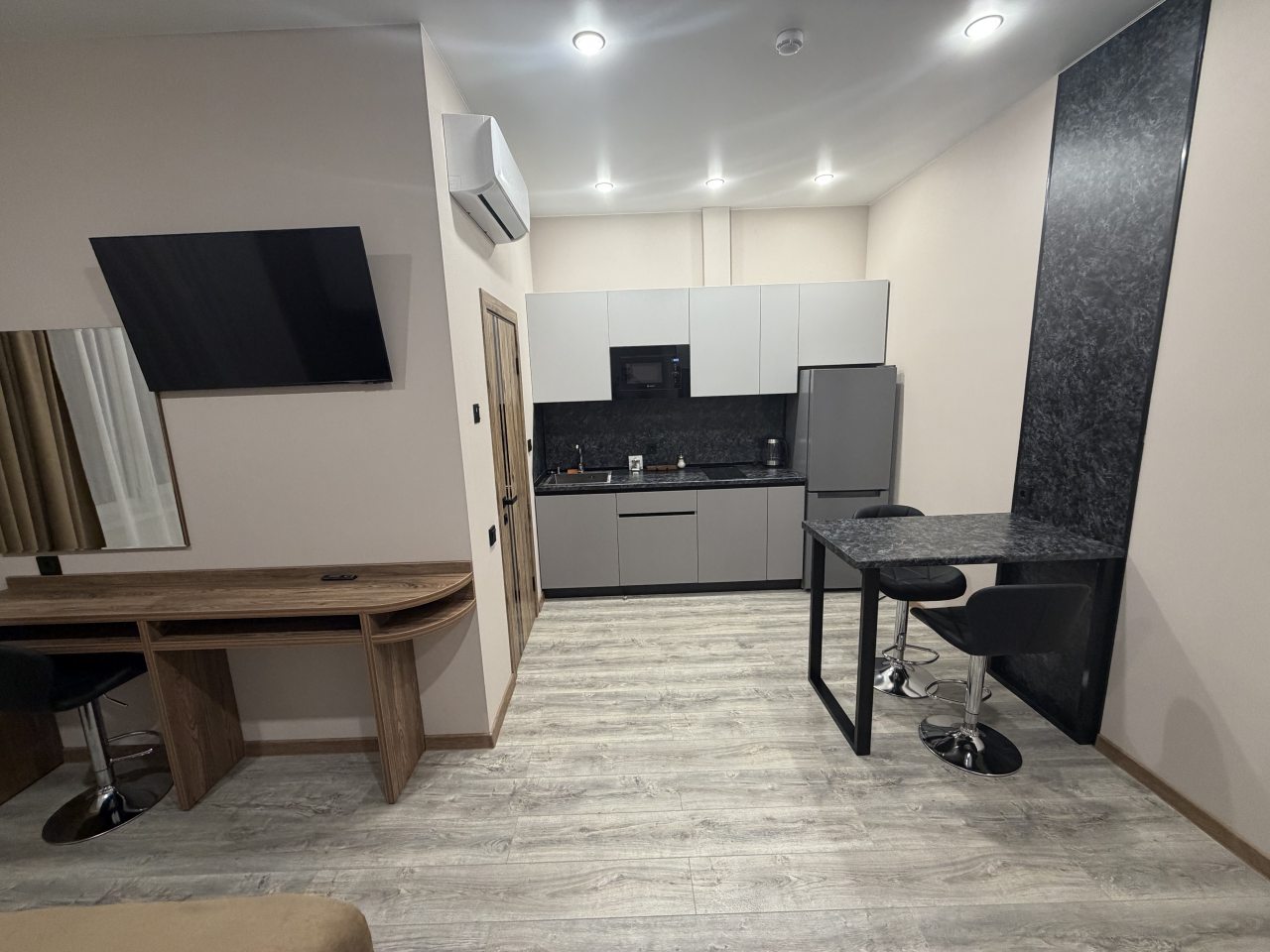 В номерах имеются кухонная и обеденная зоны, которые оснащены гарнитуром, бытовой техникой и столовыми приборами для приготовления еды.