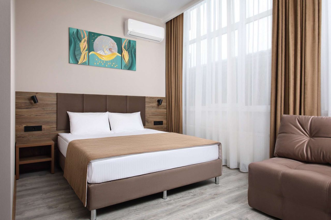 Гости могут расположиться в уютных номерах, которые располагают всем необходимым для комфортного проживания. В наличии: спальные места, телевизор, кондиционер, рабочее место, ванная комната со стиральной машиной. Доступны общая гладильная зона, Wi-Fi.