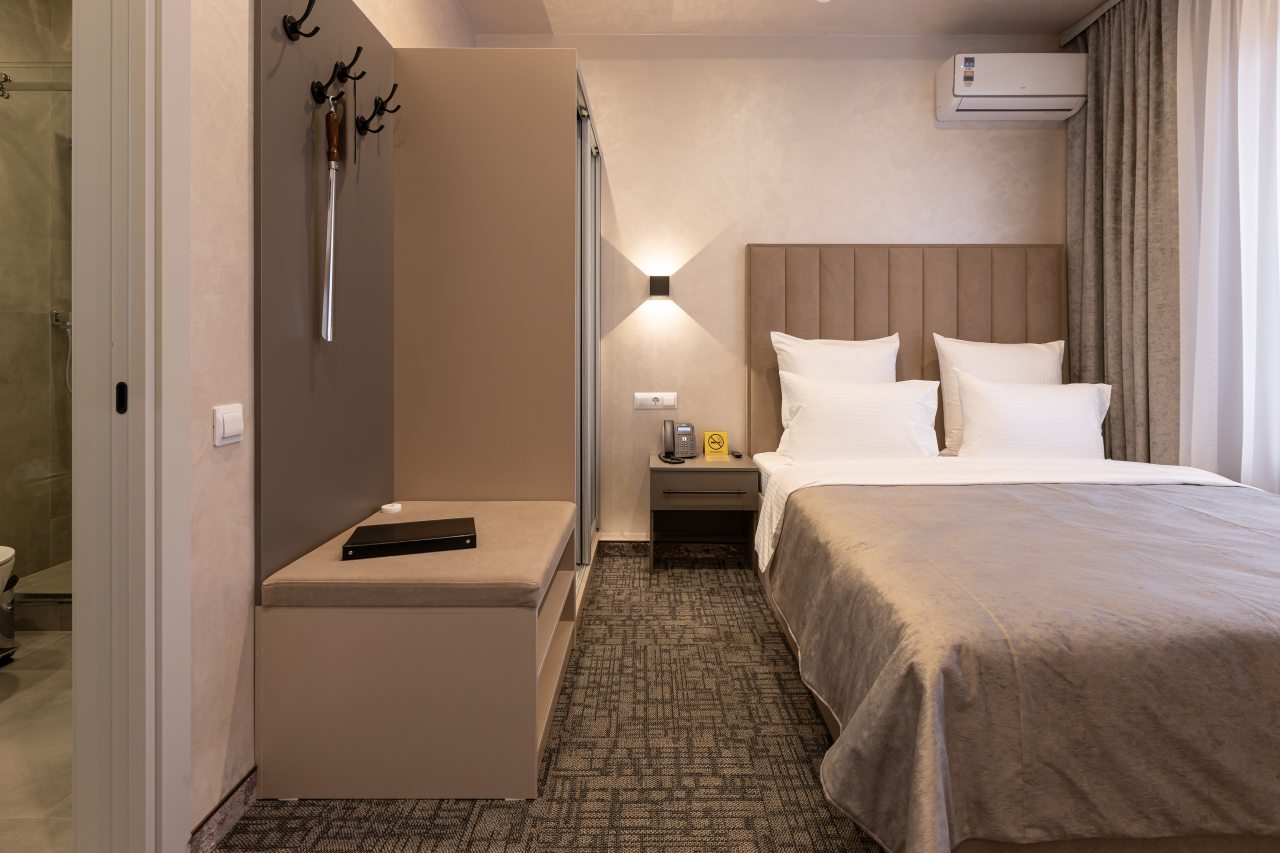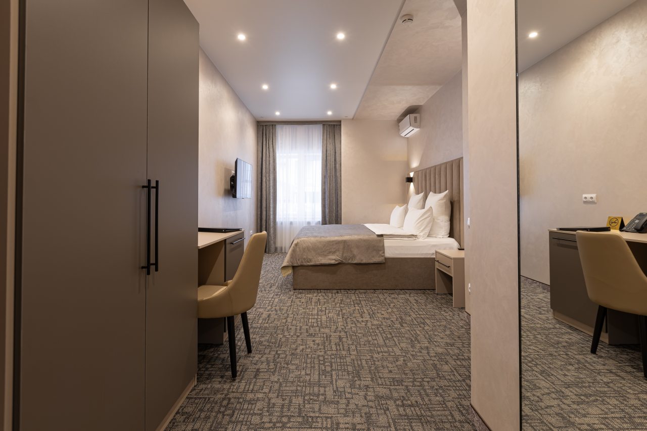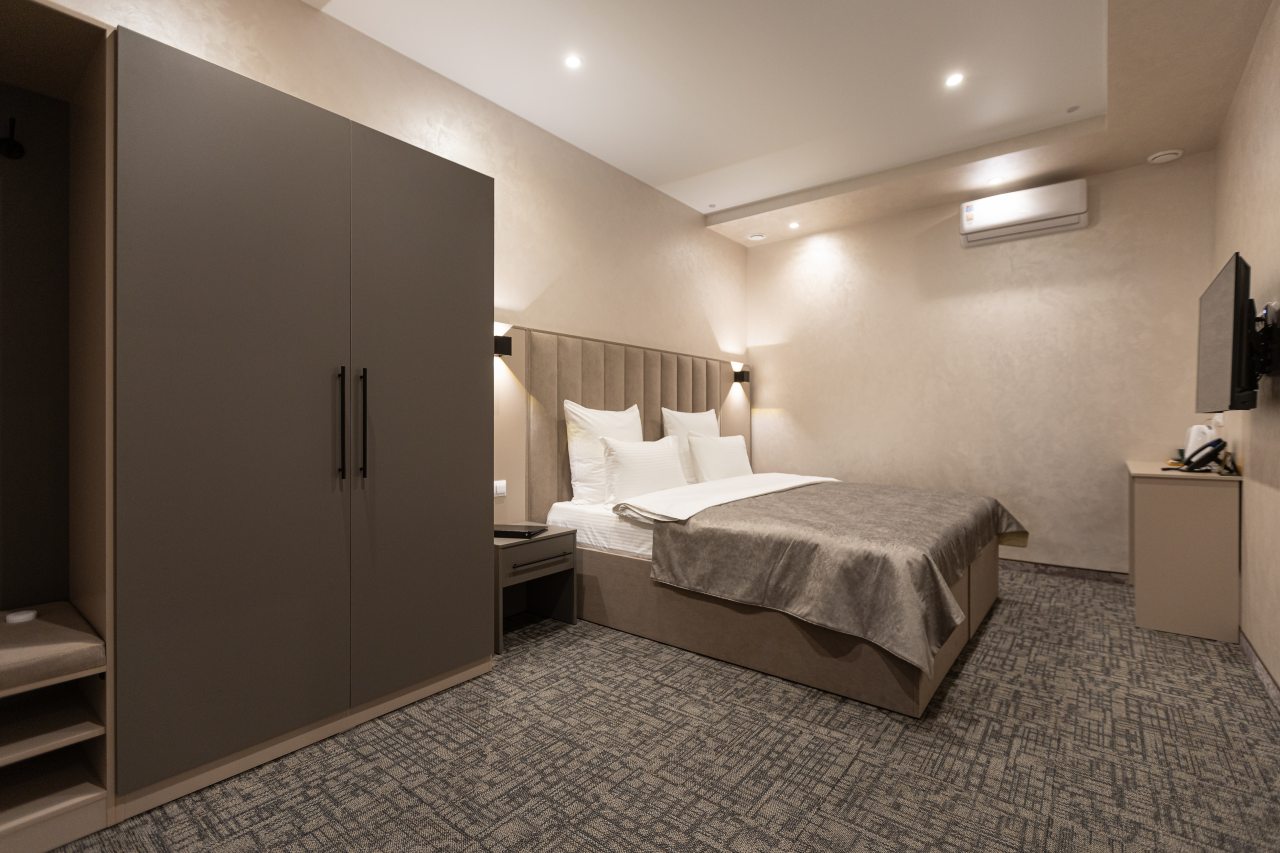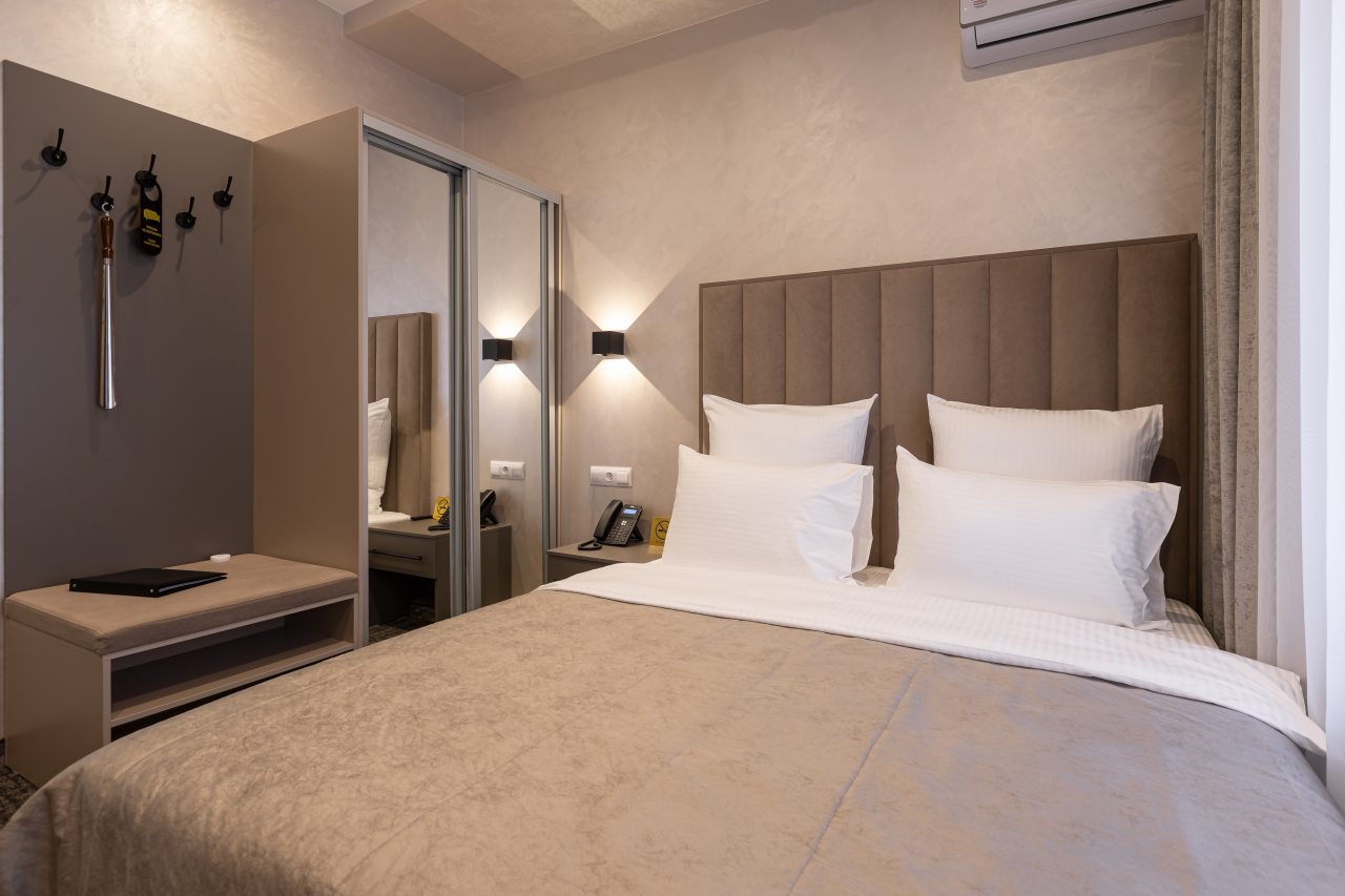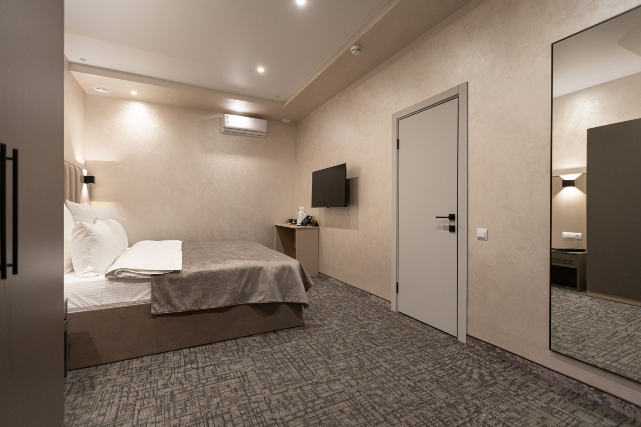 Для выбора представляются номера разнообразных категорий, в каждой из которых вас ожидает качественная и современная мебель и техника, в том числе удобная кровать, прикроватные светильники и розетки, вместительный шкаф, кондиционер, бесплатный Wi-Fi, телевизор, а также индивидуальный санузел с душевой.