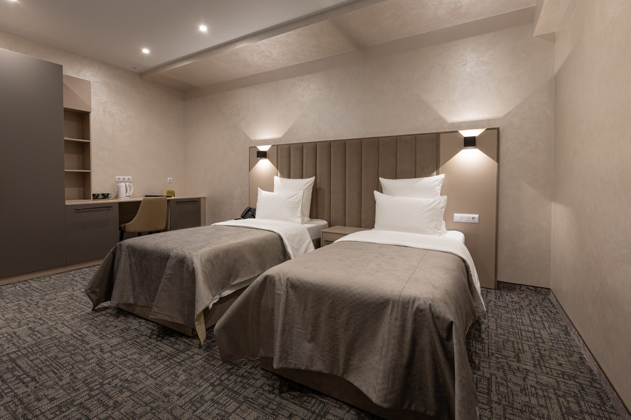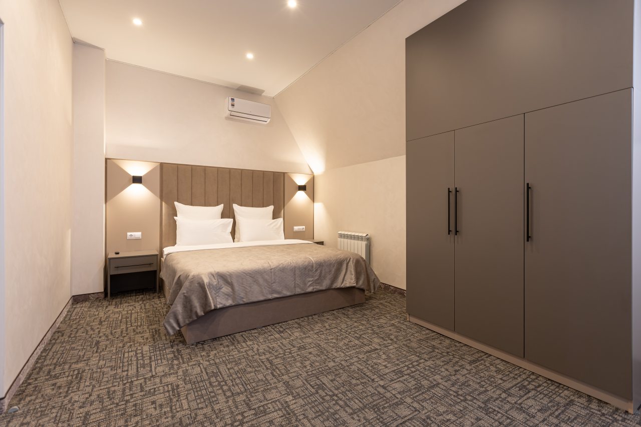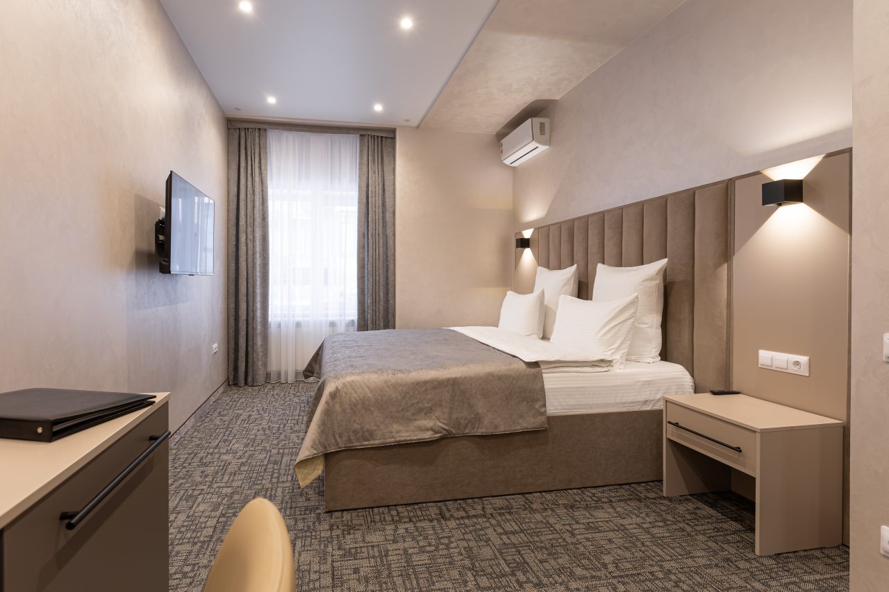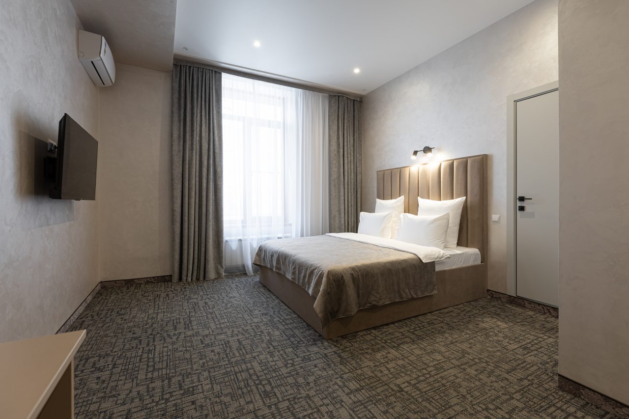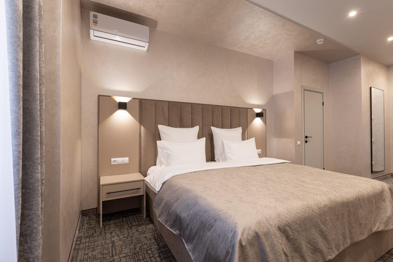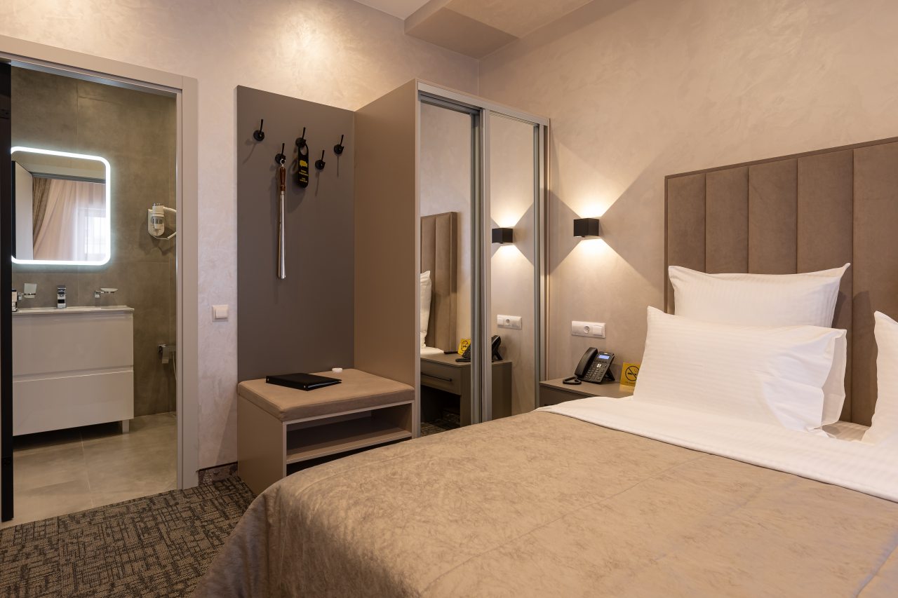Для выбора представляются номера разнообразных категорий, в каждой из которых вас ожидает качественная и современная мебель и техника, в том числе удобная кровать, прикроватные светильники и розетки, вместительный шкаф, кондиционер, бесплатный Wi-Fi, телевизор, а также индивидуальный санузел с душевой.