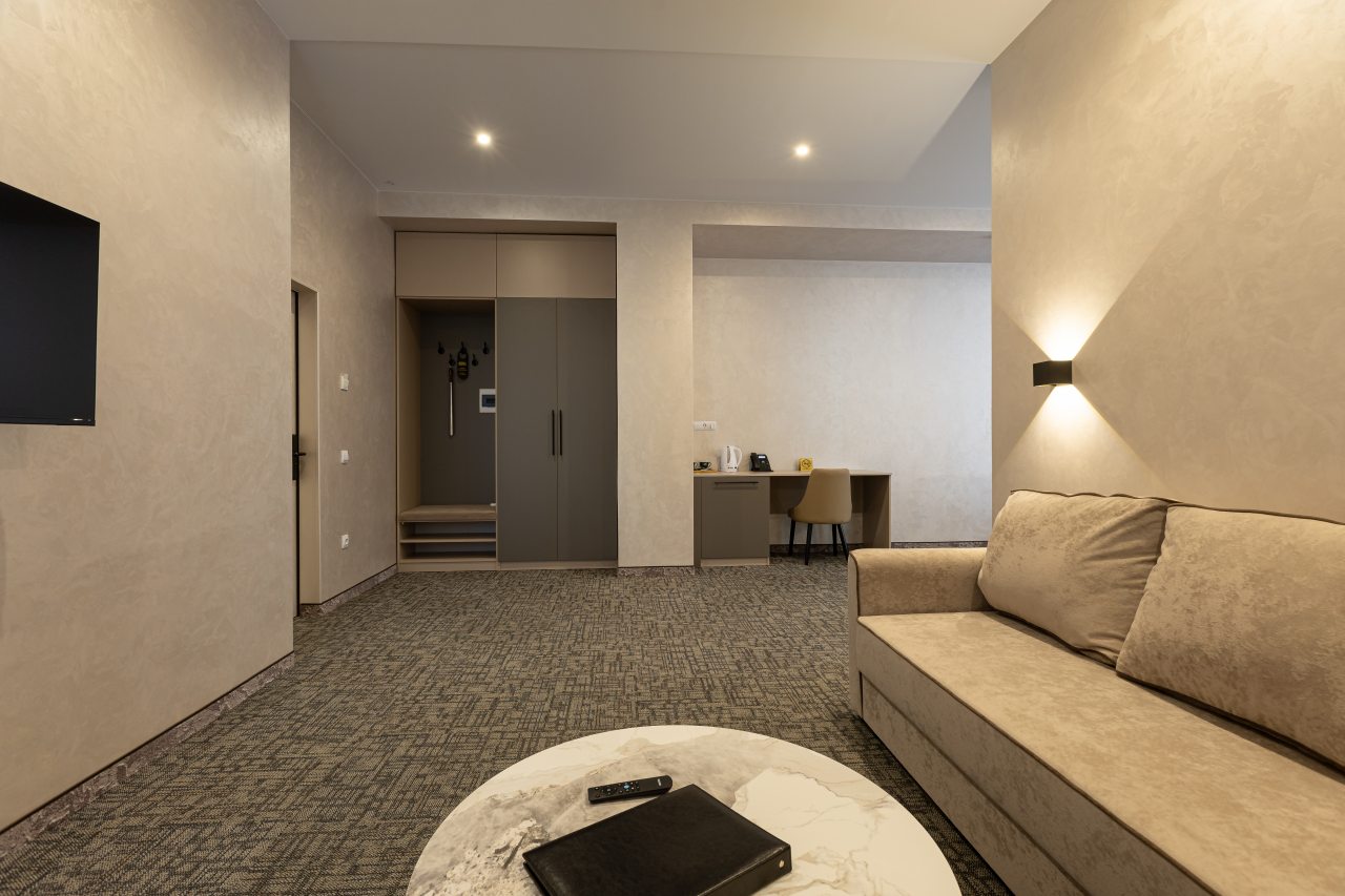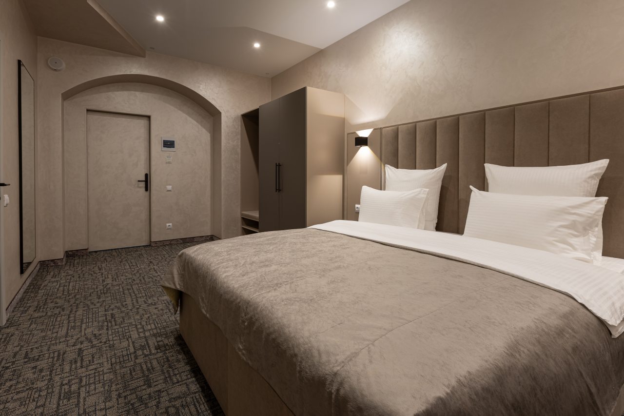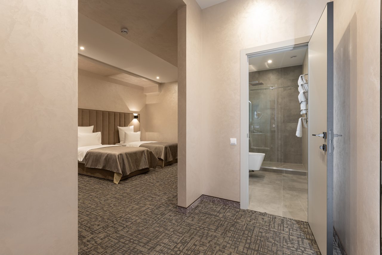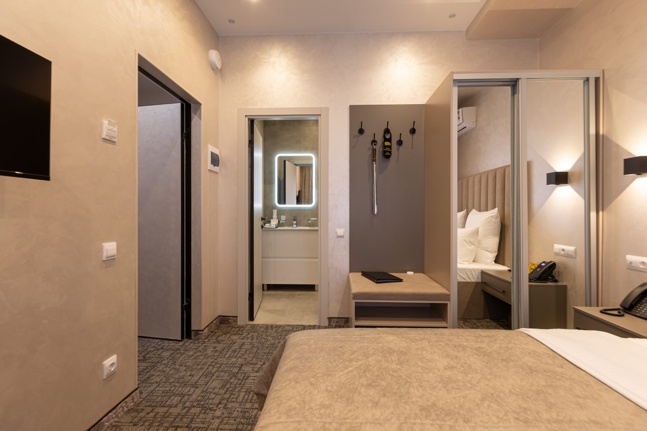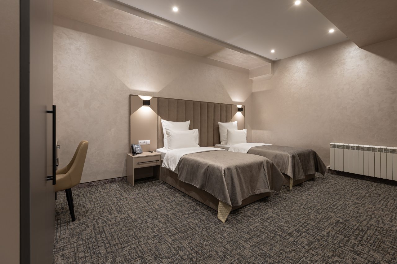 Для выбора представляются номера разнообразных категорий, в каждой из которых вас ожидает качественная и современная мебель и техника, в том числе удобная кровать, прикроватные светильники и розетки, вместительный шкаф, кондиционер, бесплатный Wi-Fi, телевизор, а также индивидуальный санузел с душевой.