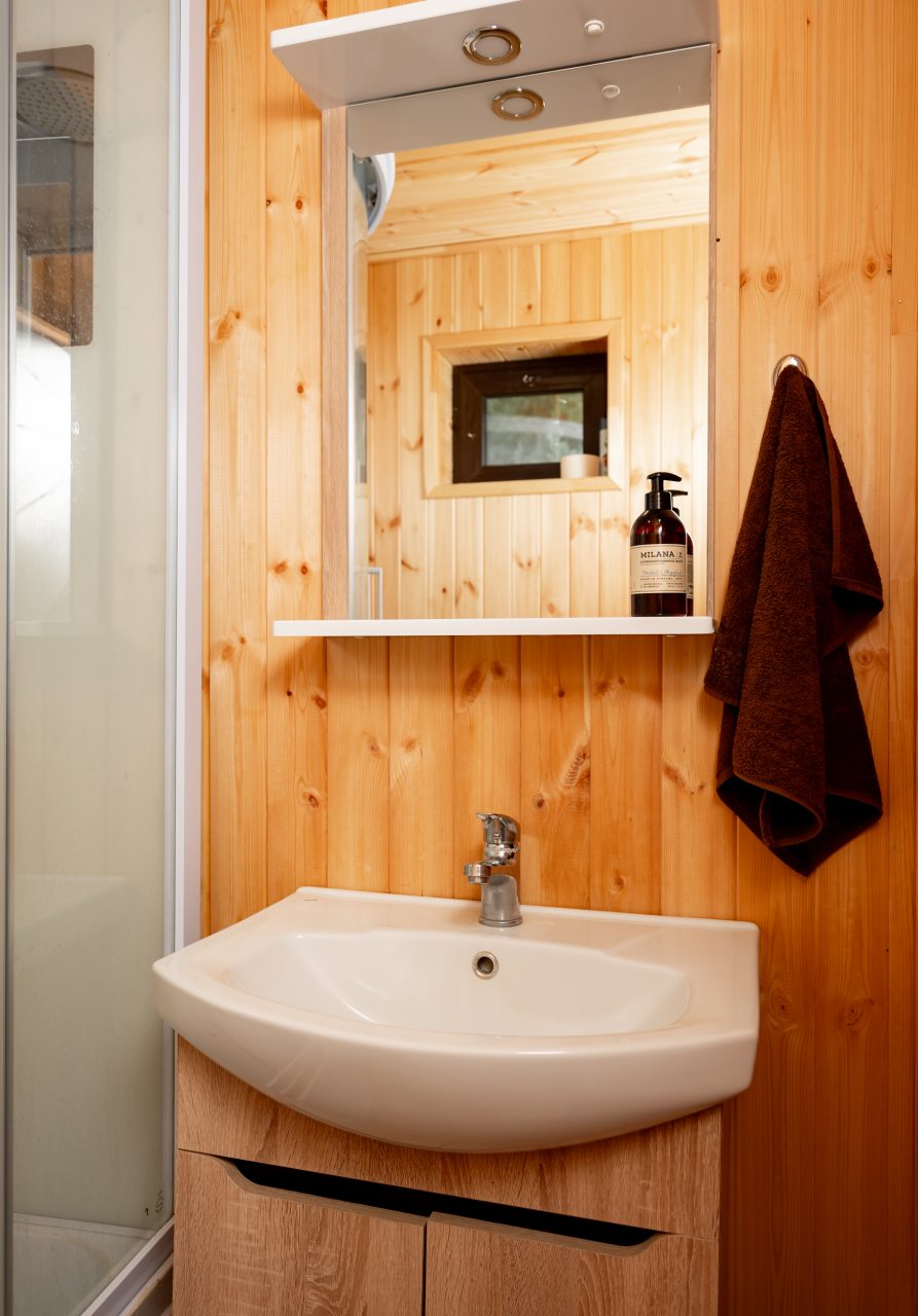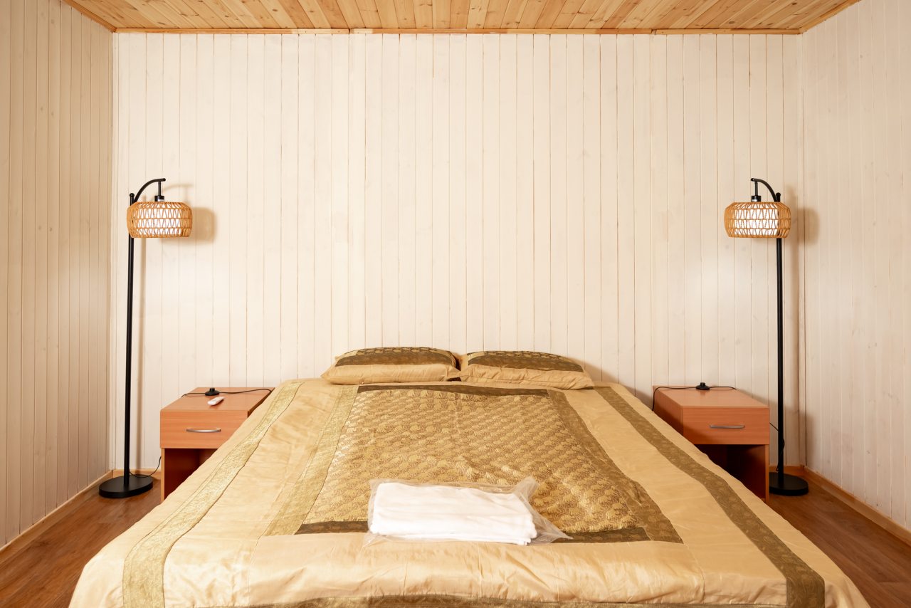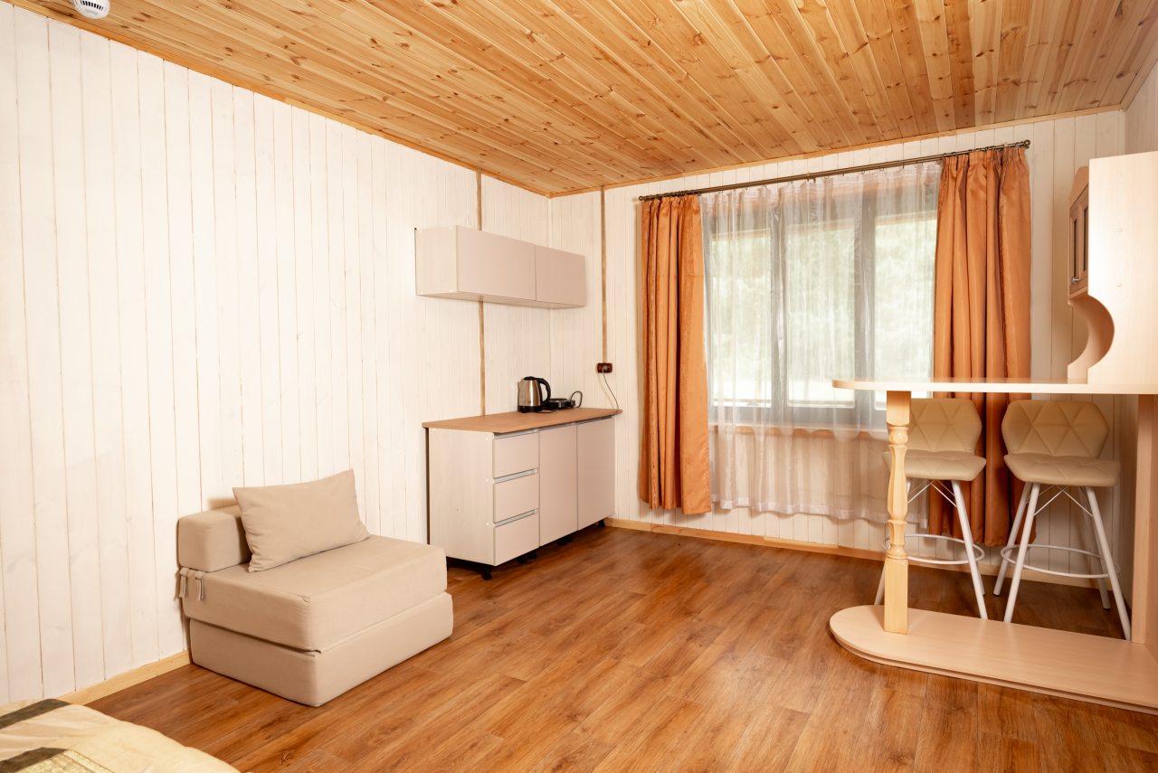 К размещению предлагаются уютные коттеджи из дерева с мебелью, телевизором и интернетом, а также своей ванной комнатой. Окружение леса и тишины позволит расслабиться и отдохнуть от городского шума, наслаждаясь красотой местной природы.