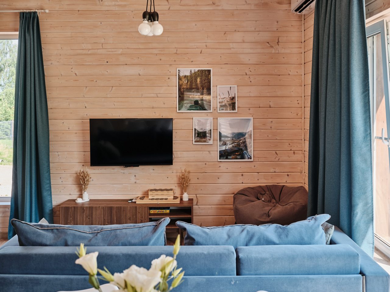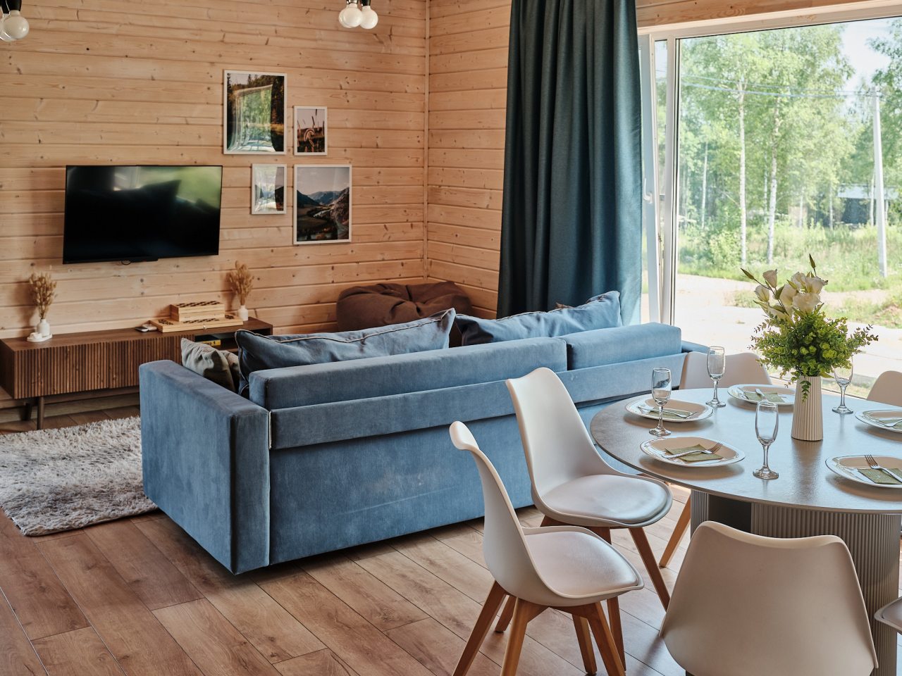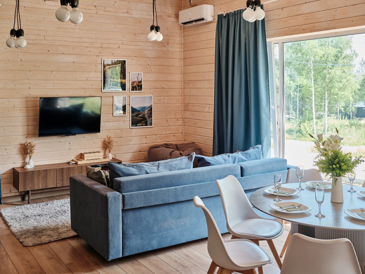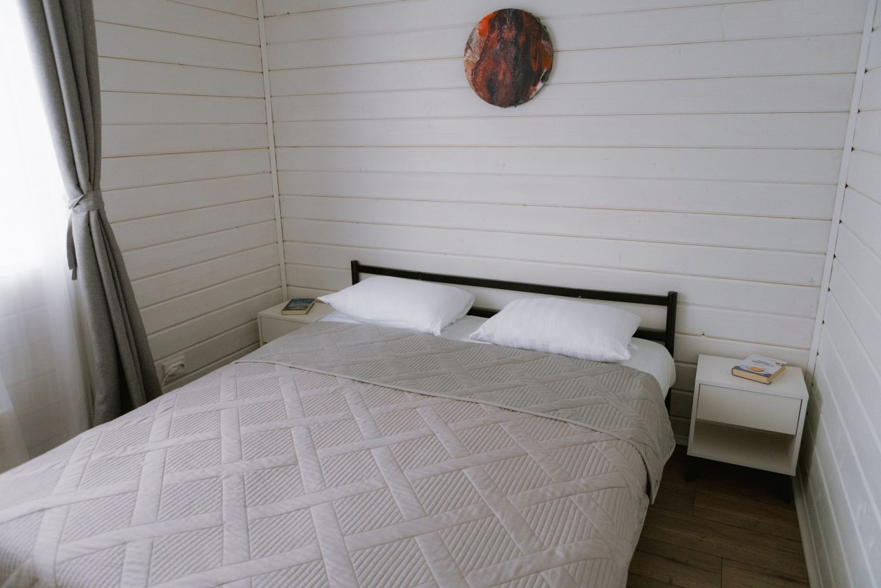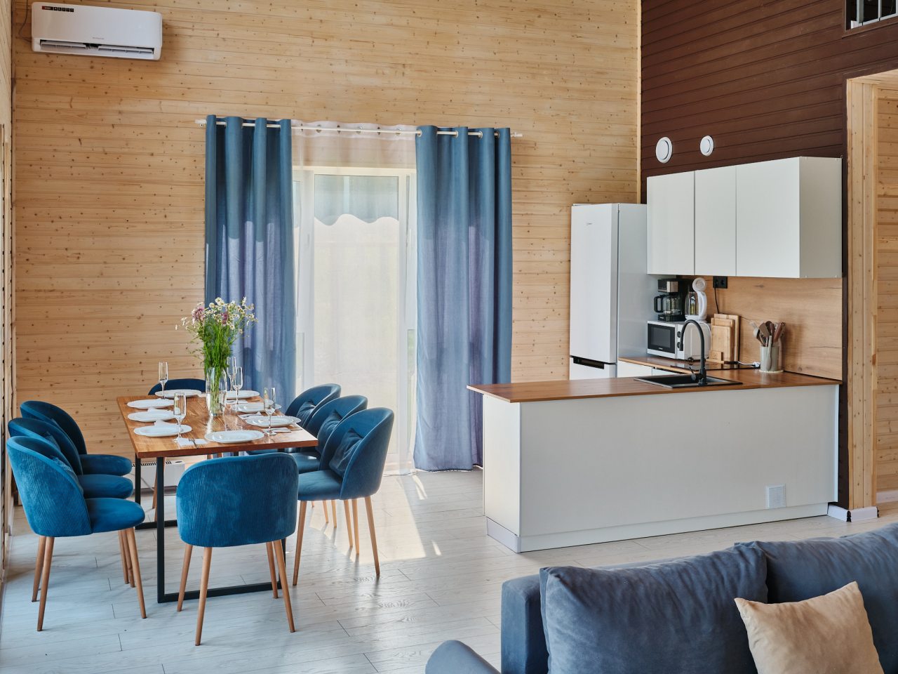 Предлагаемые коттеджи с тремя спальнями, террасой и просторной гостиной-кухней, оснащены комфортными спальными местами (до восьми мест включительно), мебелью, широким диваном, телевизором со Smart TV с сотнями лучших фильмов и сериалов, а также Wi-Fi для доступа к интернету. В ванной комнате есть стиральная машина, набор полотенец, фен и средства личной гигиены.