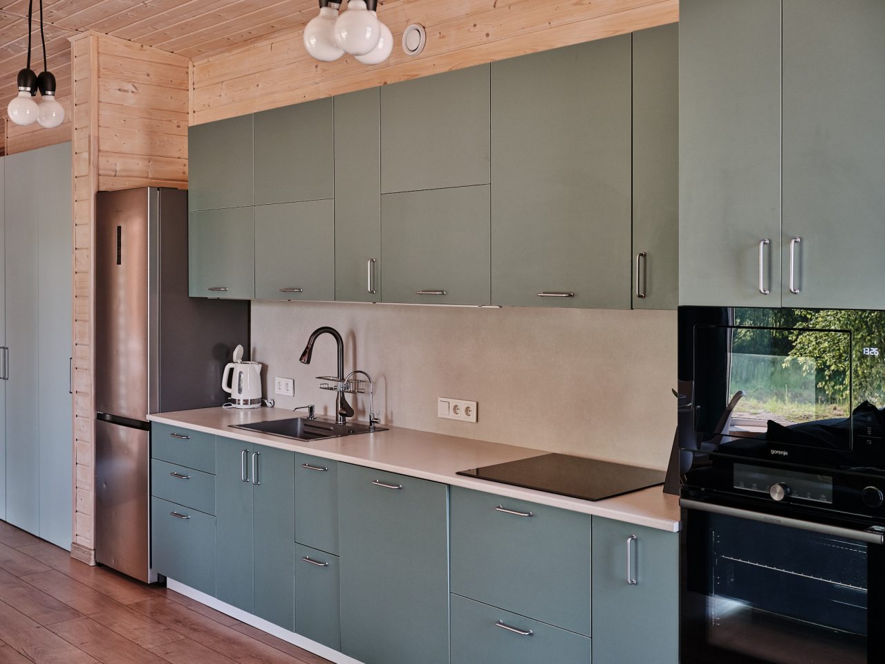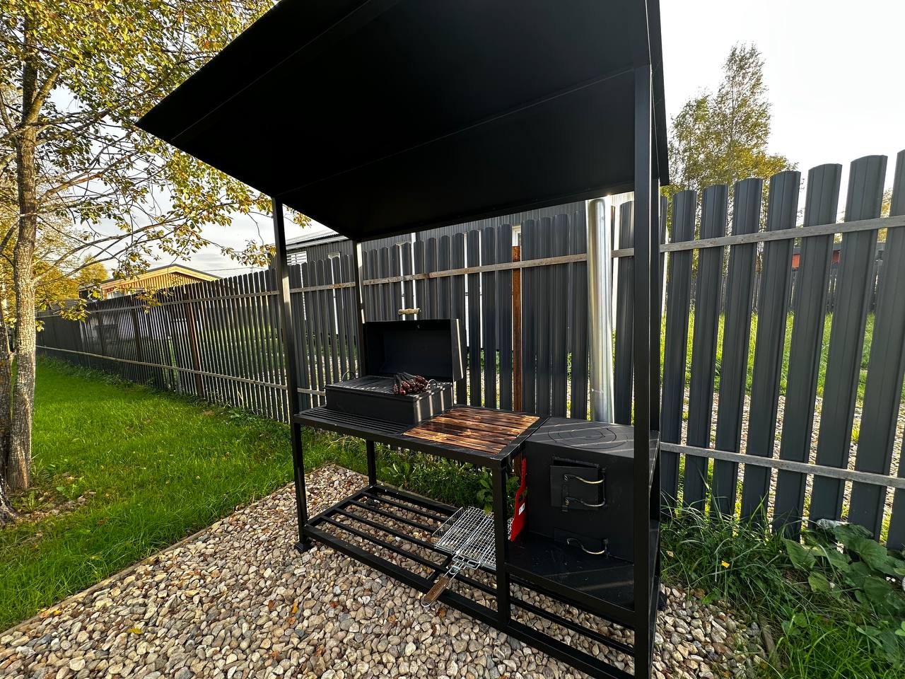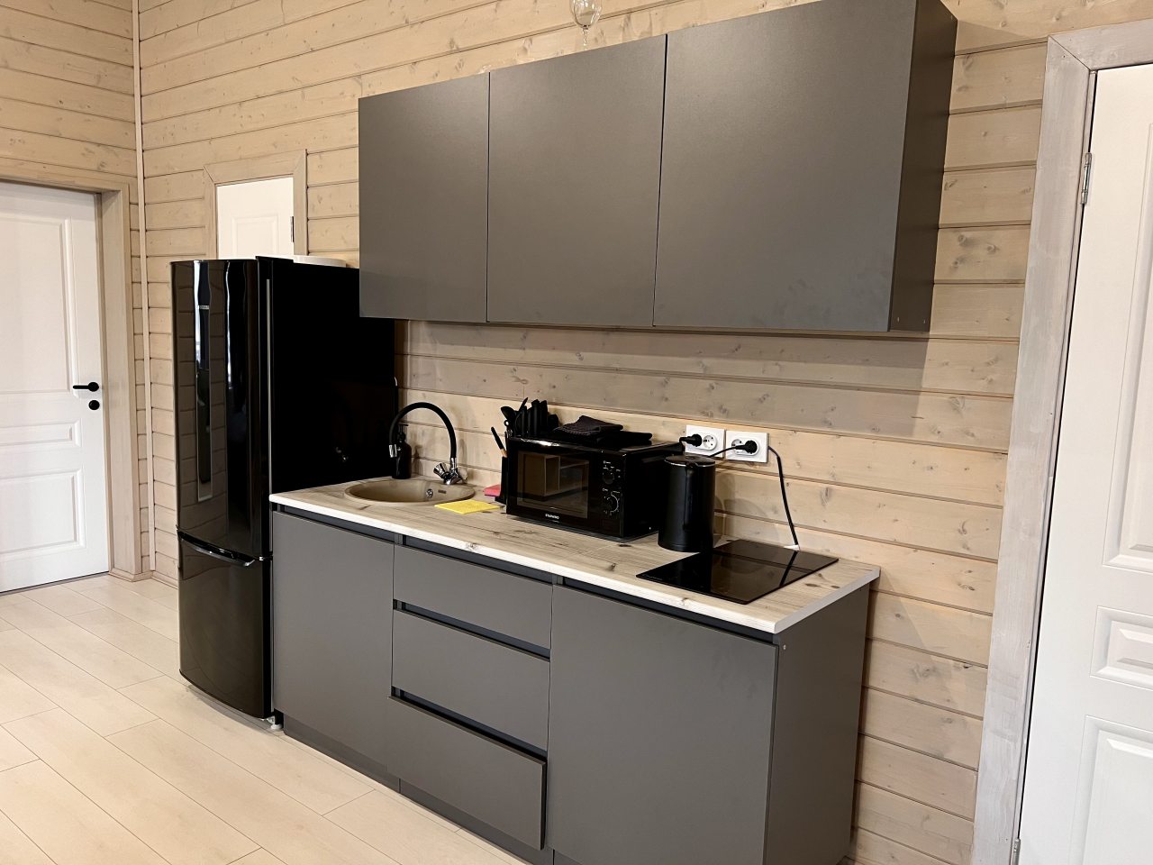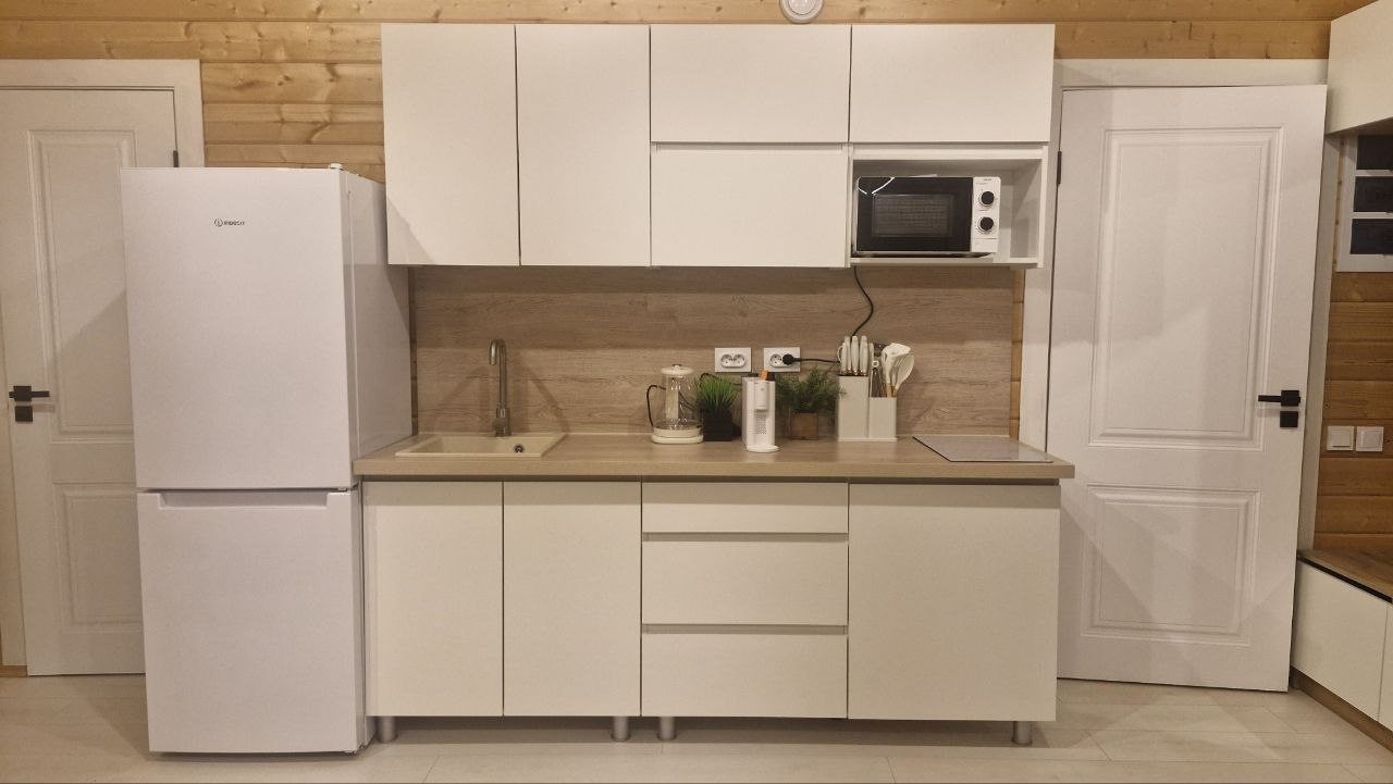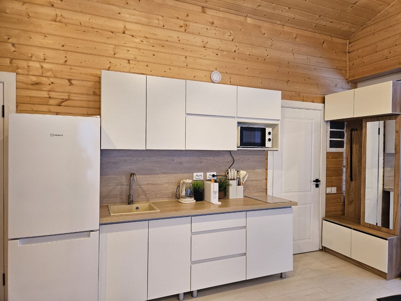 Кухня оборудована современной техникой и посудой: холодильником, плитой, посудой и большим обеденным столом, чтобы приготовление еды приносило только удовольствие. Также на территории дома большая оборудованная зона отдыха с мангалом.
