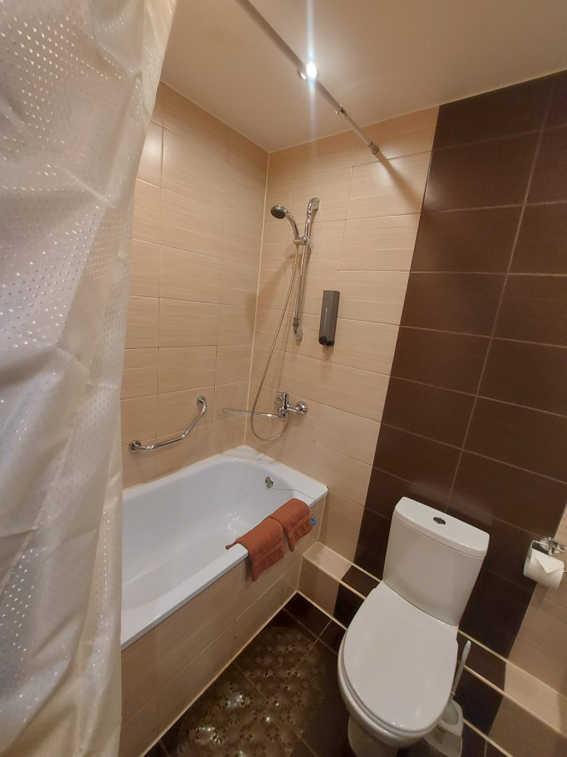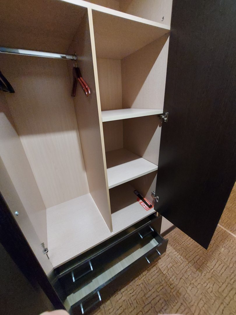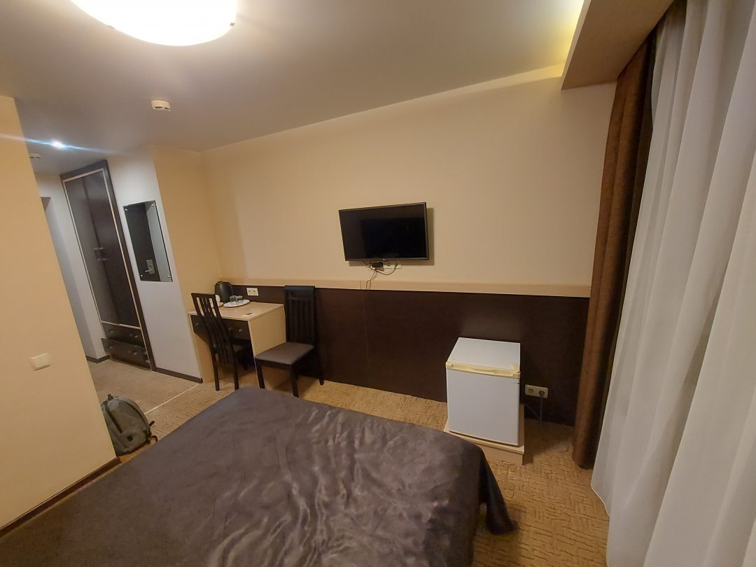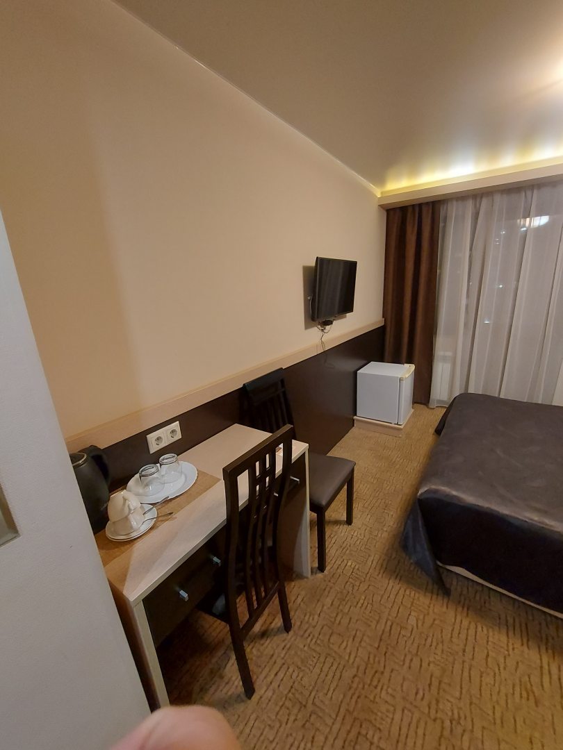 На несколько дней можно остановиться. В комнате : кровать), шкаф с зеркалом, холодильник, телевизор, стул, стол, над столом ещё зеркало. Чистые полотенца, маленькое мыло, лопатка для обуви.