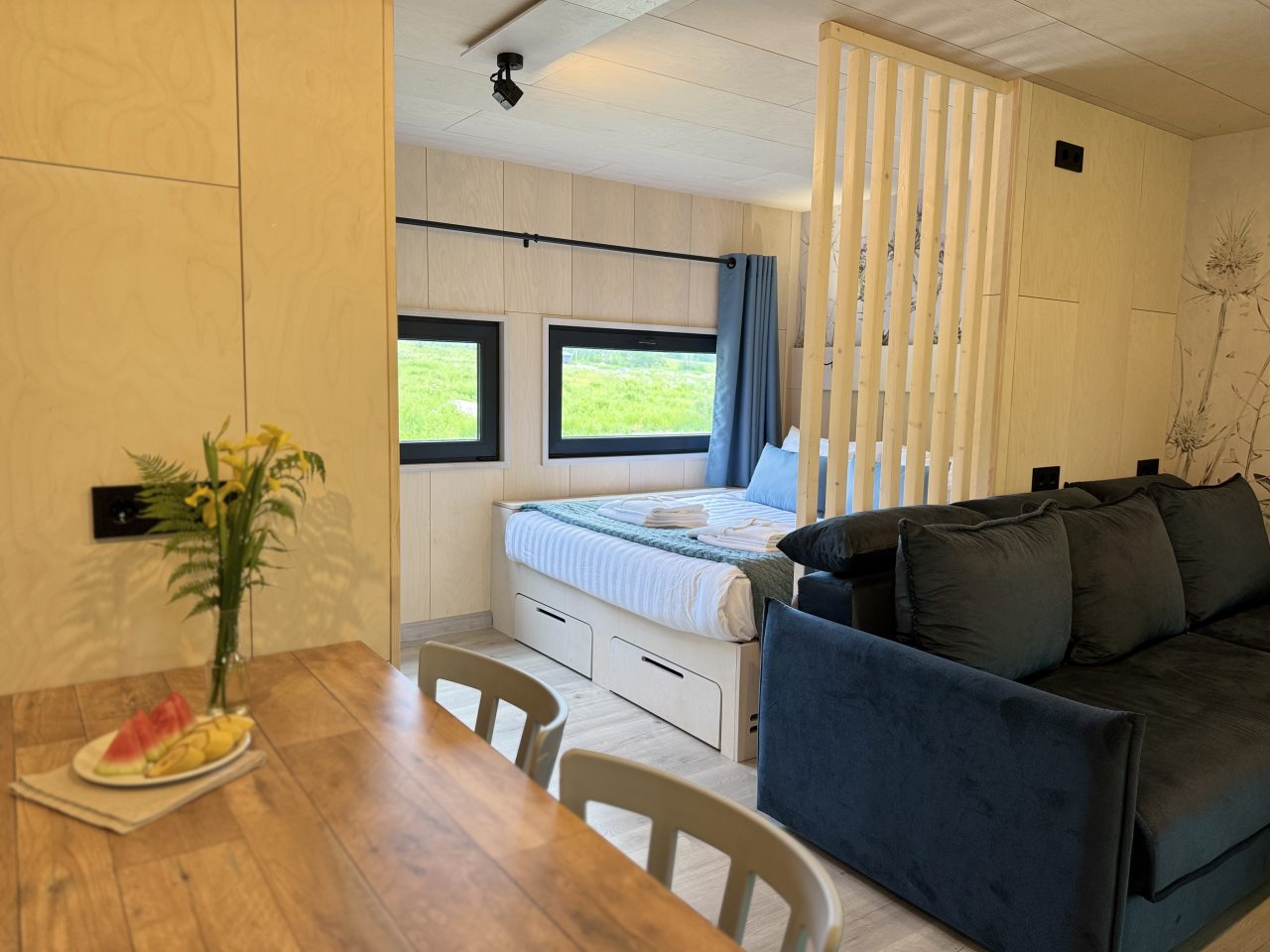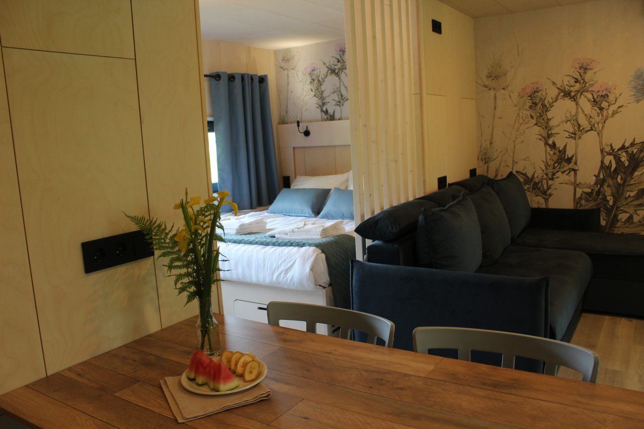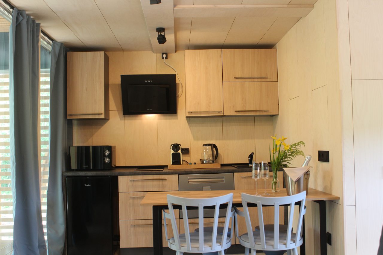 Некоторые домики имеют в своем оснащении кухонную зону. Каждая категория укомплектована чайной станцией для организации чаепитий и перекусов. В 0,8 км работает кафе, в котором можно пообедать.