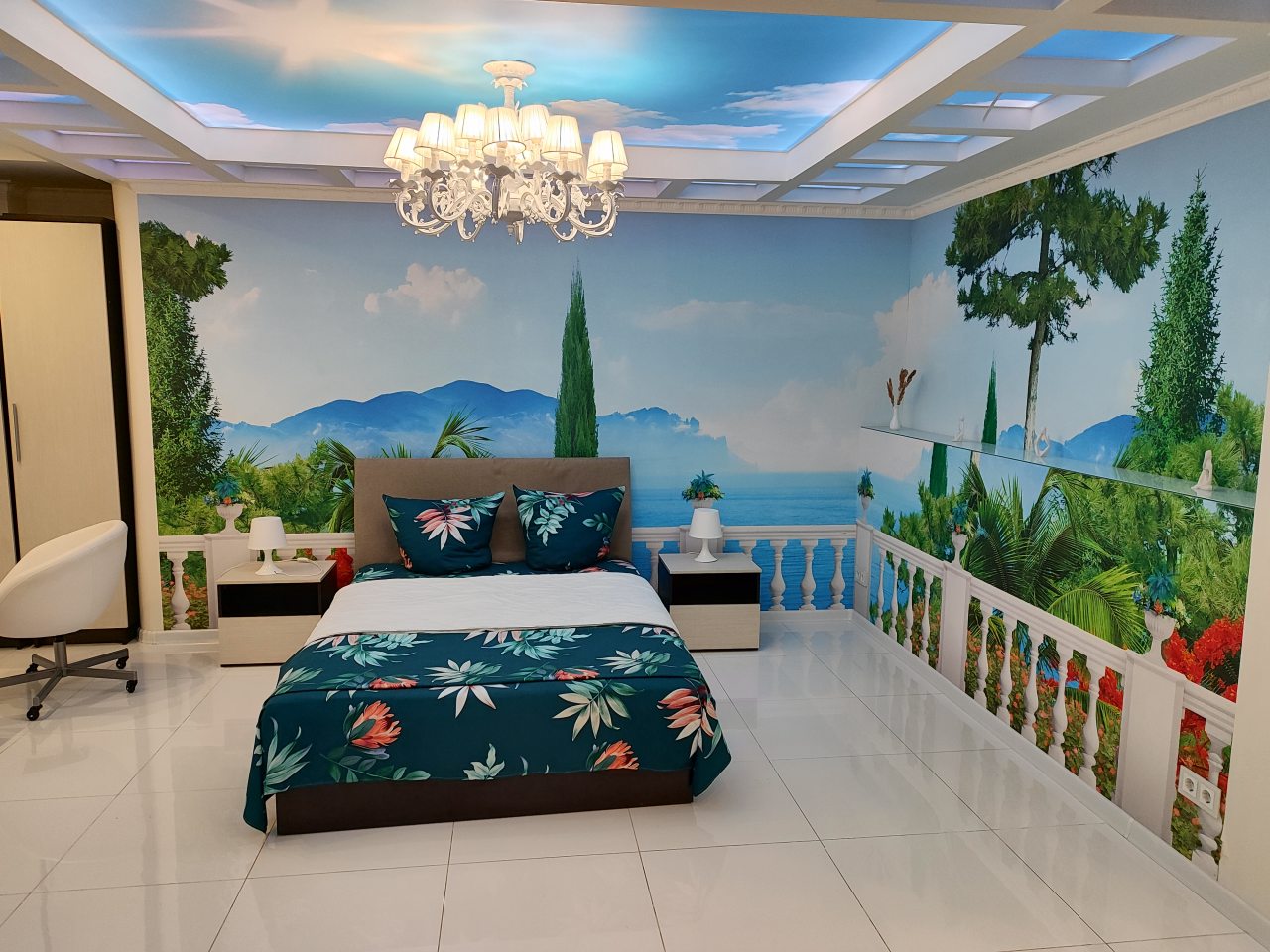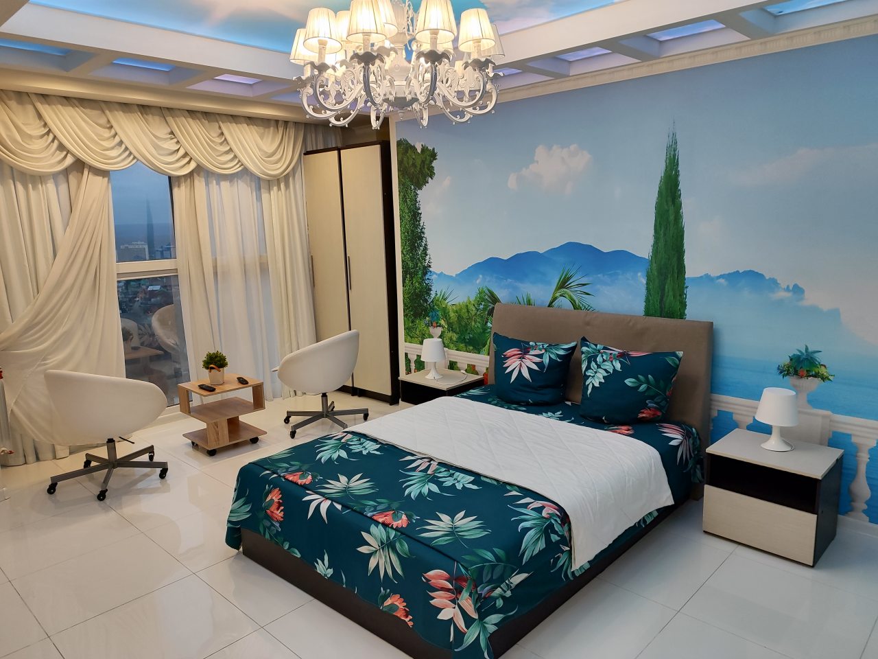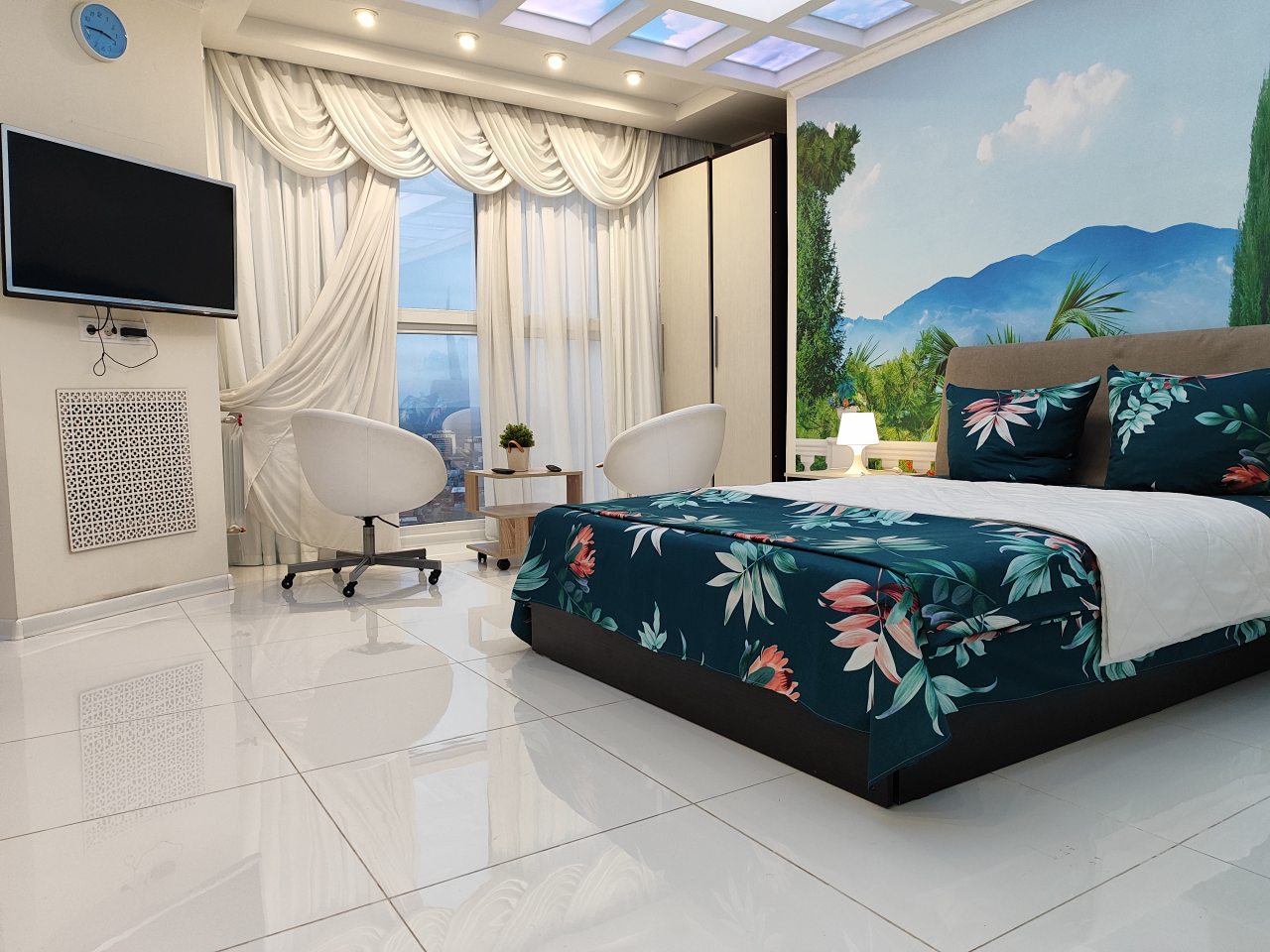 Для размещения предлагается просторная квартира, оснащённая всем необходимым для комфортного проживания: двуспальной кроватью со свежим бельём, прикроватными тумбочками, полкой для хранения различных вещей, шкафом, вешалкой, светильниками, телевизором для вечернего просмотра любимых фильмов. Бесплатный интернет поможет быть в курсе всех последних новостей и поддерживать связь по видео с родными и близкими. Санузел оснащён необходимой сантехникой, феном, освежителем воздуха, стиральной машиной, средствами гигиены, набором полотенец. Насладиться чашечкой кофе можно за столиком у окна с панорамным видом.