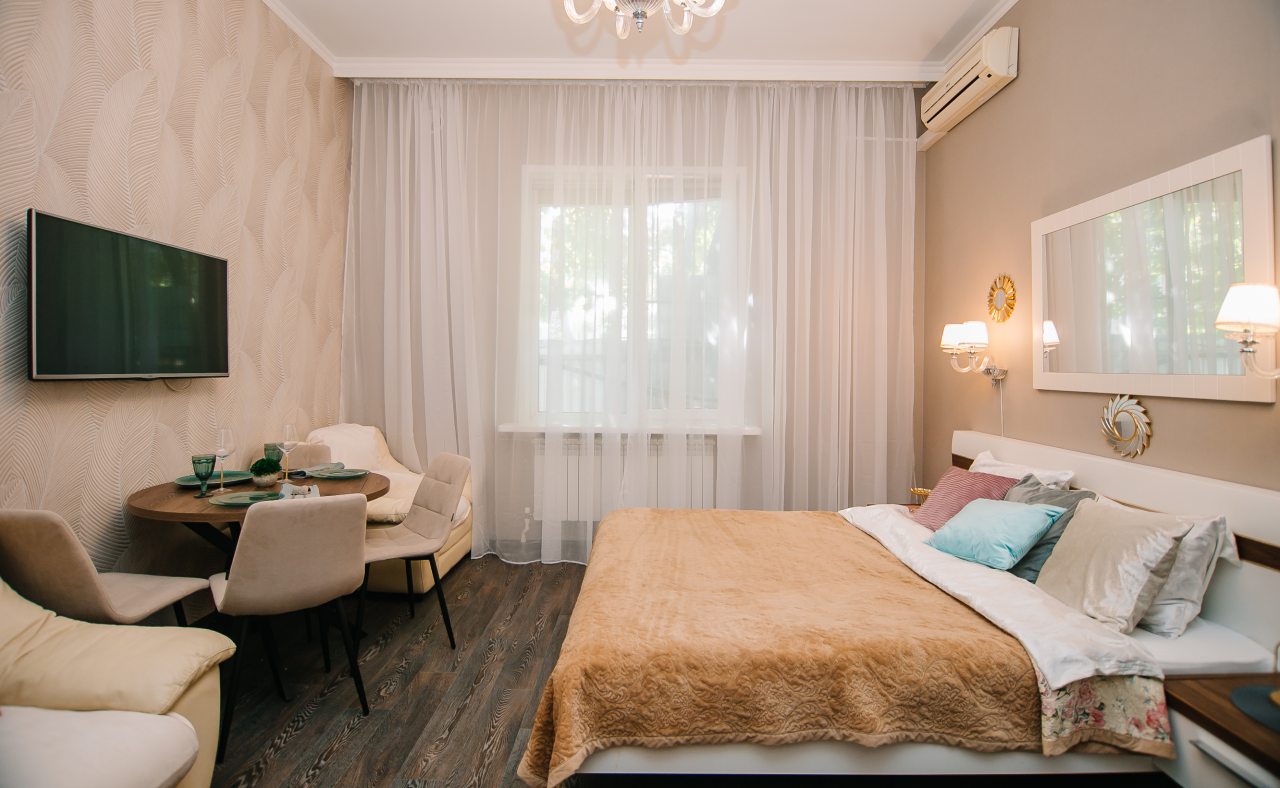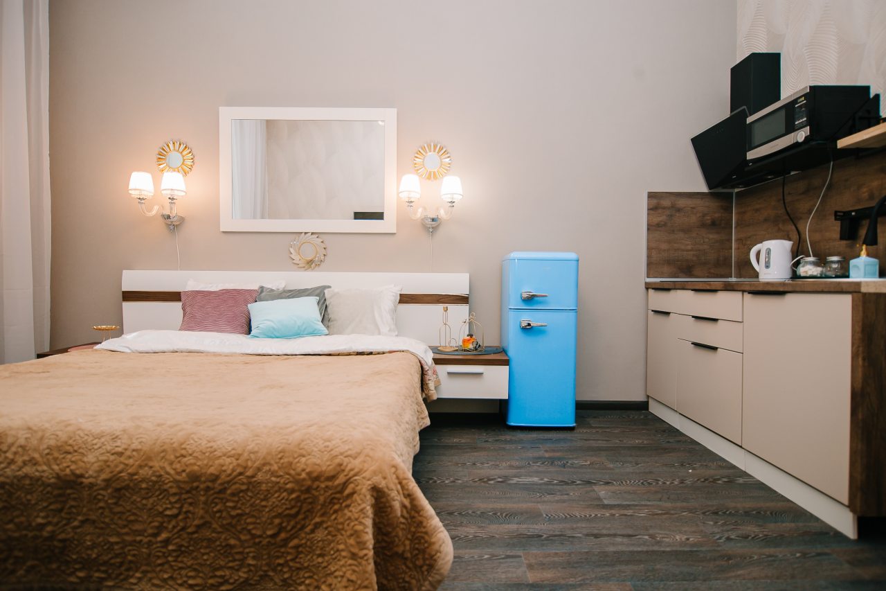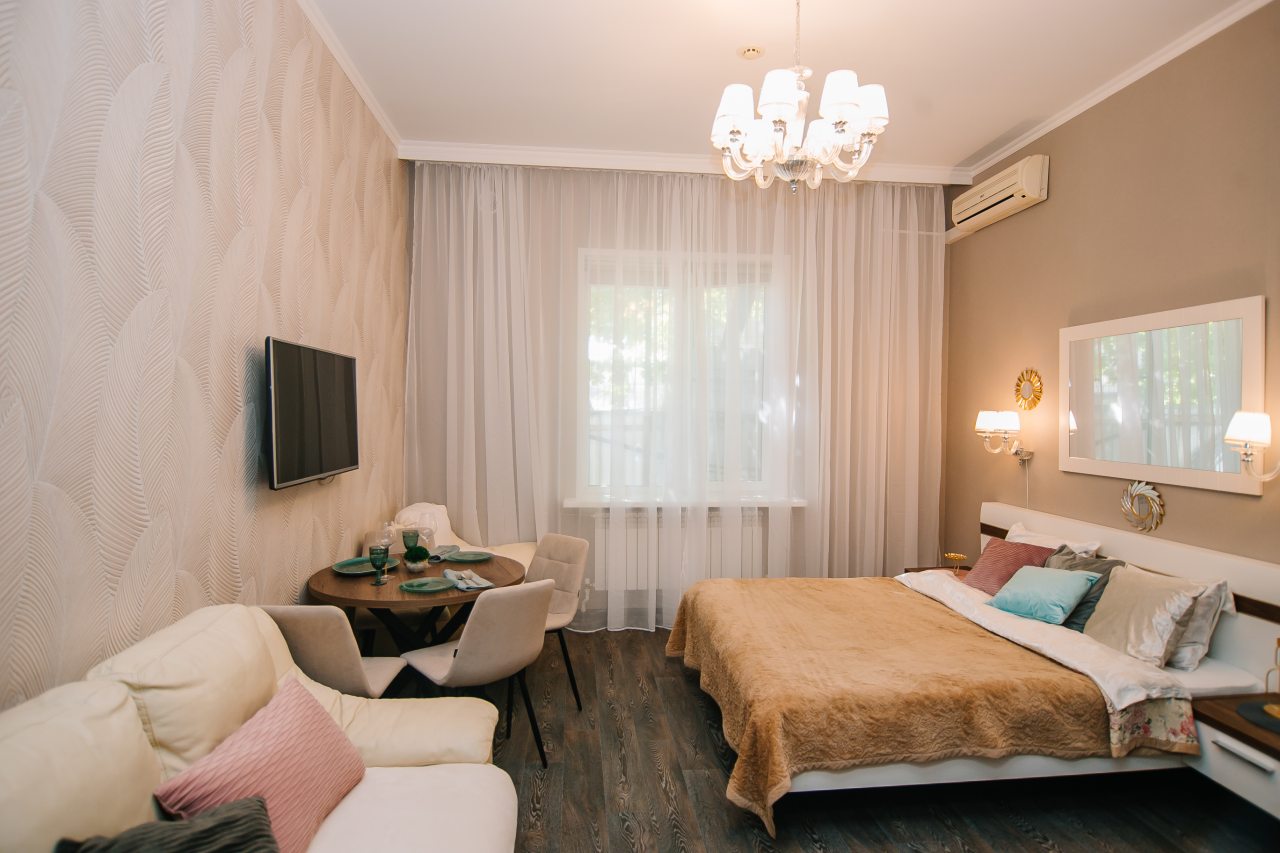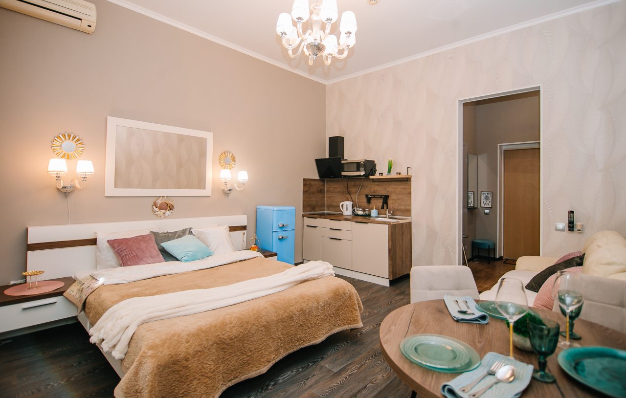 Доступно несколько апартаментов на выбор. В каждых вас ожидает удобная двуспальная кровать, диван с телевизором, различная мебель для хранения вещей, а также полноценная ванна с необходимой сантехникой.