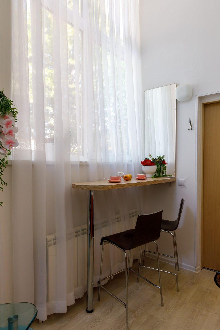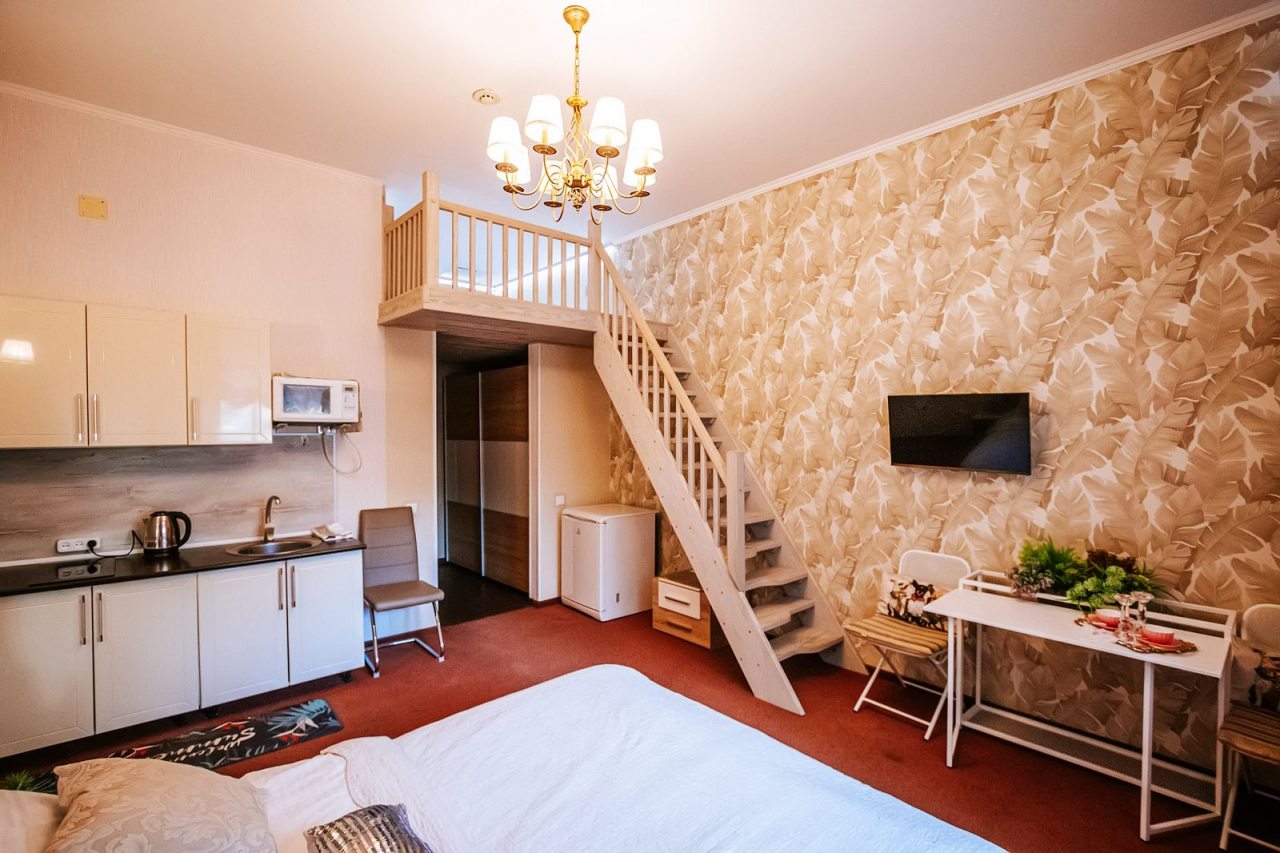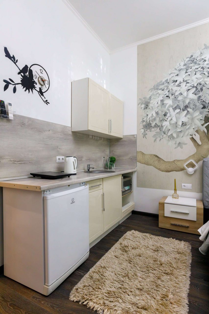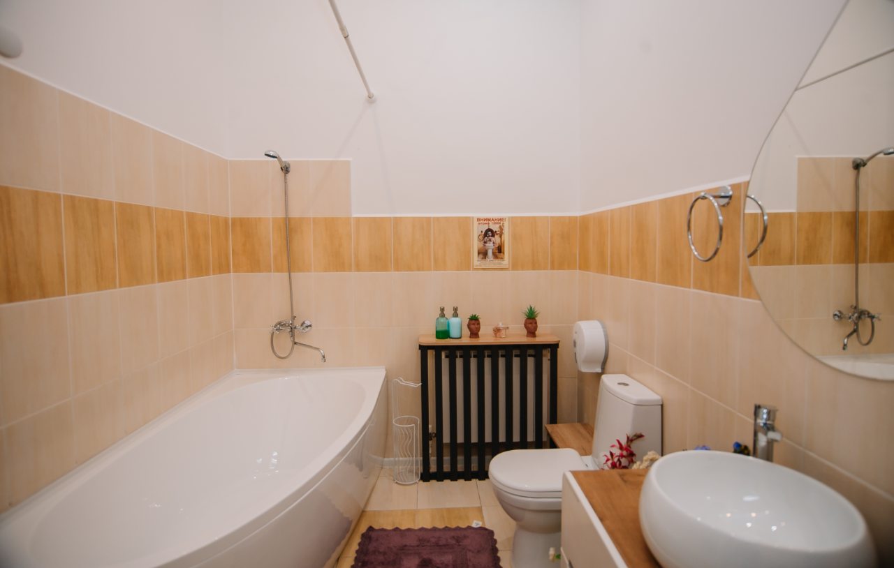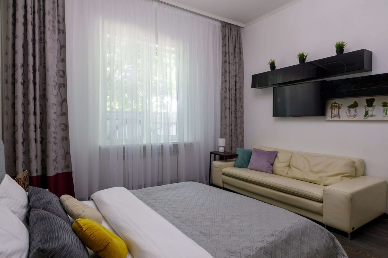 Доступно несколько апартаментов на выбор. В каждых вас ожидает удобная двуспальная кровать, диван с телевизором, различная мебель для хранения вещей, а также полноценная ванна с необходимой сантехникой.