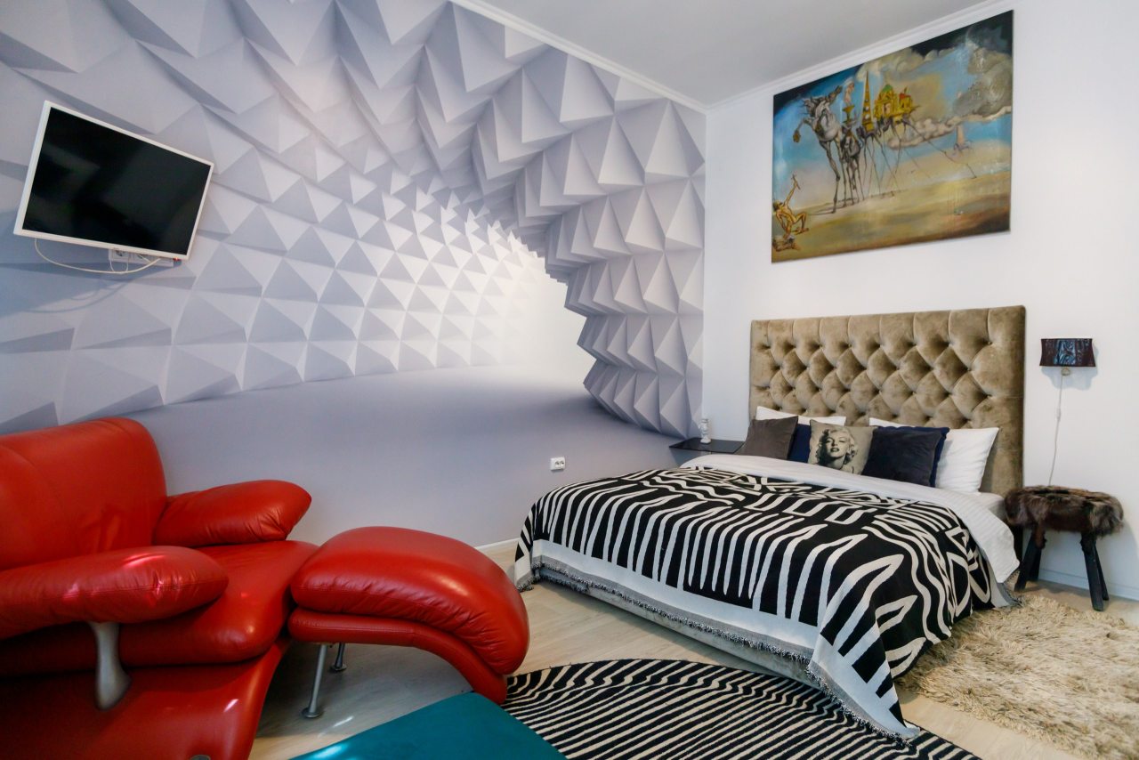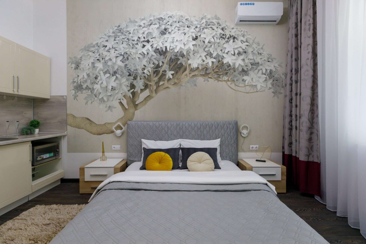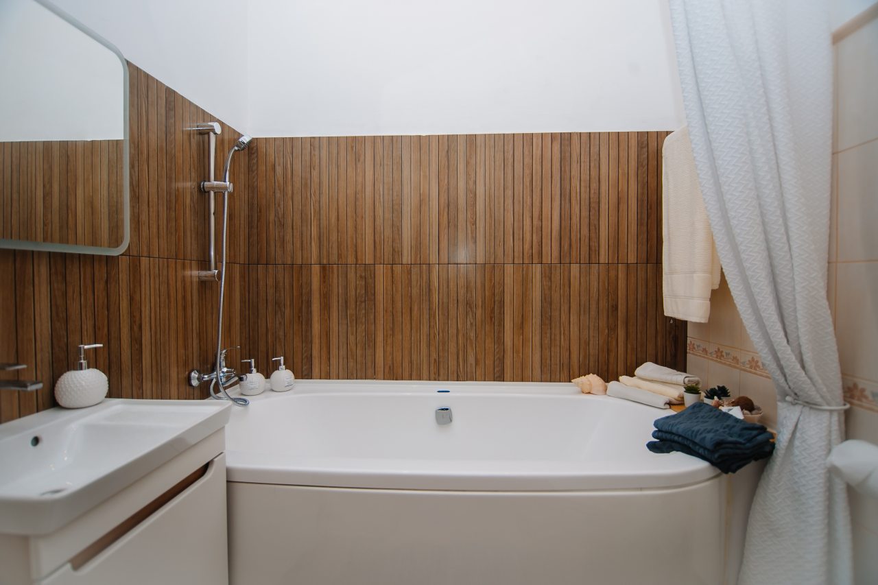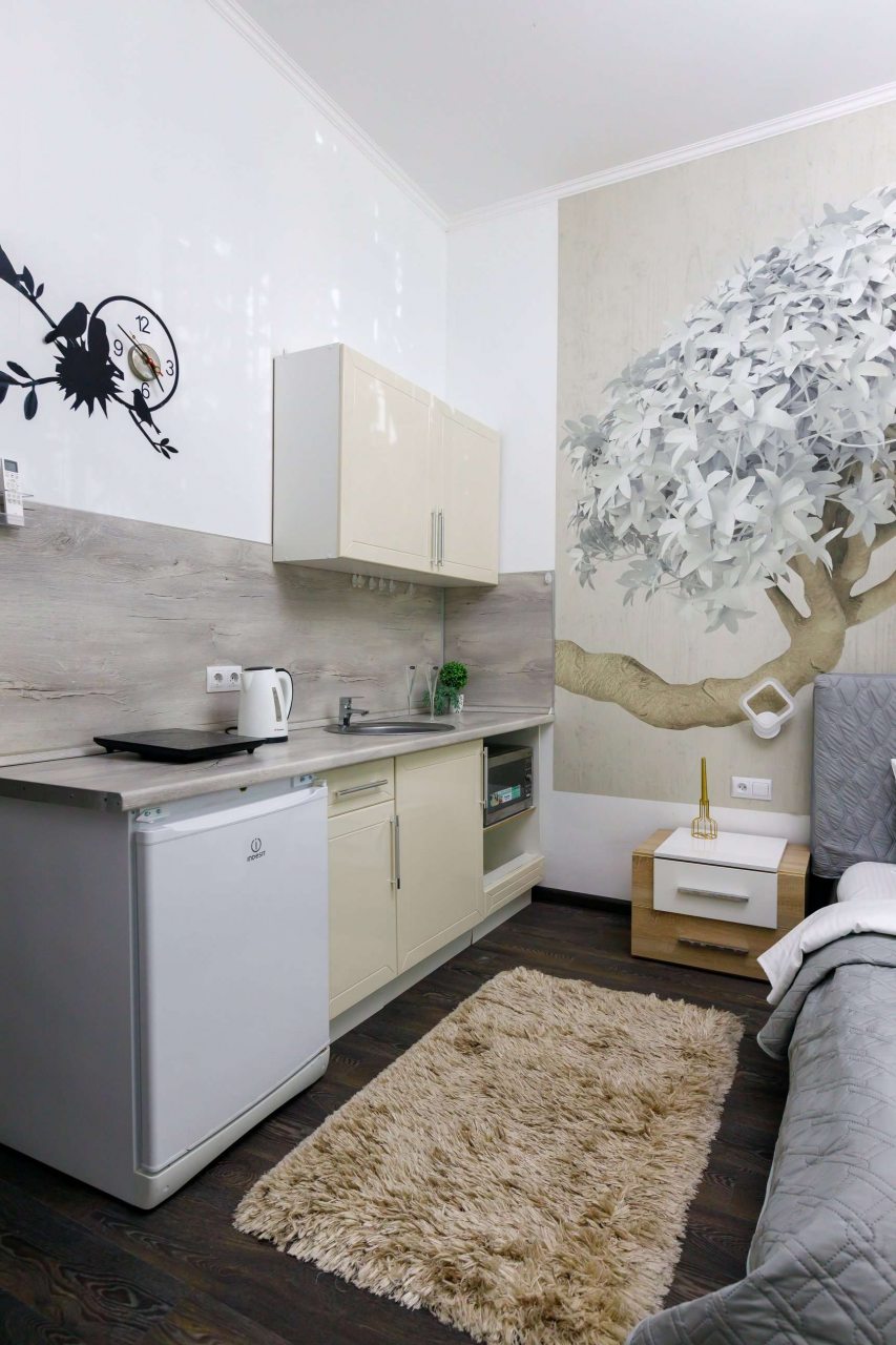Доступно несколько апартаментов на выбор. В каждых вас ожидает удобная двуспальная кровать, диван с телевизором, различная мебель для хранения вещей, а также полноценная ванна с необходимой сантехникой.