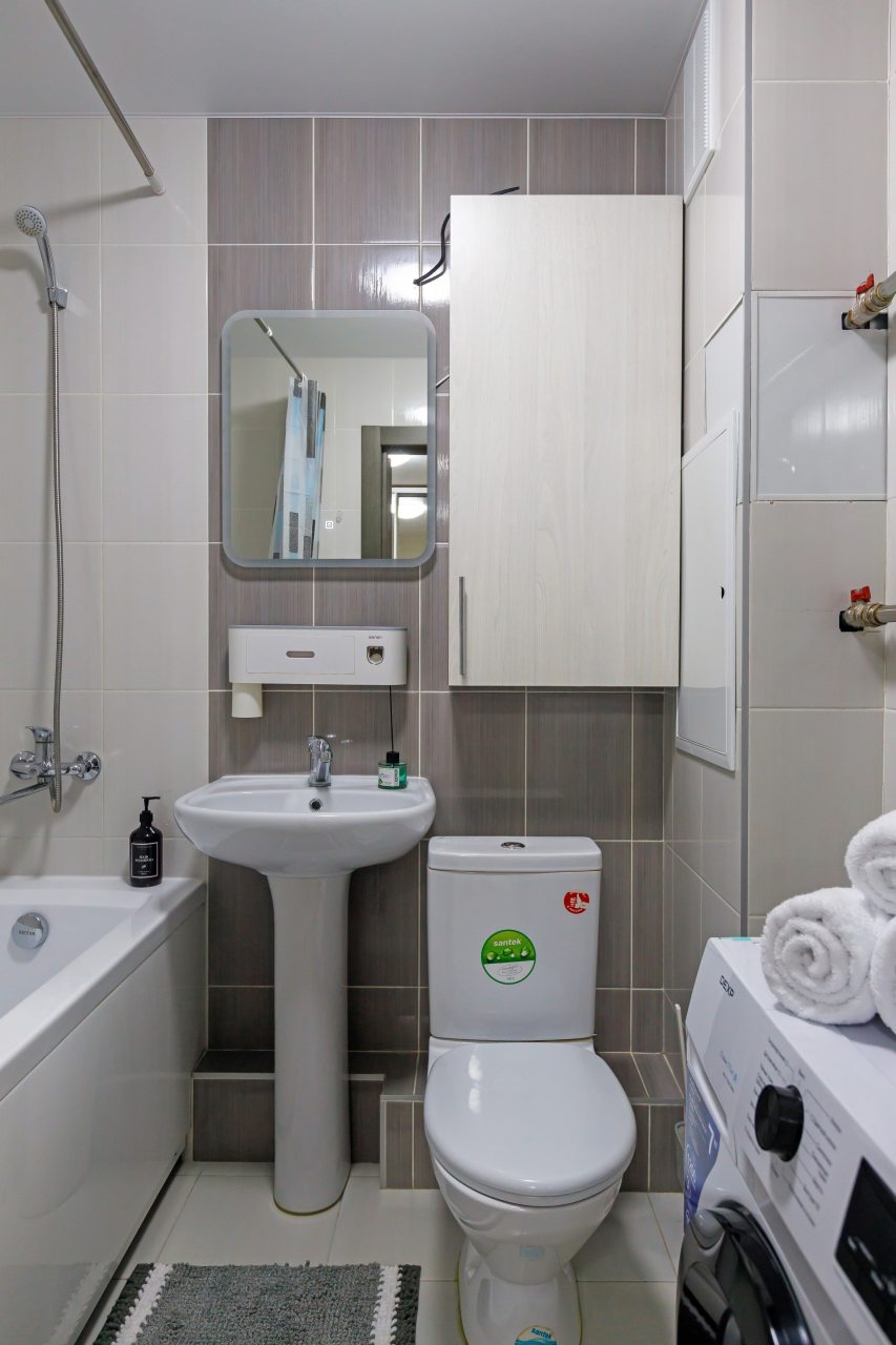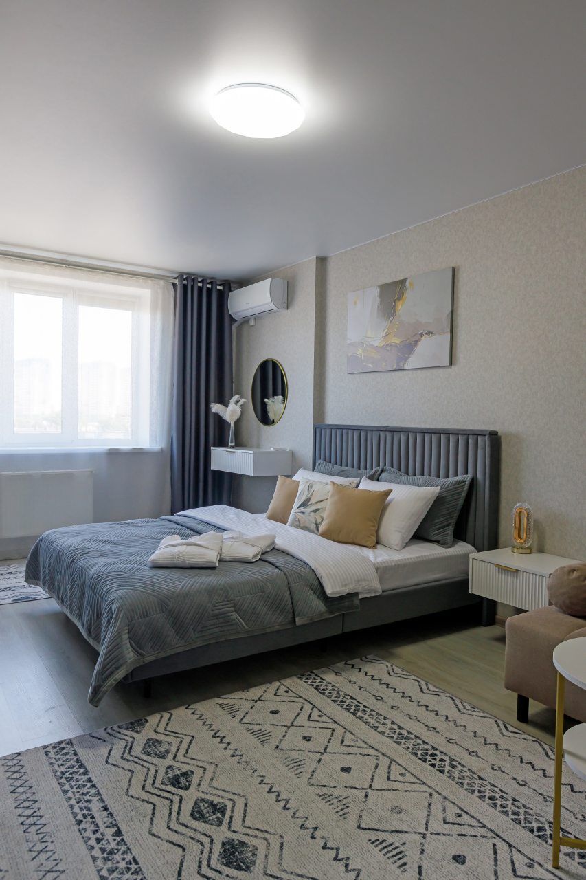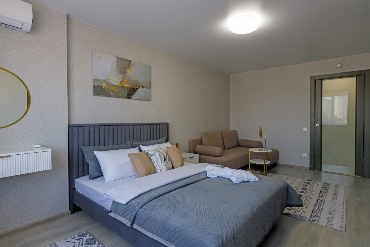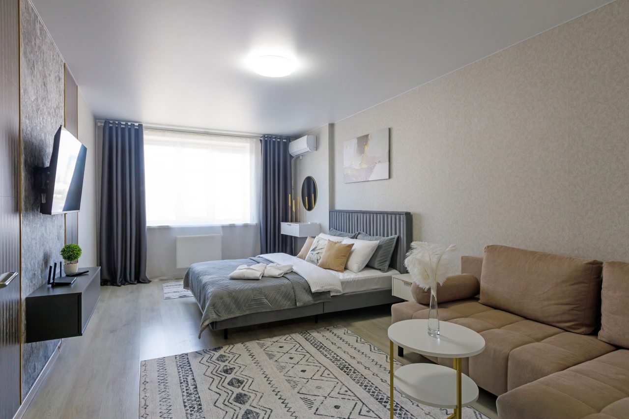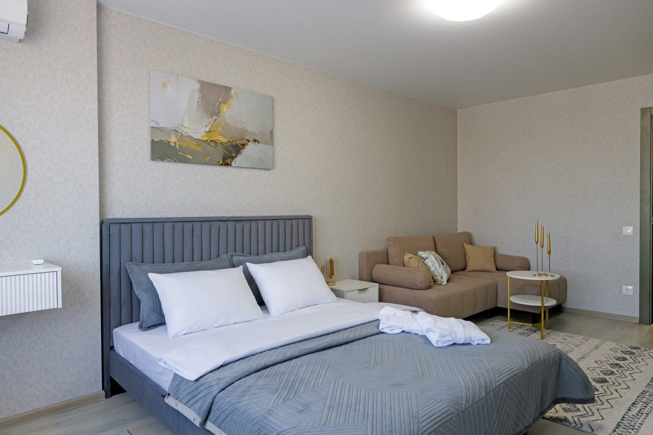 Для проживания предусмотрено всё необходимое, в том числе двуспальная кровать с удобным матрасом, мягкий диван с телевизором, шкаф с большим зеркалом, уютный балкон, а также ванная комната со стиральной машиной и средствами для гигиены.