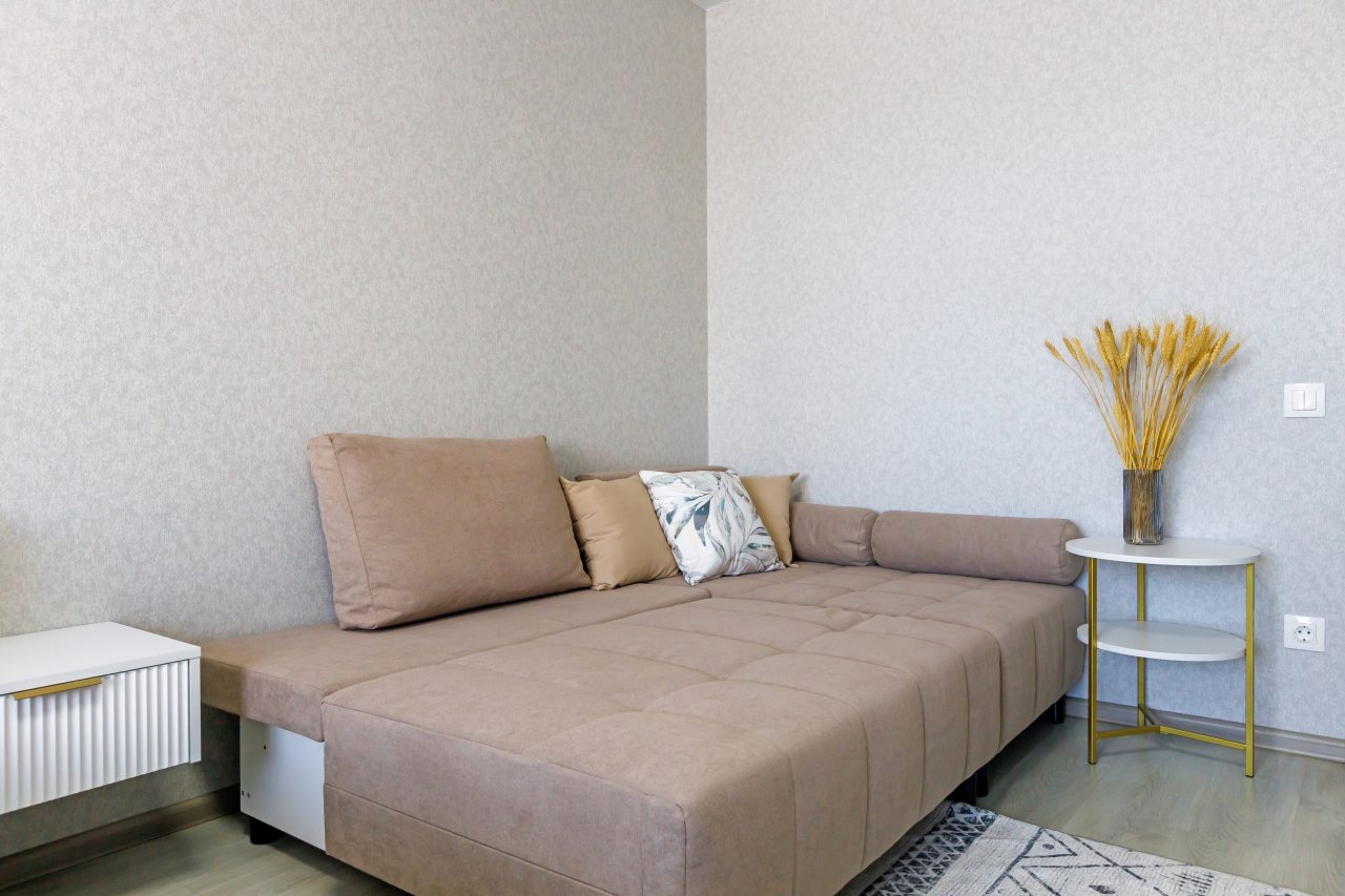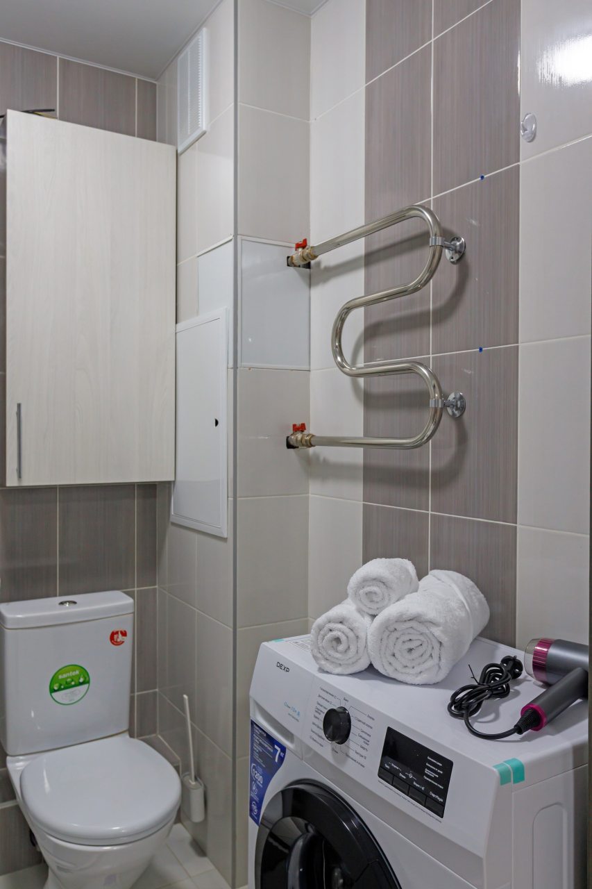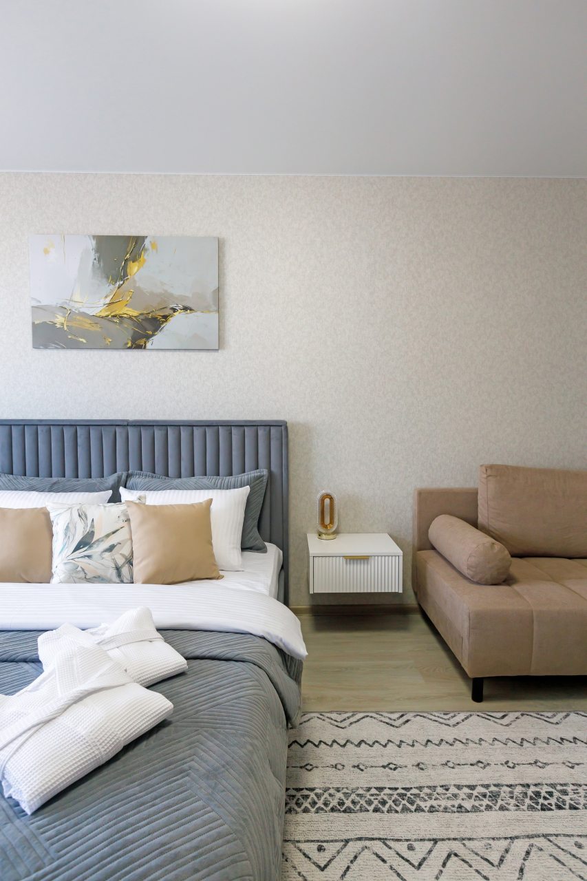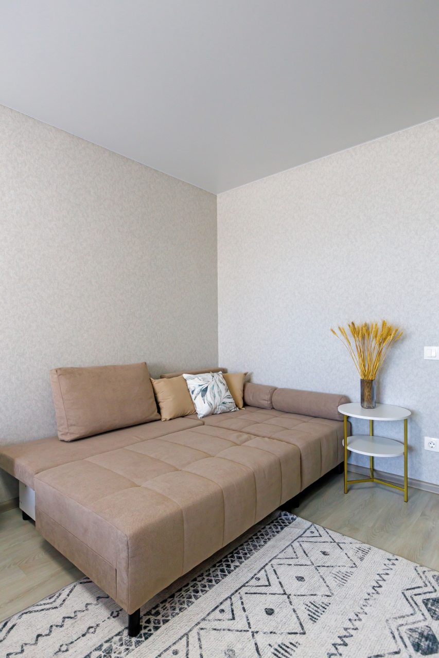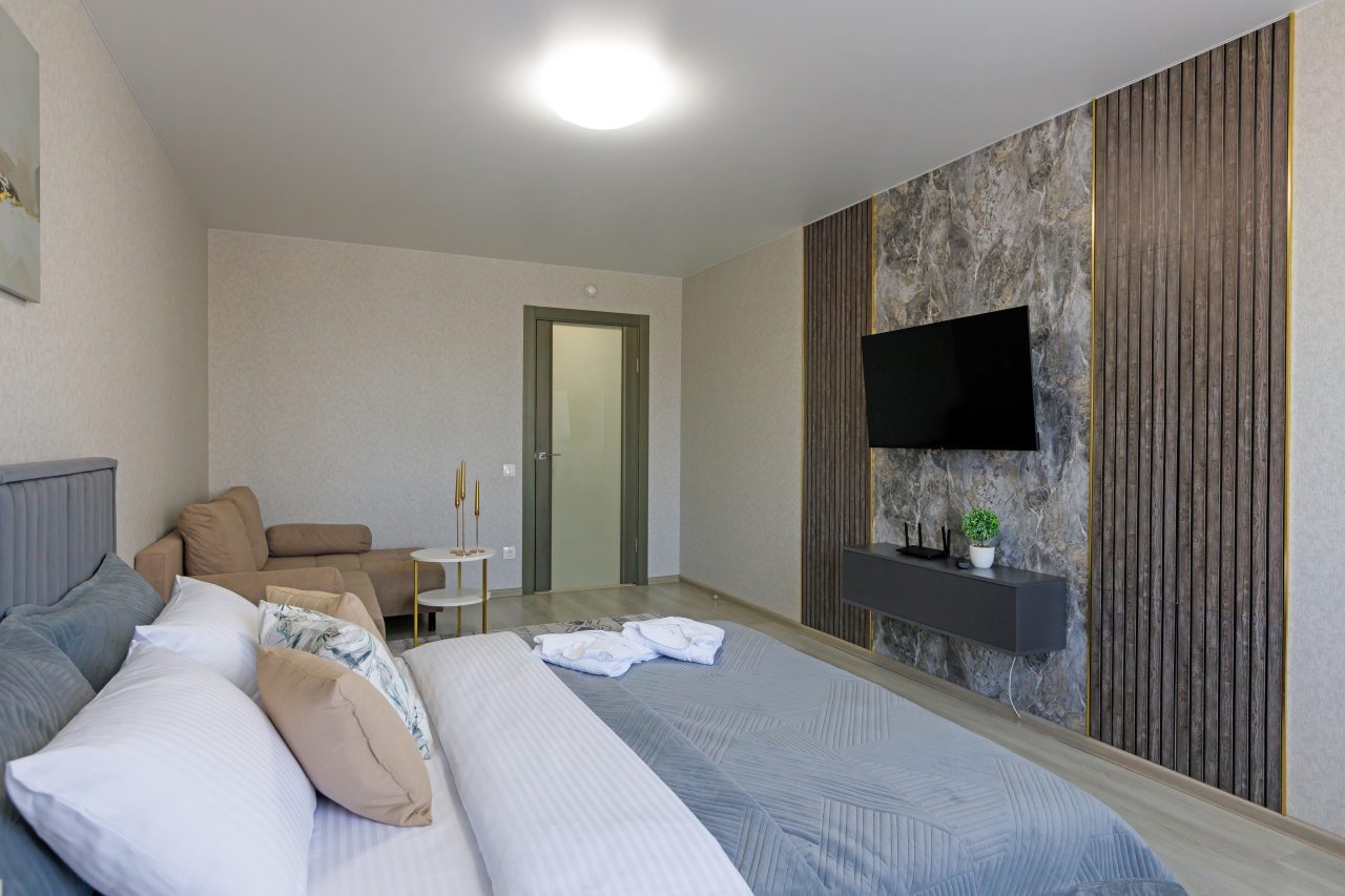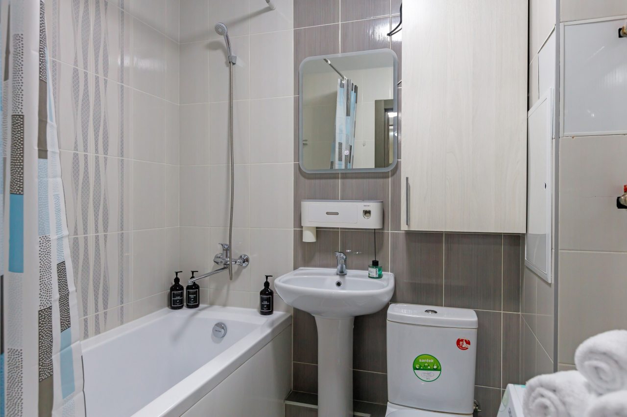 Для проживания предусмотрено всё необходимое, в том числе двуспальная кровать с удобным матрасом, мягкий диван с телевизором, шкаф с большим зеркалом, уютный балкон, а также ванная комната со стиральной машиной и средствами для гигиены.