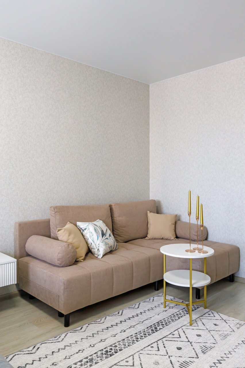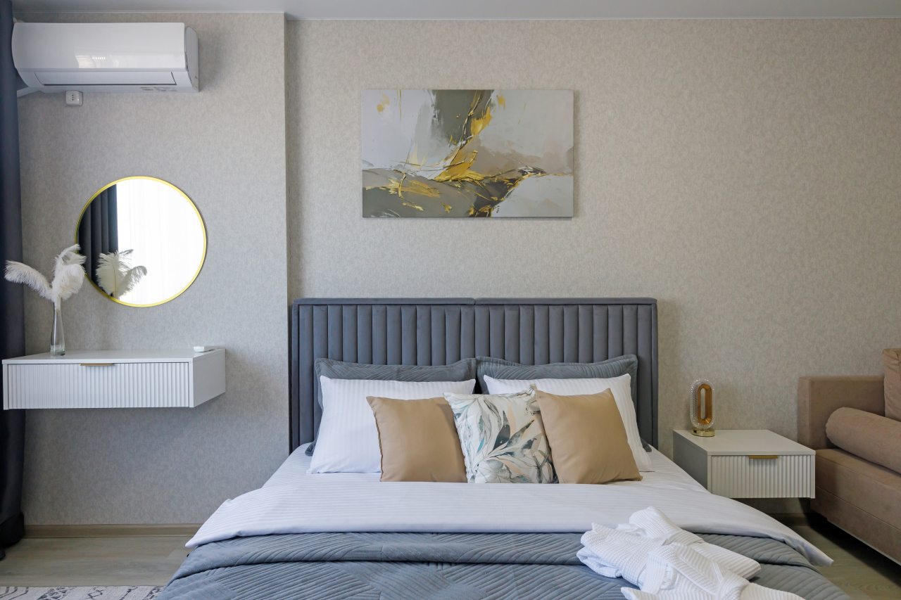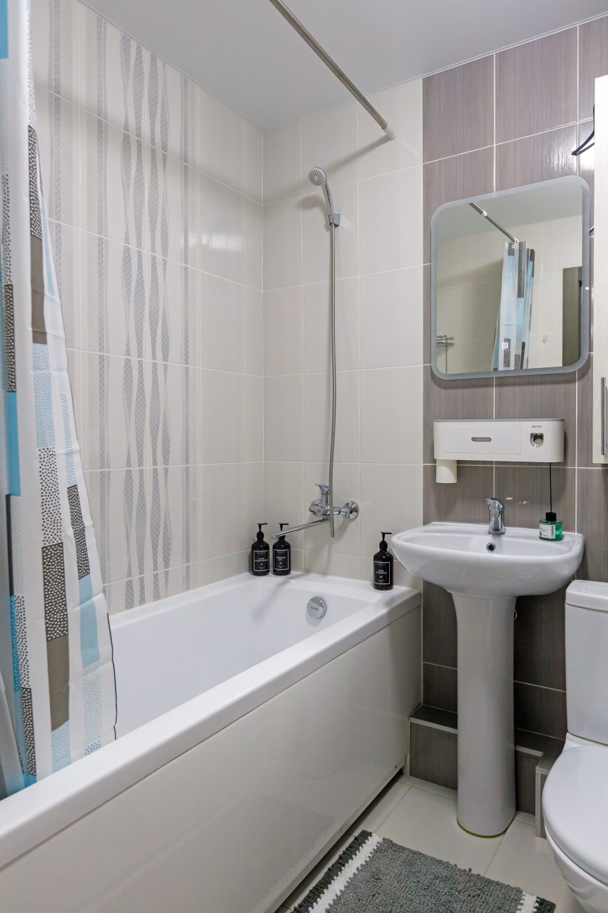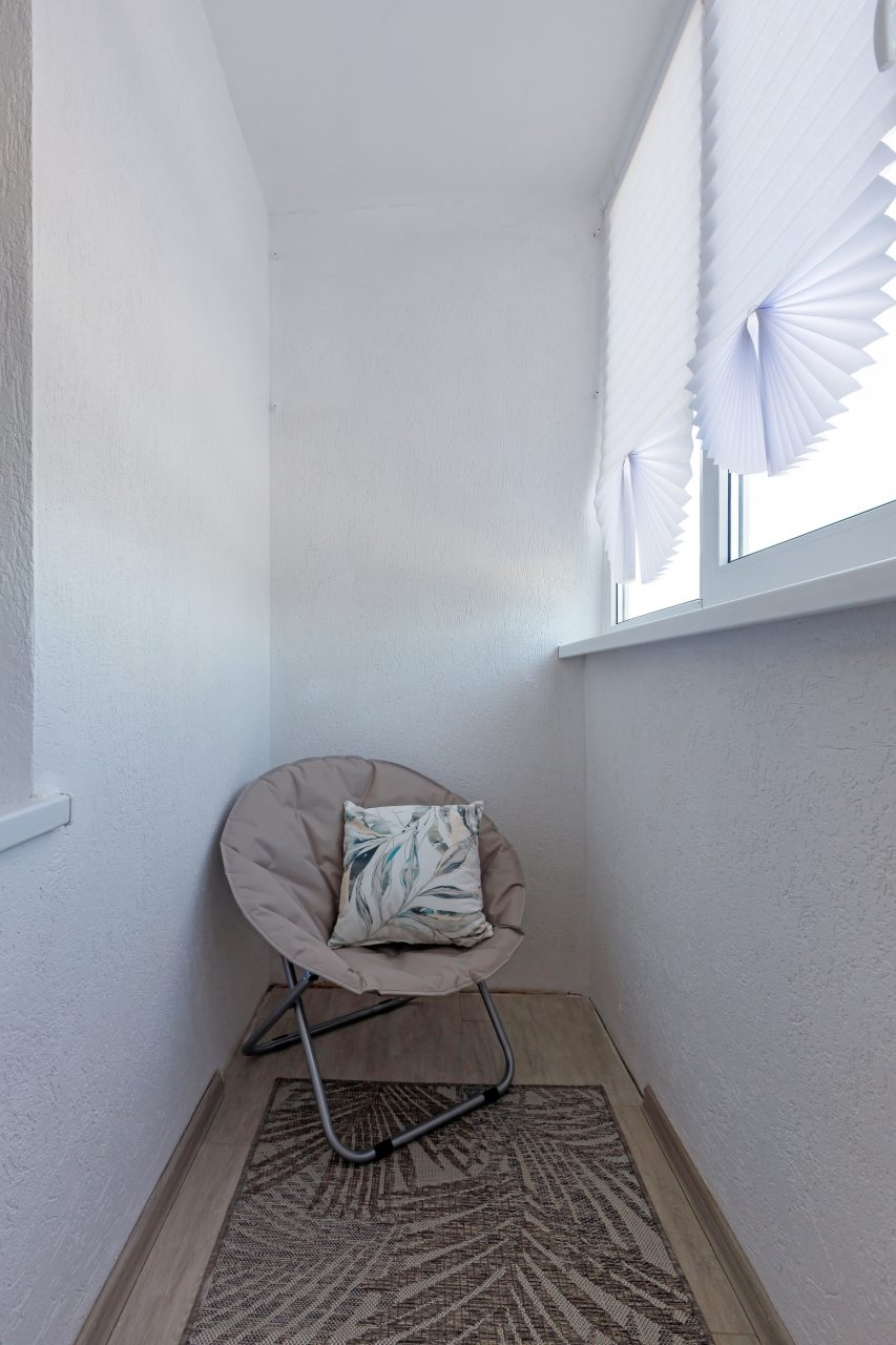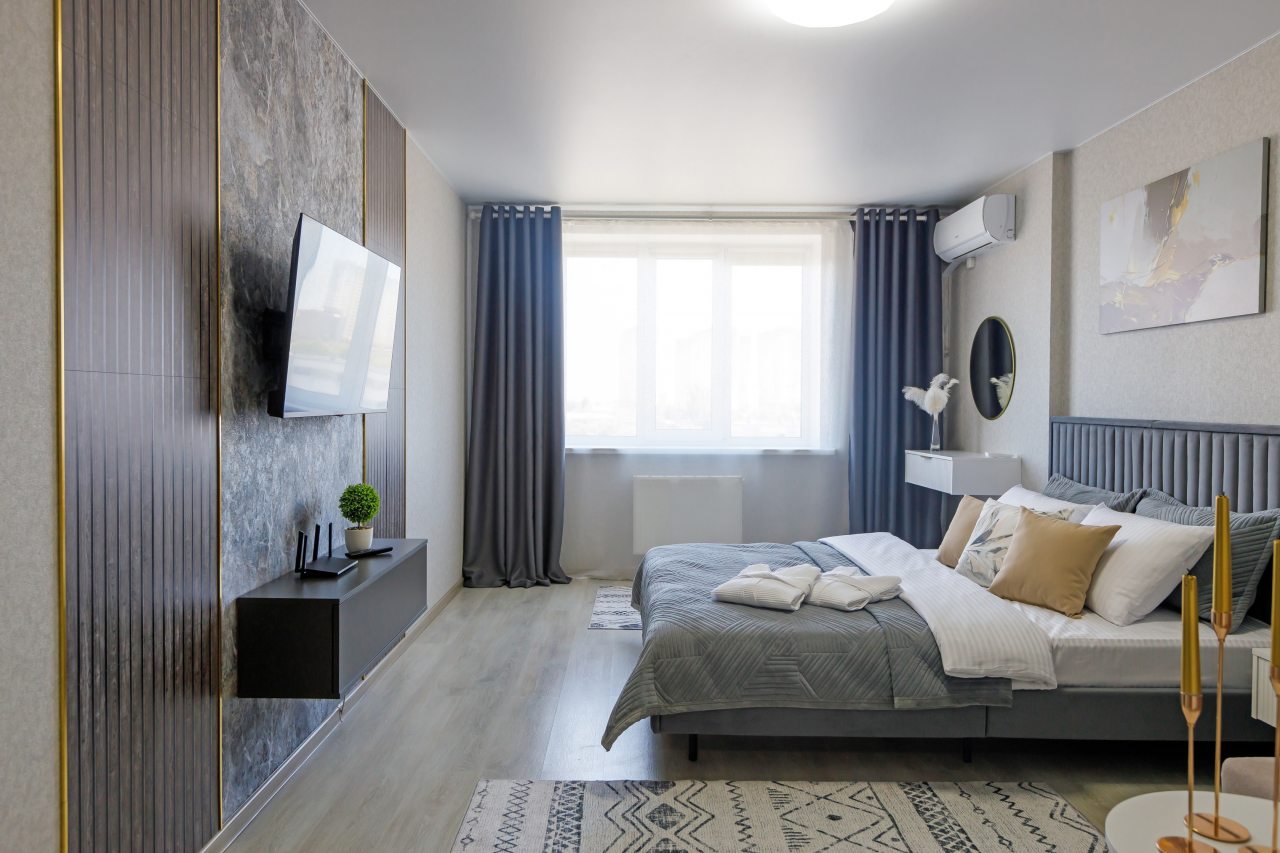 Для проживания предусмотрено всё необходимое, в том числе двуспальная кровать с удобным матрасом, мягкий диван с телевизором, шкаф с большим зеркалом, уютный балкон, а также ванная комната со стиральной машиной и средствами для гигиены.