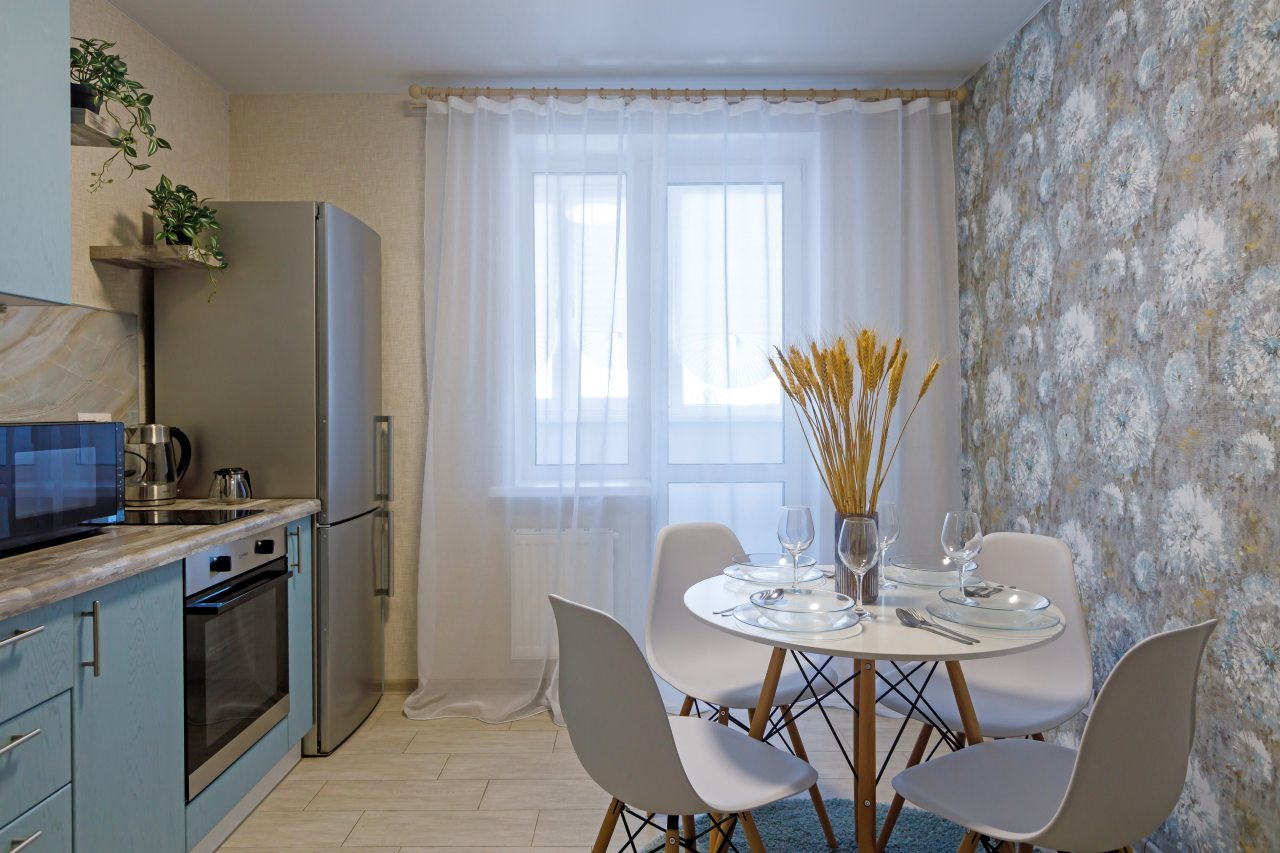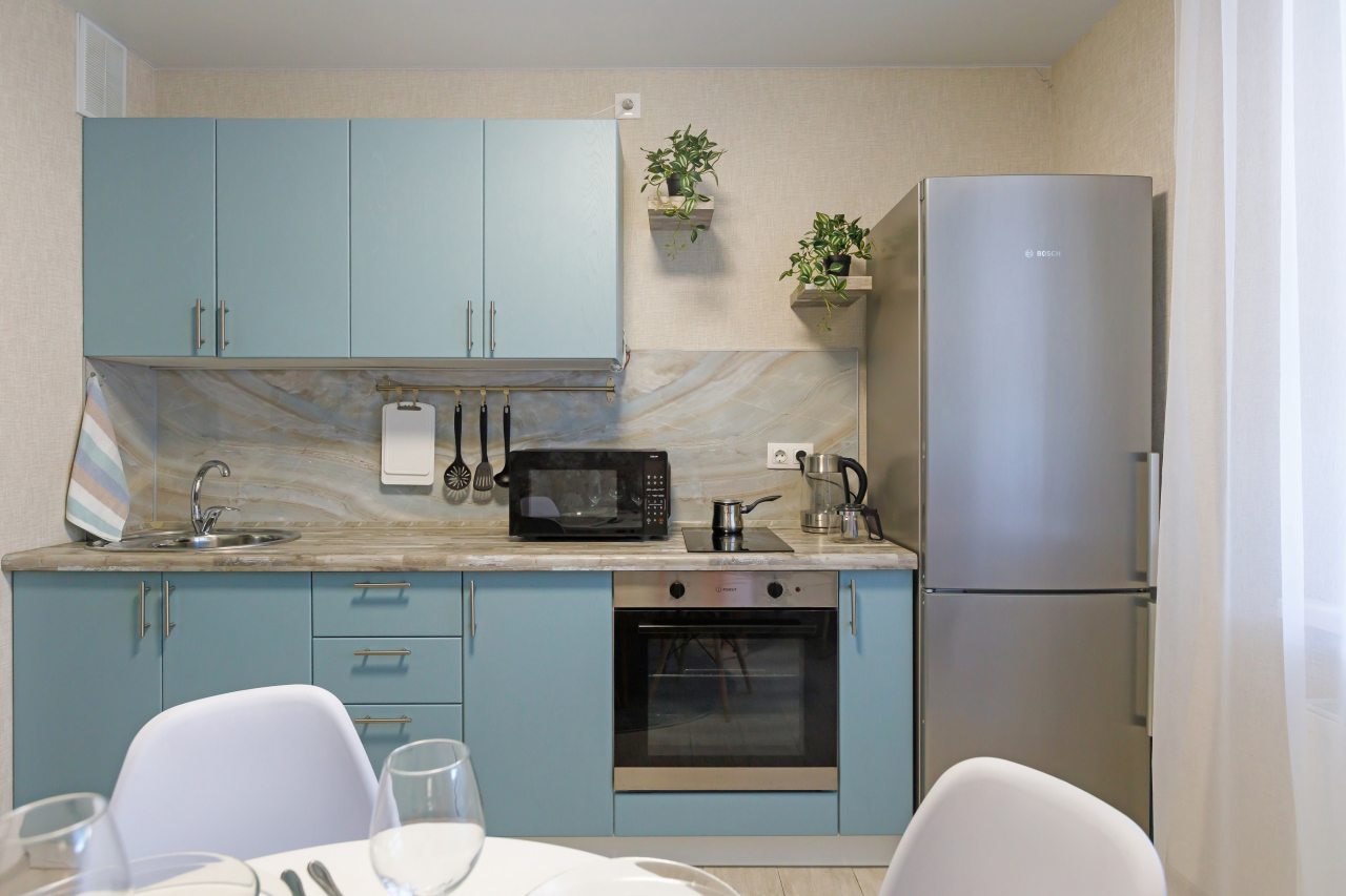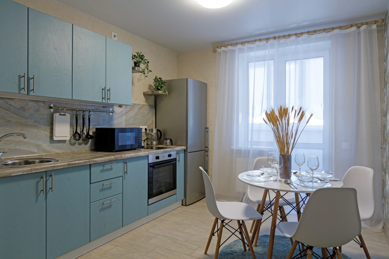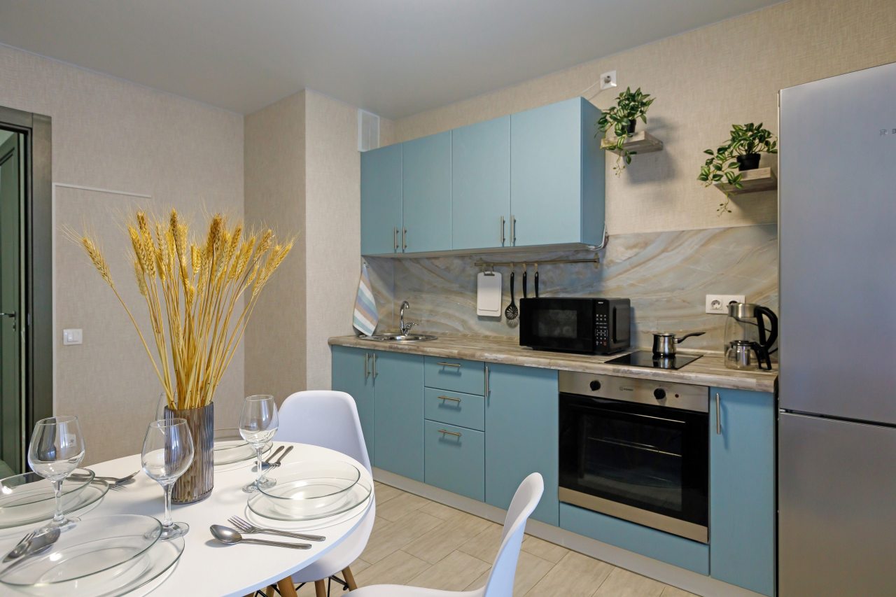 На просторной кухне вы сможете готовить любимые блюда и напитки, поскольку в наличии варочная панель, духовой шкаф, холодильник, чайник, турка для кофе, СВЧ-печь и красивая обеденная зона.