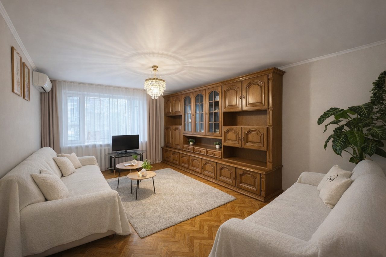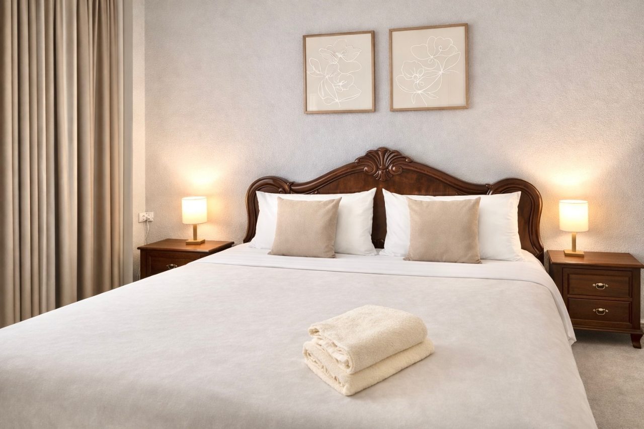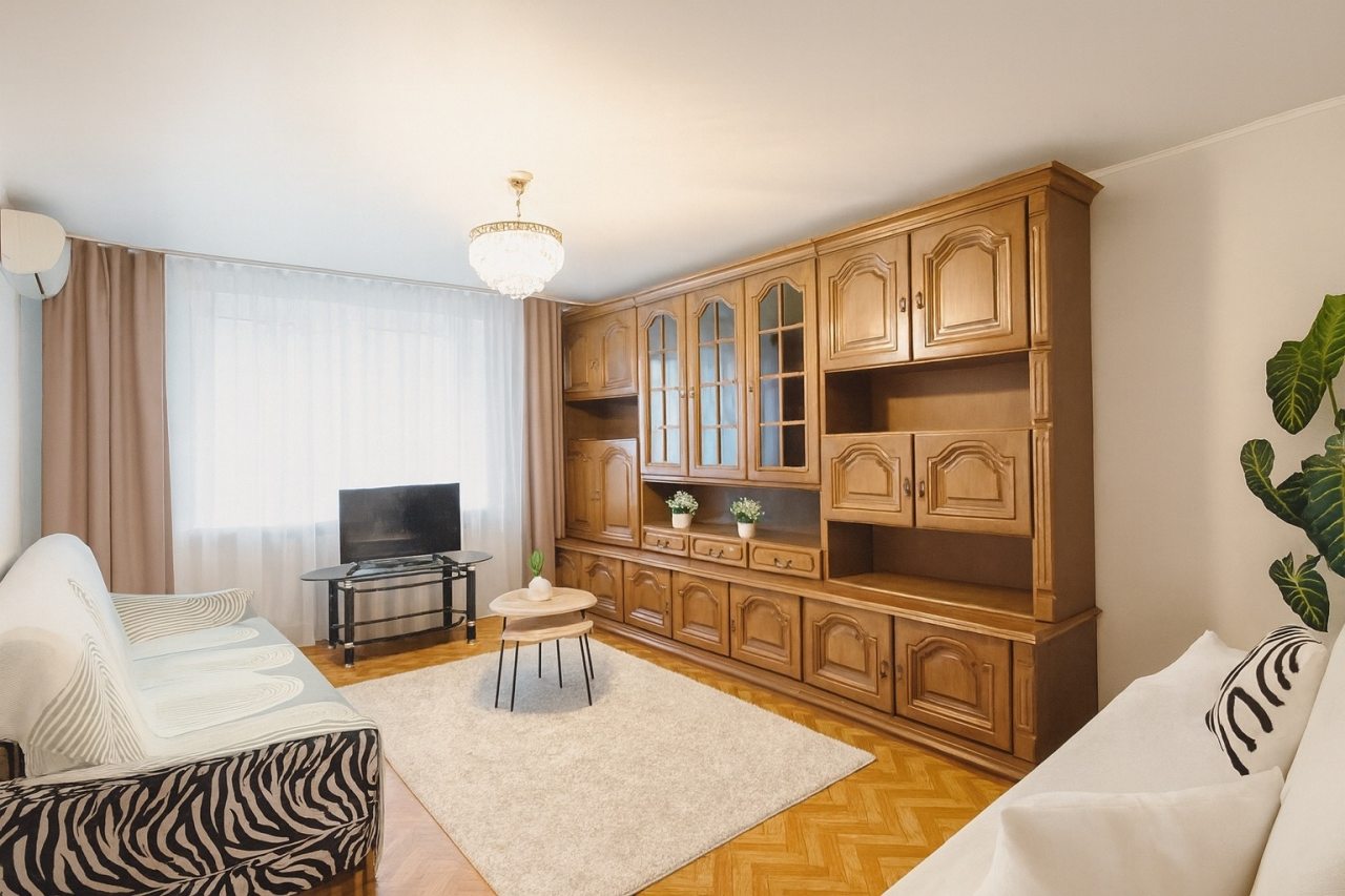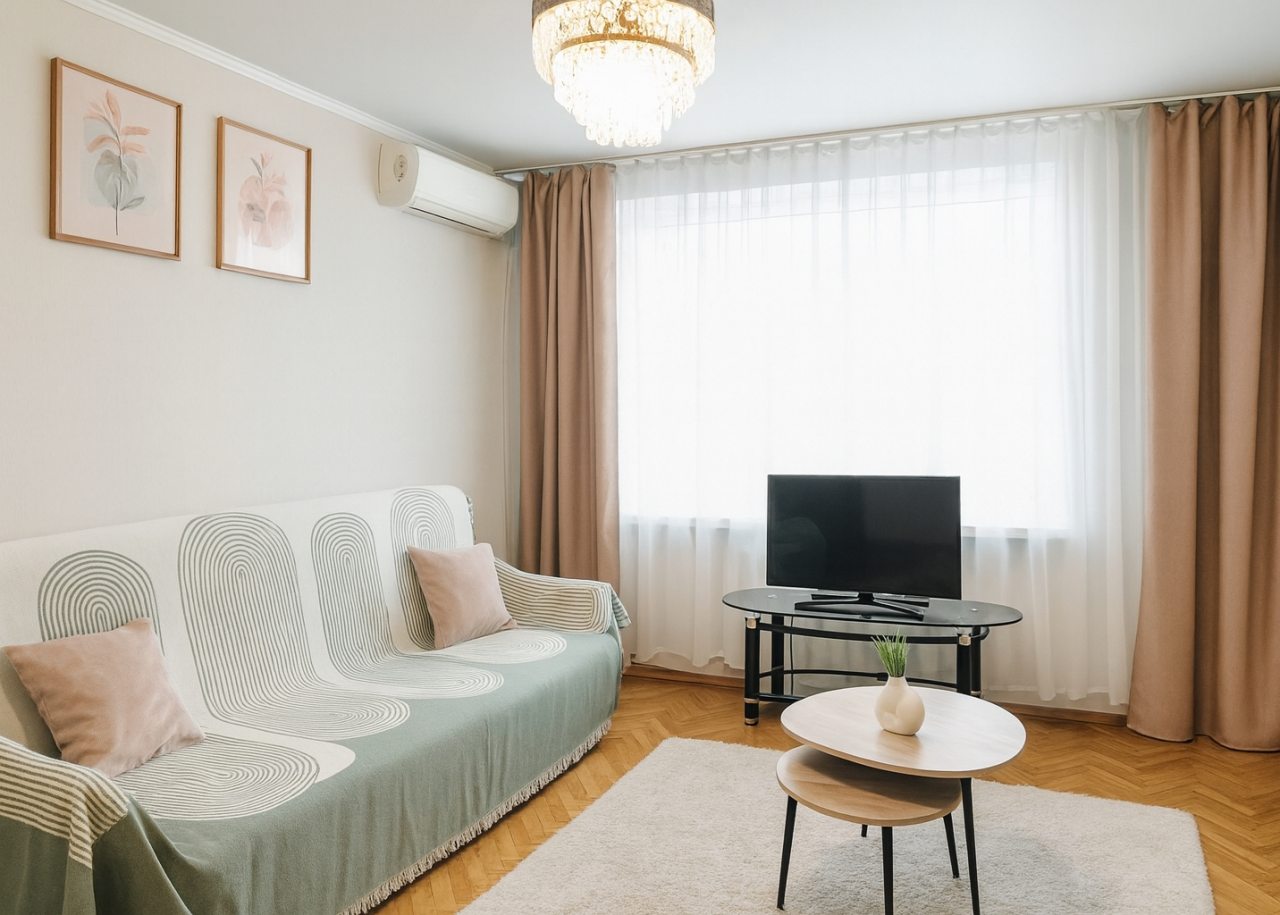 Уютная квартира укомплектована удобной двуспальной кроватью с чистым постельным бельем из 100% хлопка, кондиционером, шкафом, диваном, стиральной машиной, телевизором со спутниковым телевидением, точкой высокоскоростного интернета и ванной комнатой с качественной сантехникой.