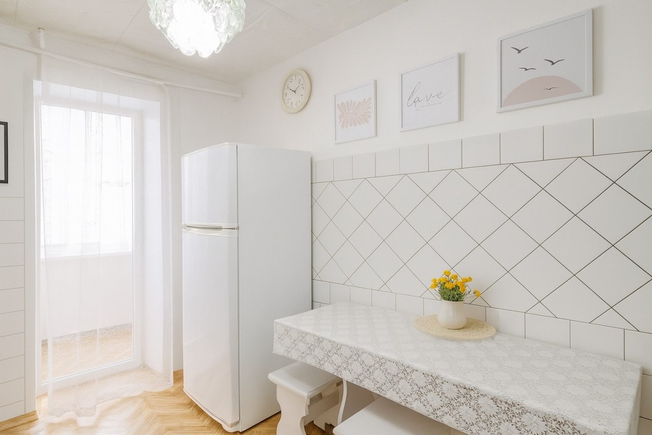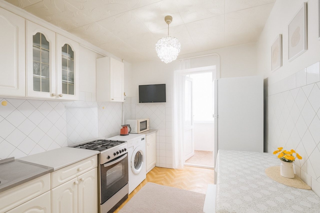 Светлая кухня оборудована стильным гарнитуром, обеденным столом и необходимой бытовой техникой. В доступности большой выбор кафе и других заведений, где можно пообедать.