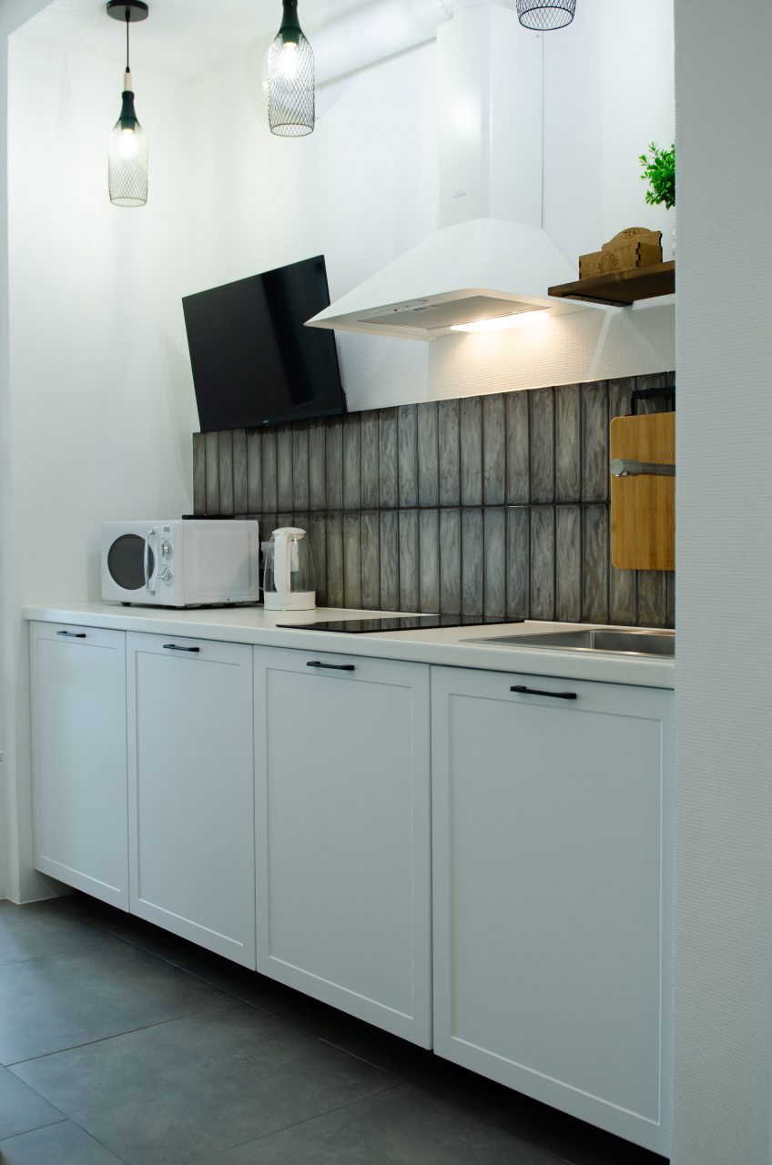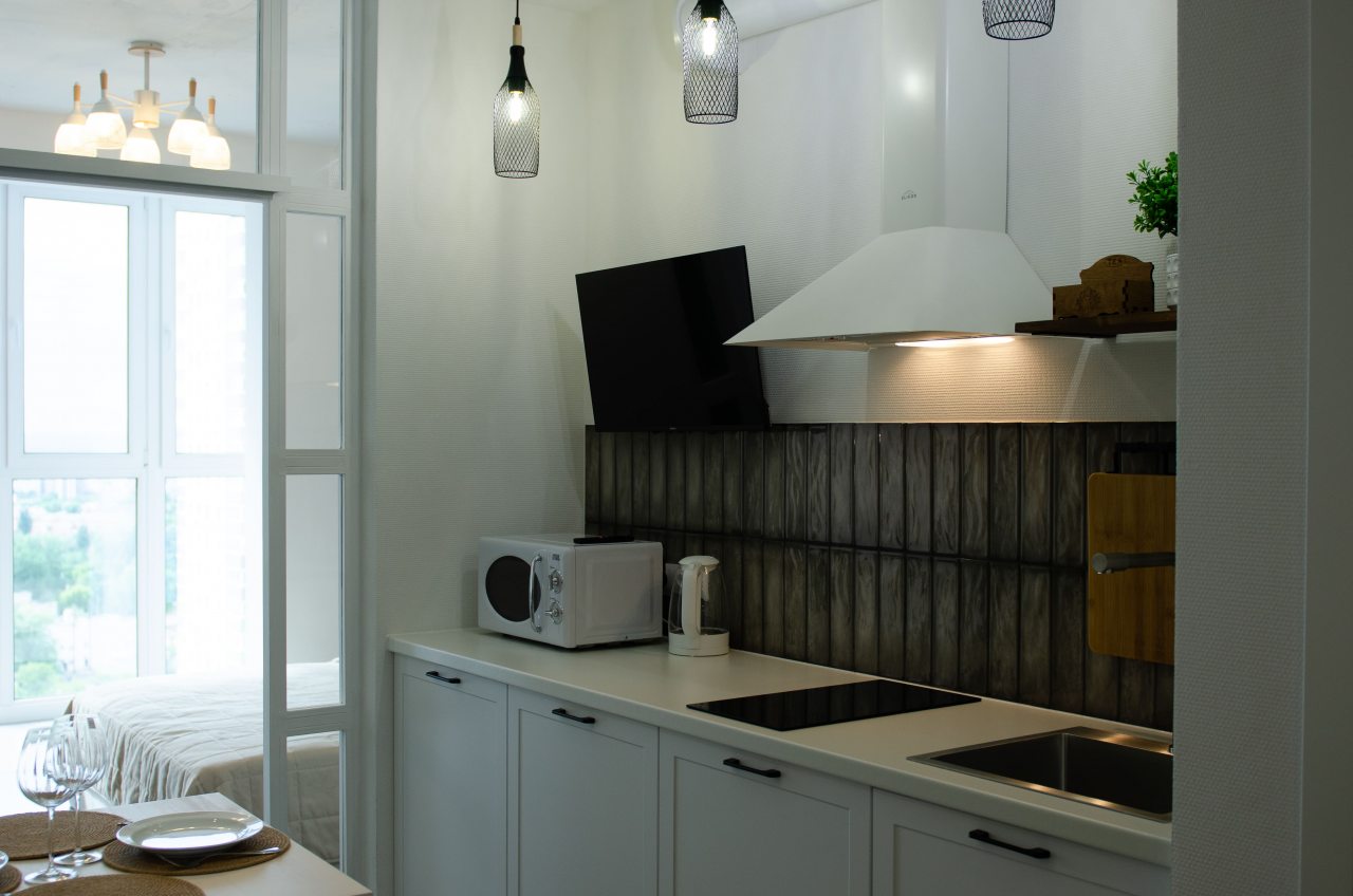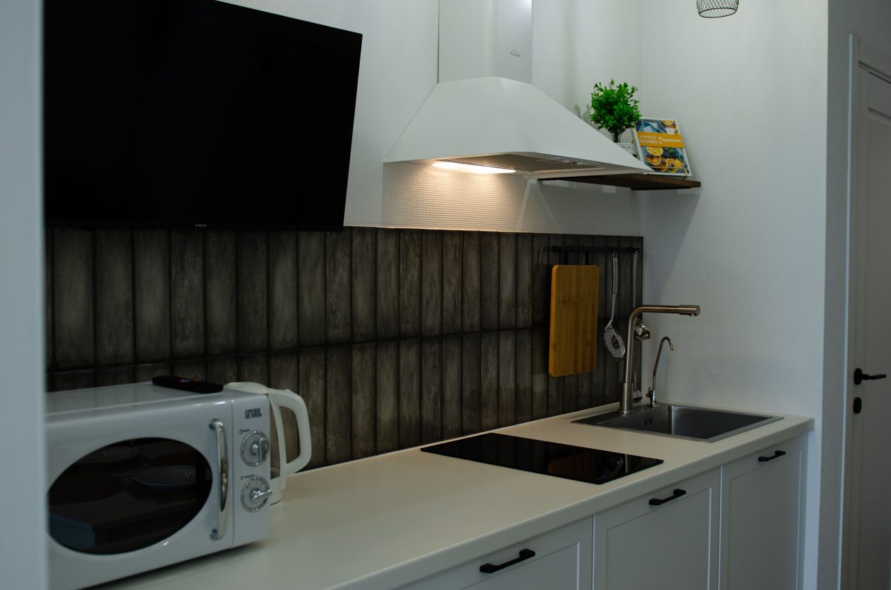 Кухонная зона укомплектована варочной панелью с вытяжкой, СВЧ, чайником, обеденным столом и стульями.