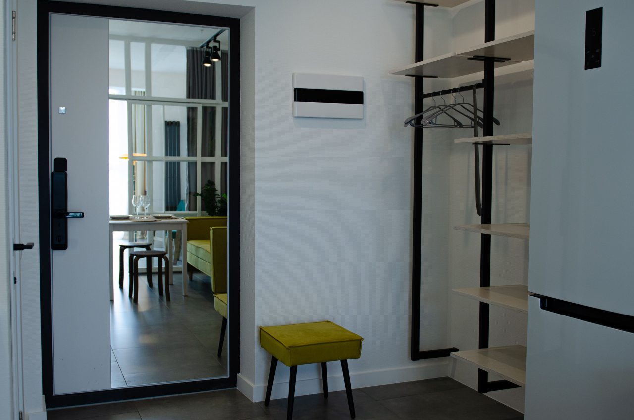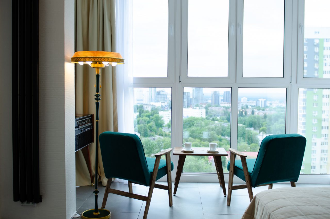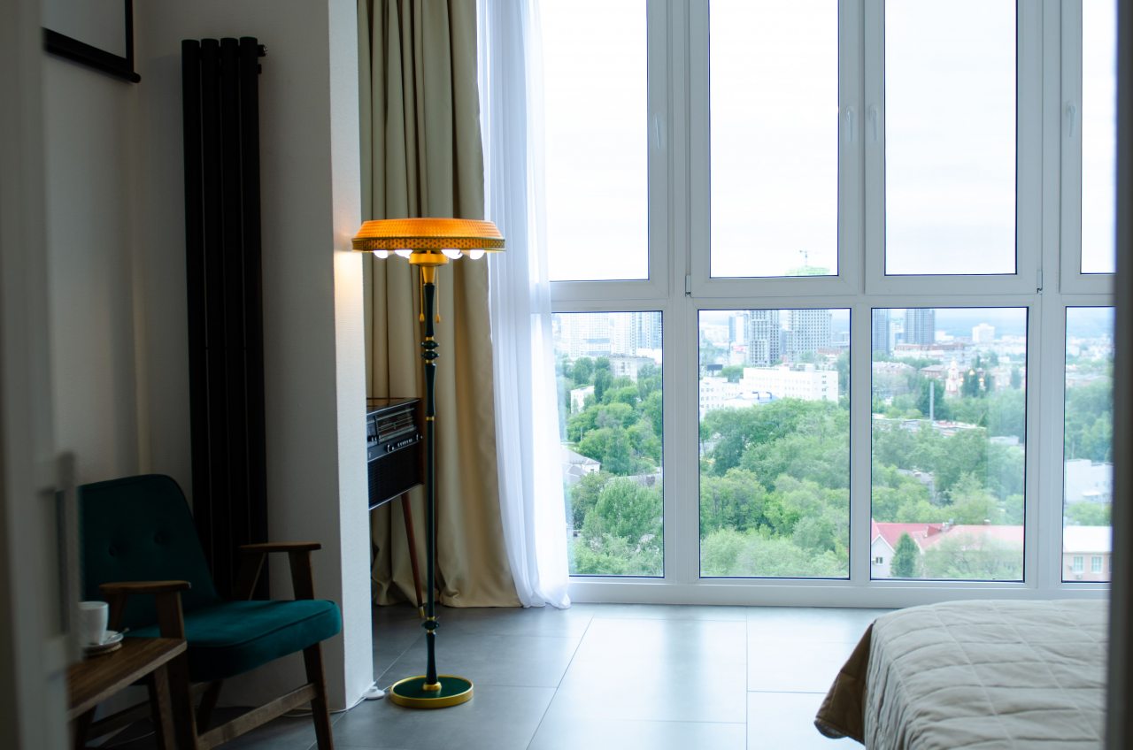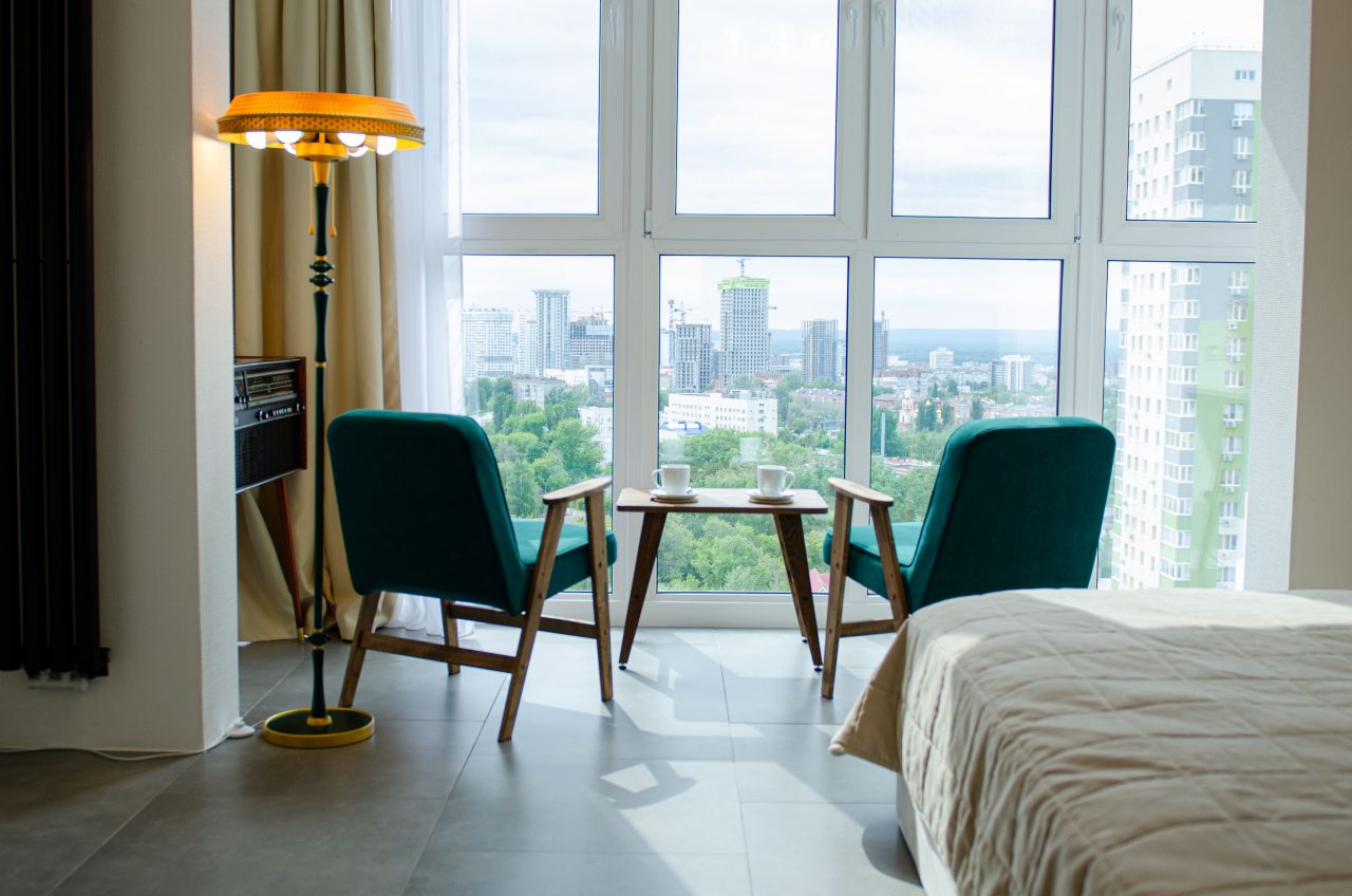 Внутри вас ожидает стильный дизайн, двуспальная кровать с качественным матрасом, красивый вид на город из панорамного окна, уютная зона отдыха с лампой, письменный стол, санузел со стиральной машиной.