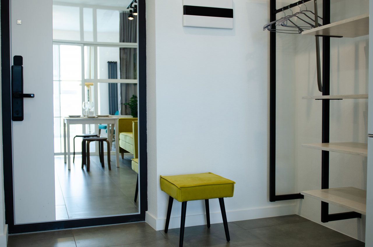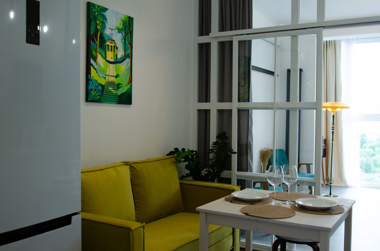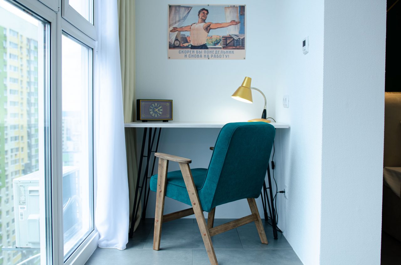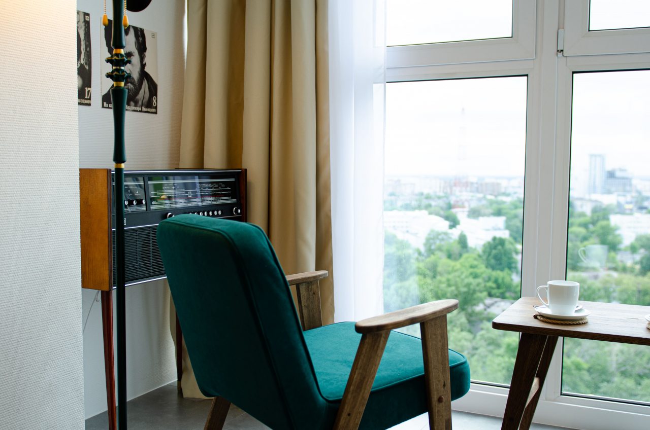 Внутри вас ожидает стильный дизайн, двуспальная кровать с качественным матрасом, красивый вид на город из панорамного окна, уютная зона отдыха с лампой, письменный стол, санузел со стиральной машиной.