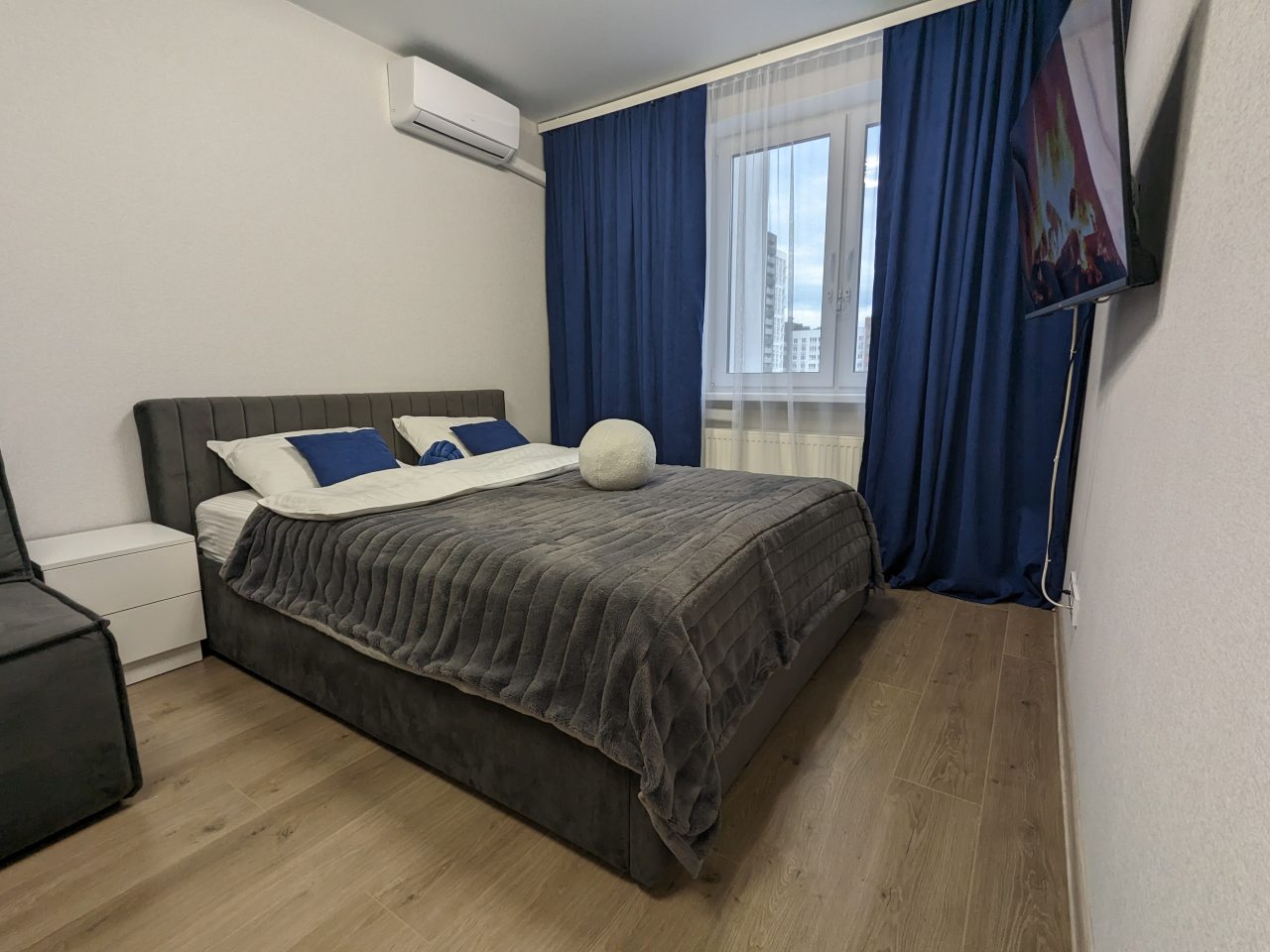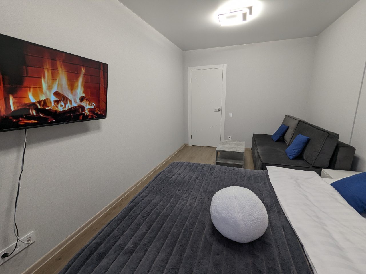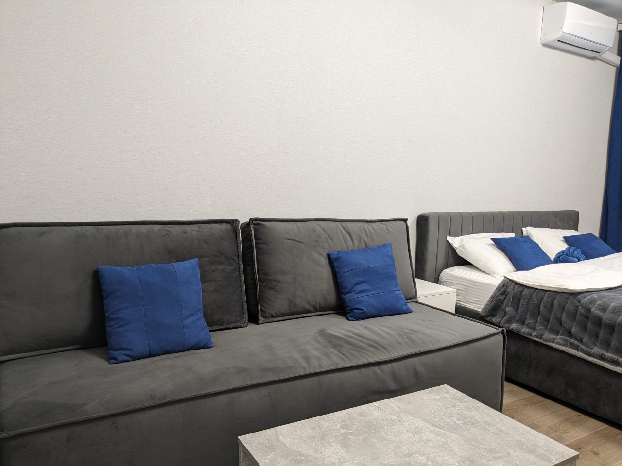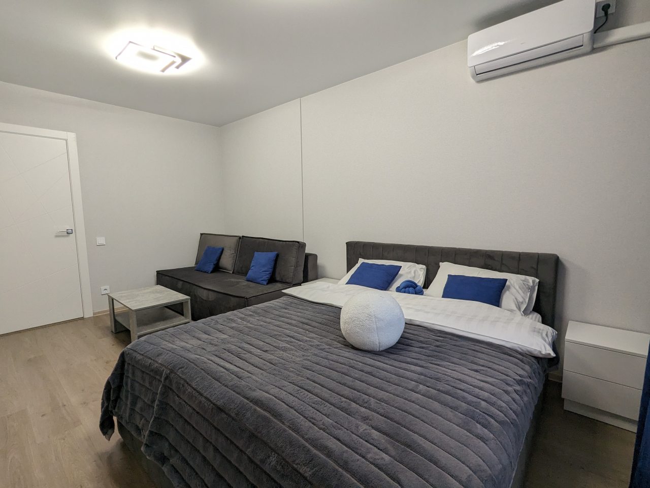 Внутри вас ожидает двуспальная кровать с удобным матрасом, мягкий раскладной диван, прикроватные тумбы, кондиционер, телевизор, затемненные шторы, вместительная гардеробная, ванная комната со стиральной машиной, гладильные принадлежности, пылесос, фен.