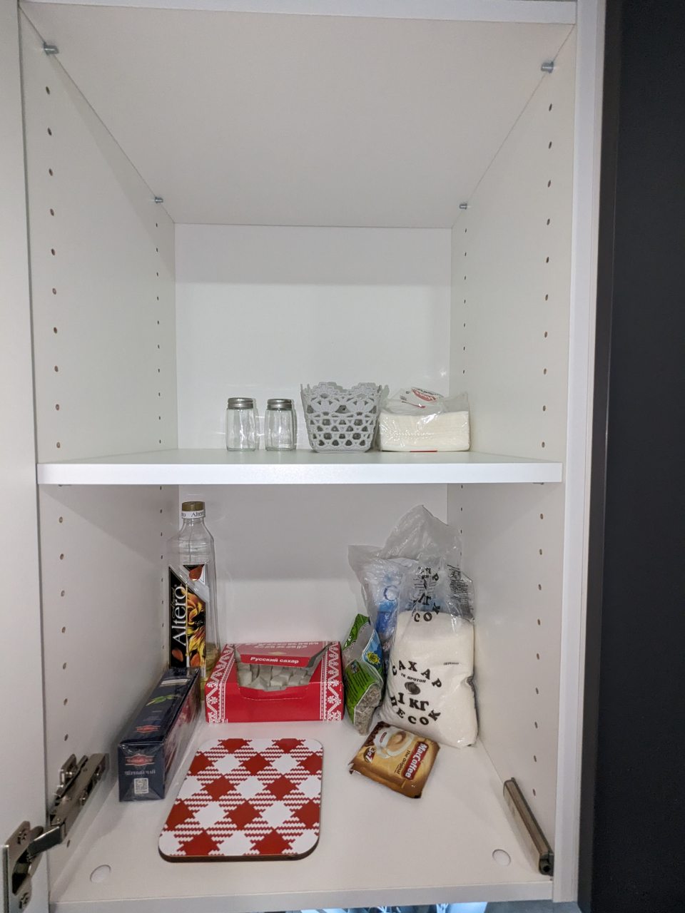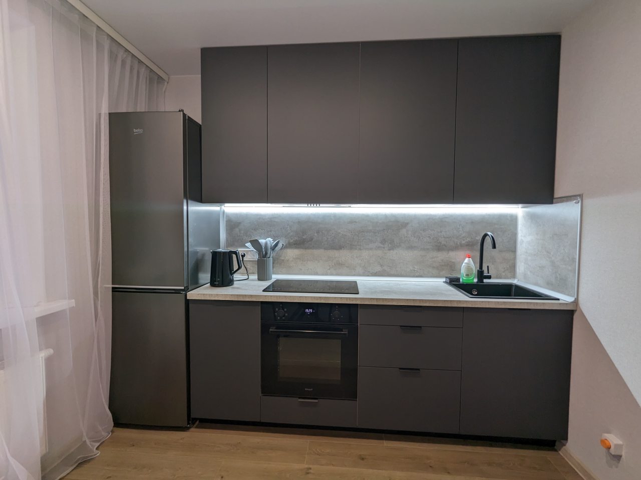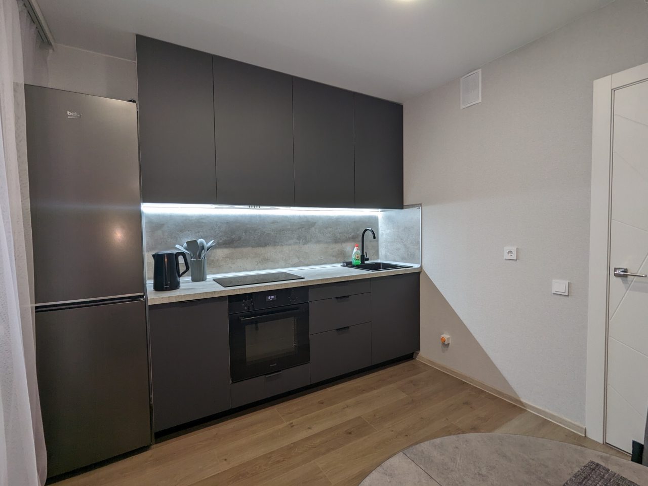 Кухня оснащена всем необходимым для приготовления домашних напитков и блюд: в наличии варочная панель, духовой шкаф, чайник, холодильник, обеденная зона.