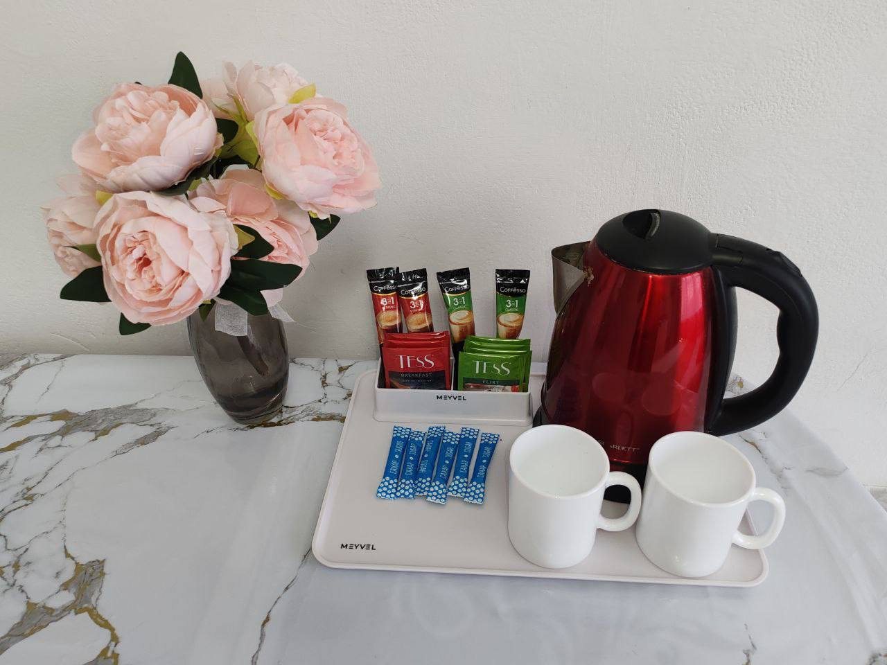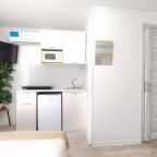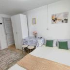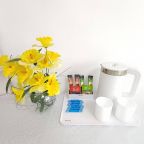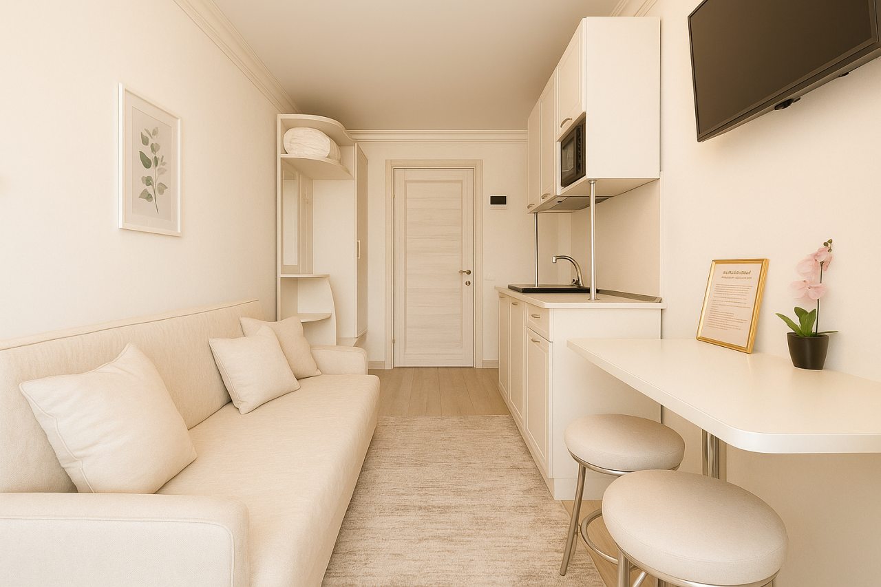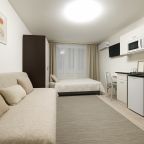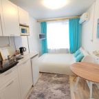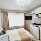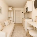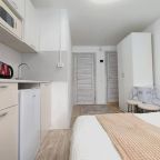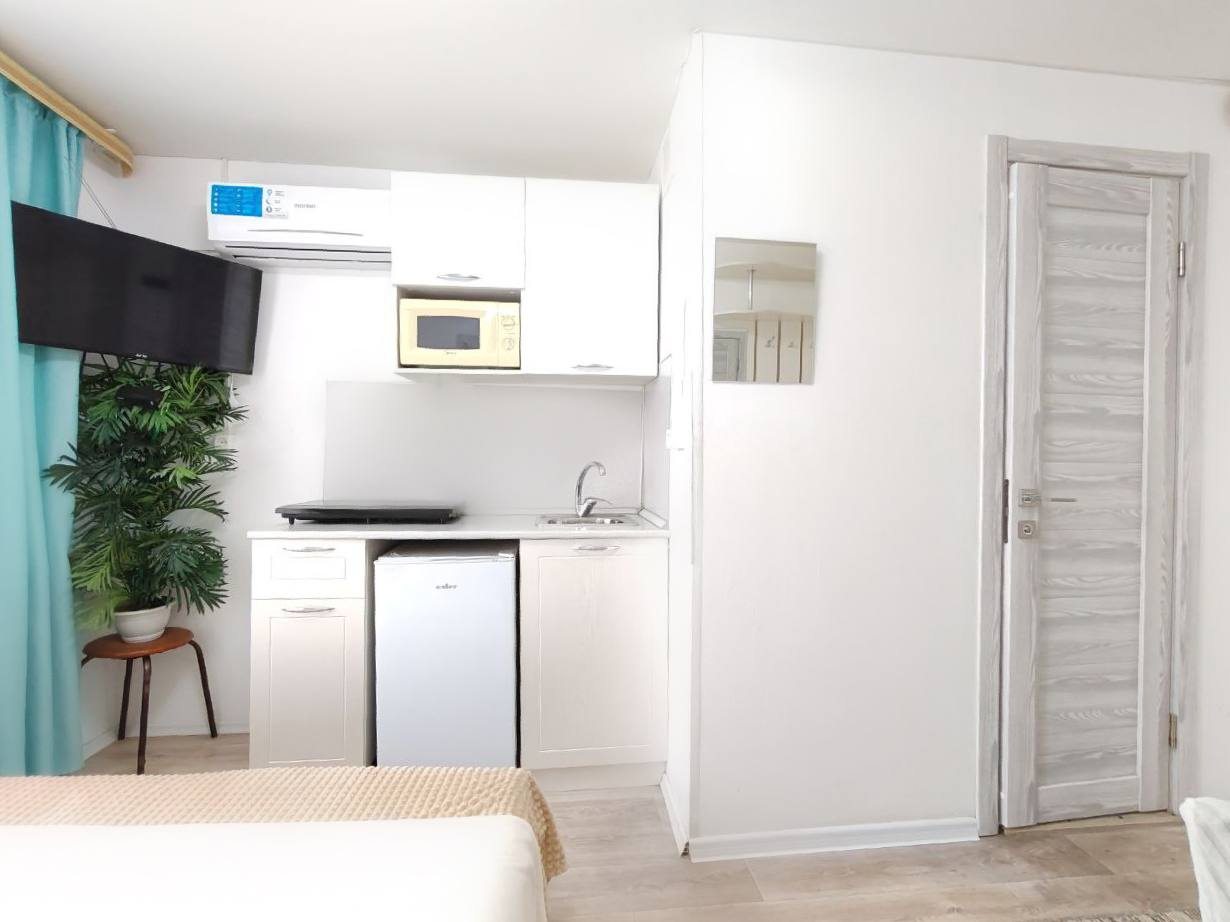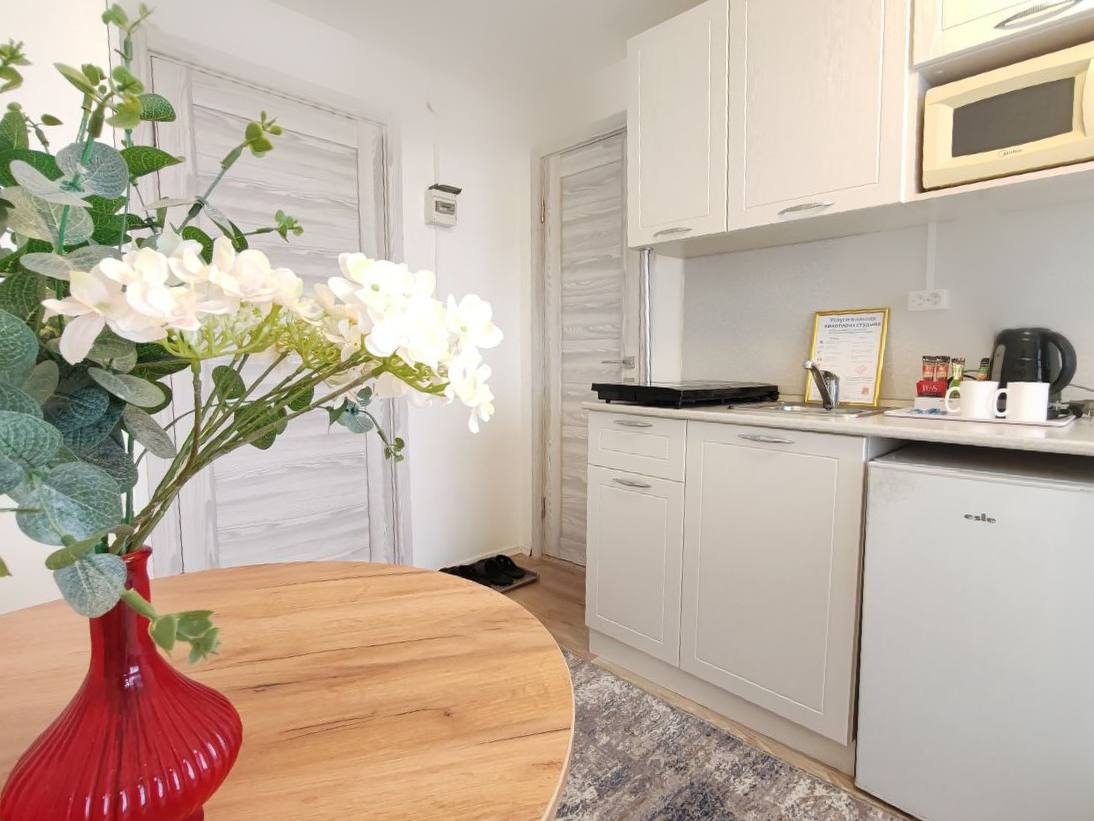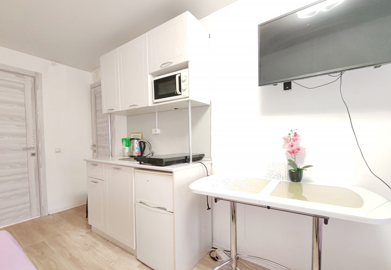 Компактная кухня оборудована мини-холодильником, плитой, СВЧ-печью, чайником и уютной обеденной зоной, благодаря чему вы сможете порадовать себя любимыми блюдами в любое время.