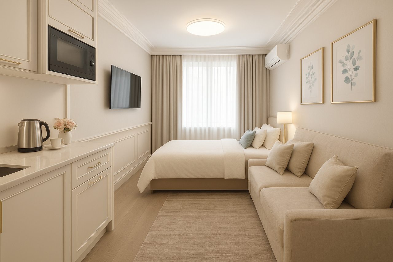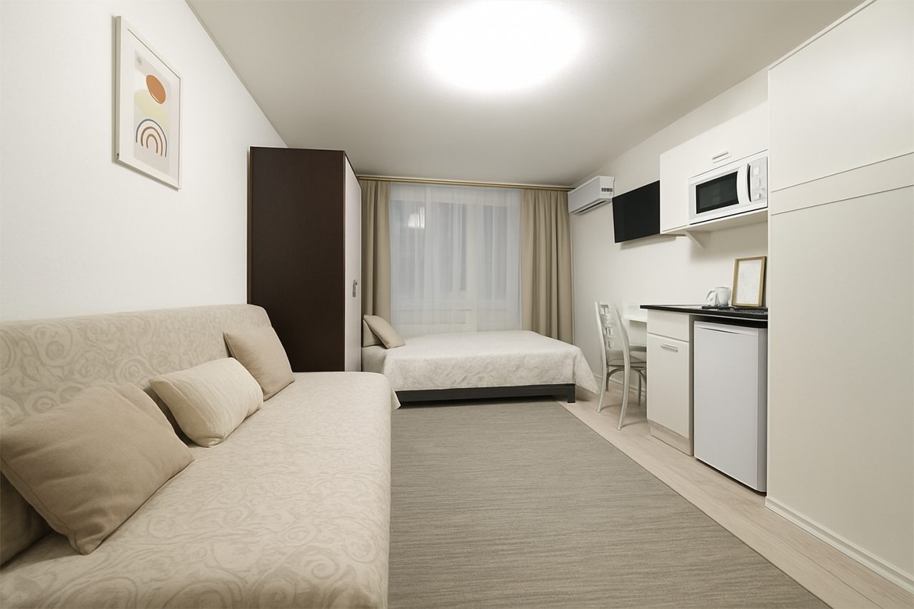 «Самара Комфорт» — это светлые апартаменты, которые расположились недалеко от живописной Волги и парка Ю. А. Гагарина в Самаре.