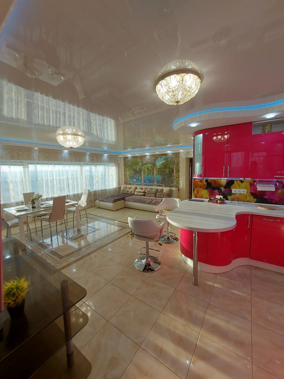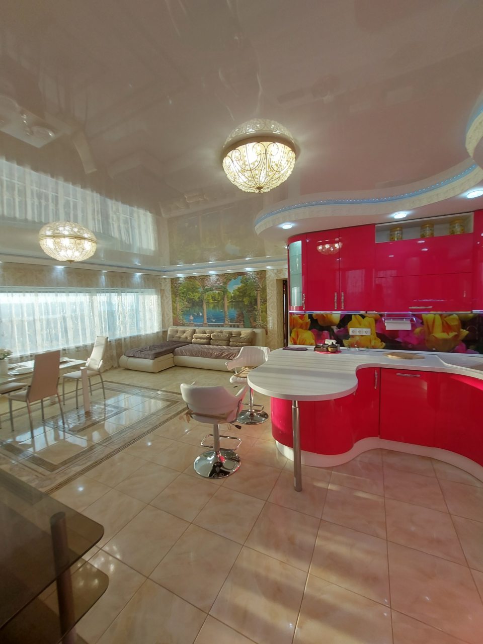 В просторной и стильной квартире созданы все условия для комфортного проживания. Площадь квартиры позволит разместиться компании или семье из большого количества человек. Из оснащения представлены: три уютнейшие кровати, гладильные принадлежности, рабочий стол, шкаф-купе для одежды, сплит система и пол с подогревом. Есть ванная комната с гидромассажной ванной, стиральной машиной и водонагревателем. Имеется телевизор, а также высокоскоростной Wi-Fi.