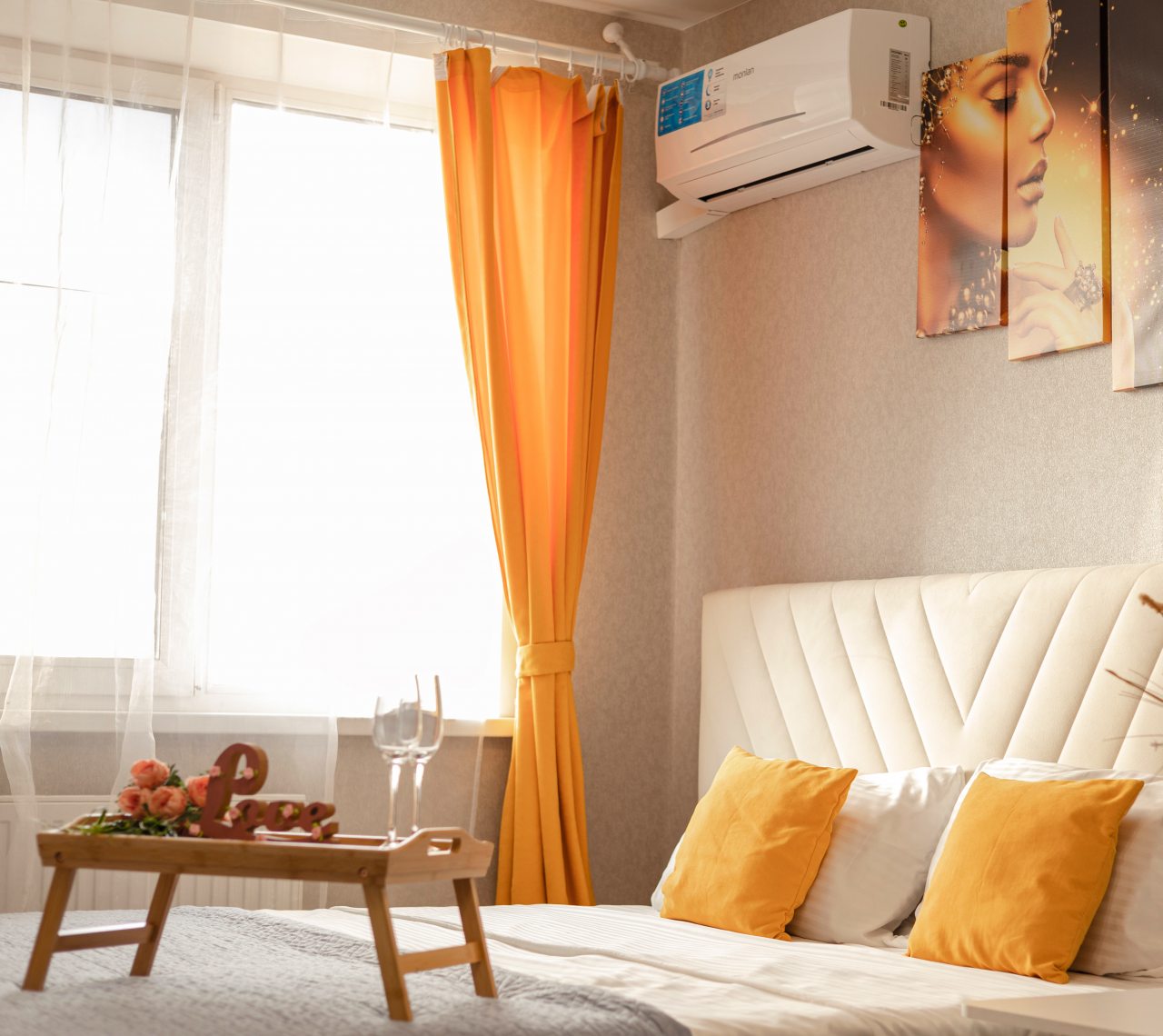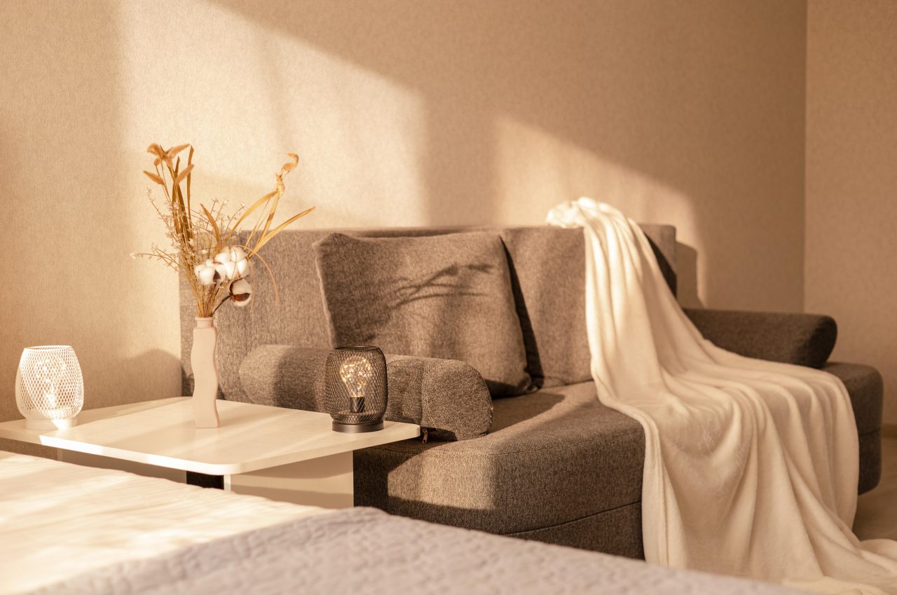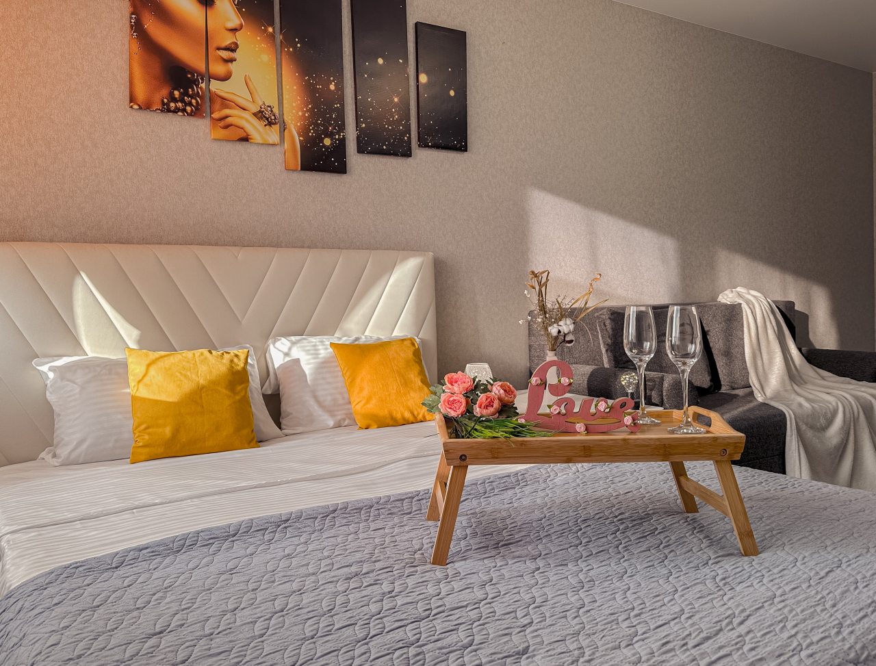 Внутри гостей ожидает большая и удобная кровать, мягкий диван, кондиционер, телевизор, различные зоны хранения, а также полноценная ванна и стиральная машина.