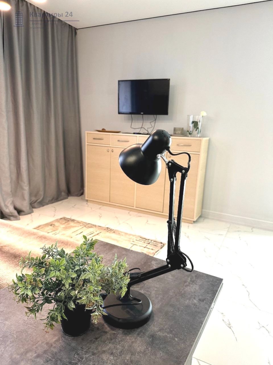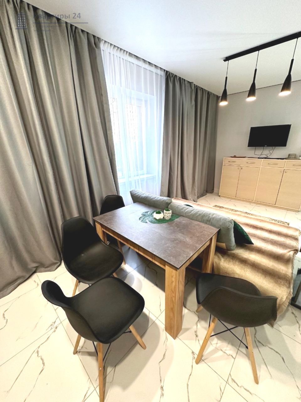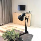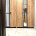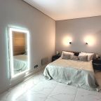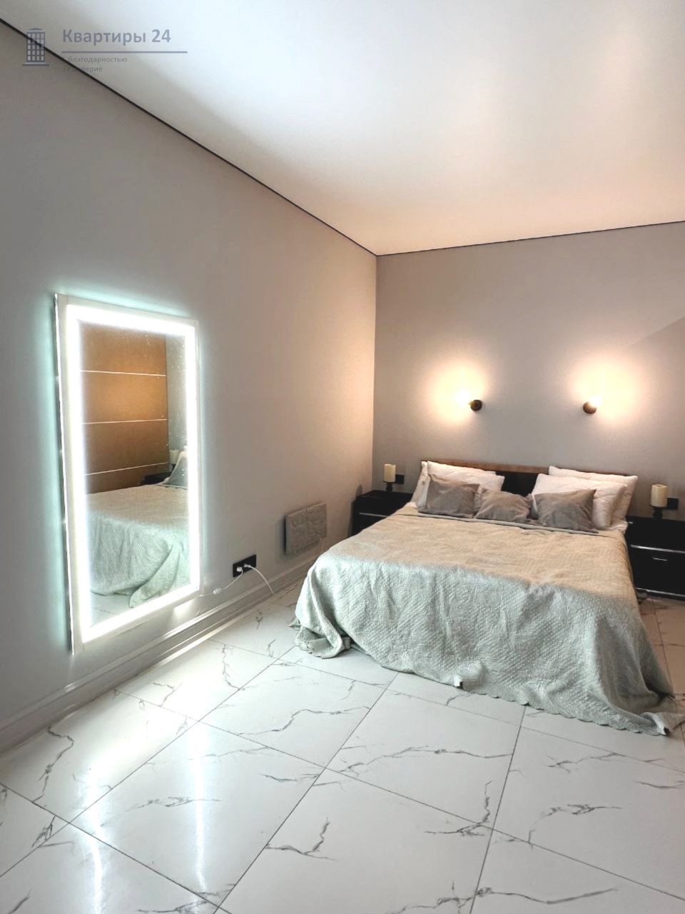 Внутри вас ожидает качественная мебель и техника, в том числе удобная двуспальная кровать, прикроватные светильники и лампы, зеркало с подсветкой, диван, телевизор, вместительный шкаф.