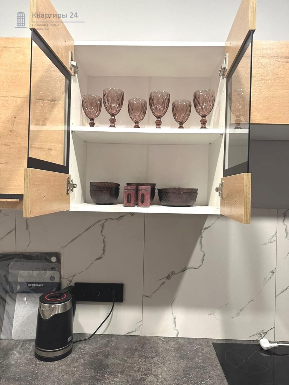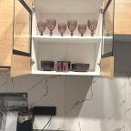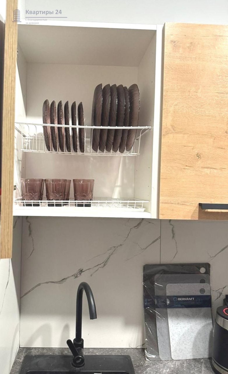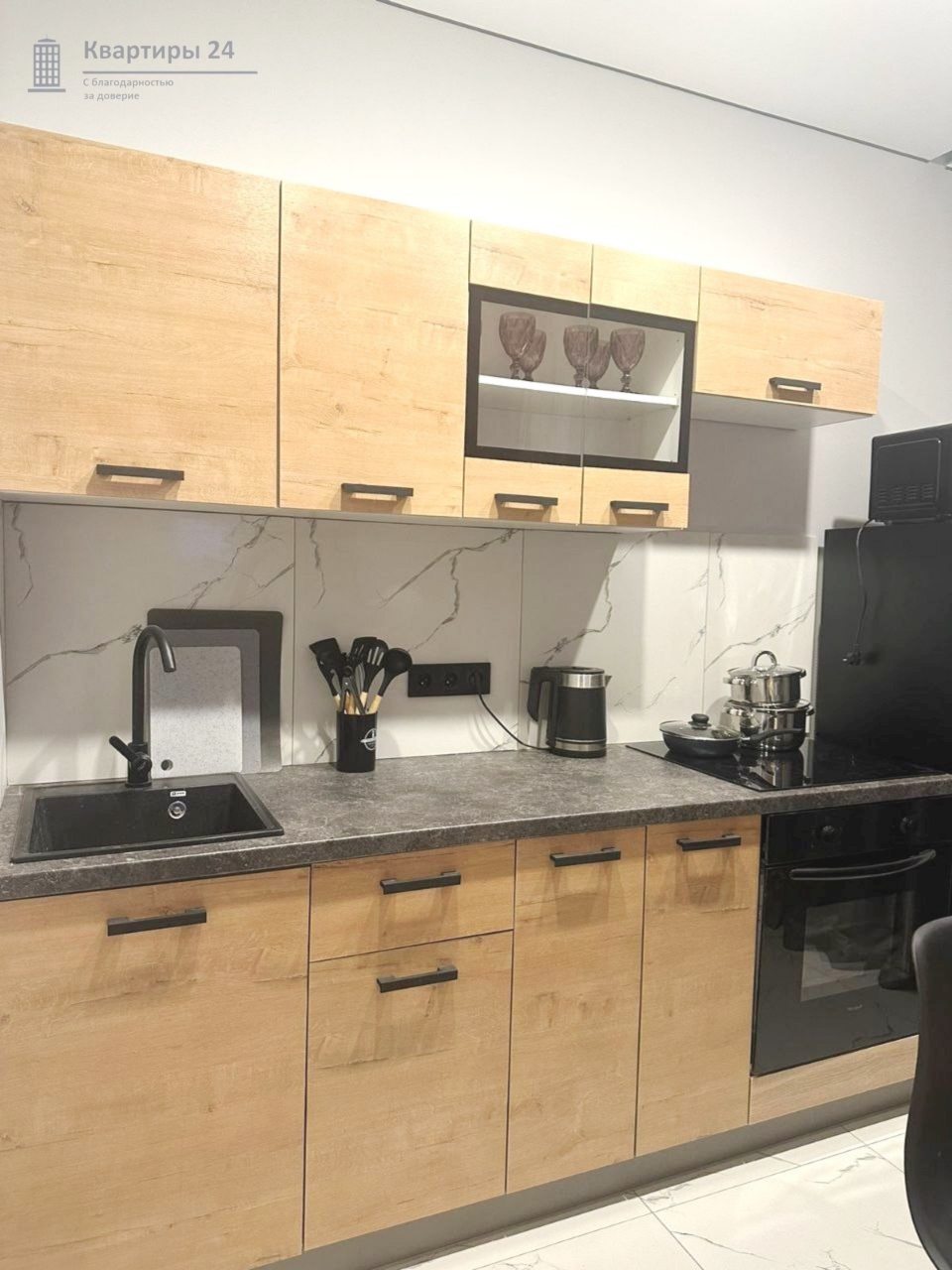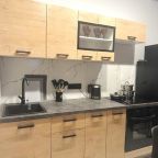 На кухне будет приятно готовить домашние напитки и блюда, так как в наличии духовой шкаф, варочная панель, комплект посуды и кухонной утвари, холодильник, чайник, красивая обеденная зона.