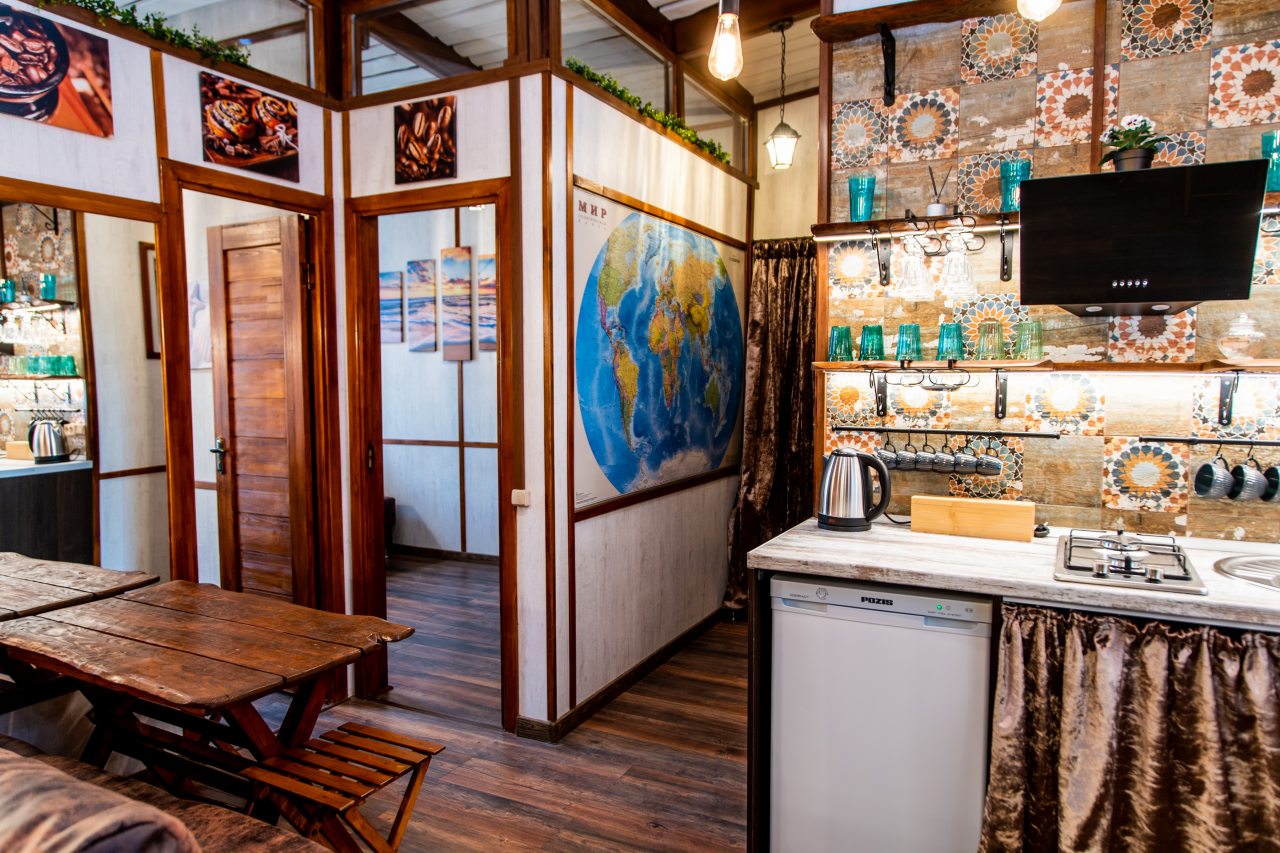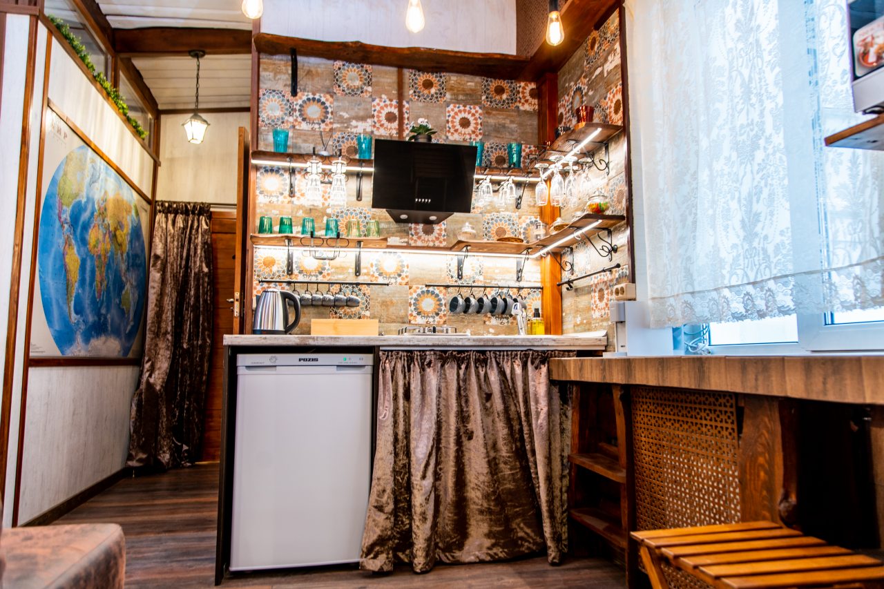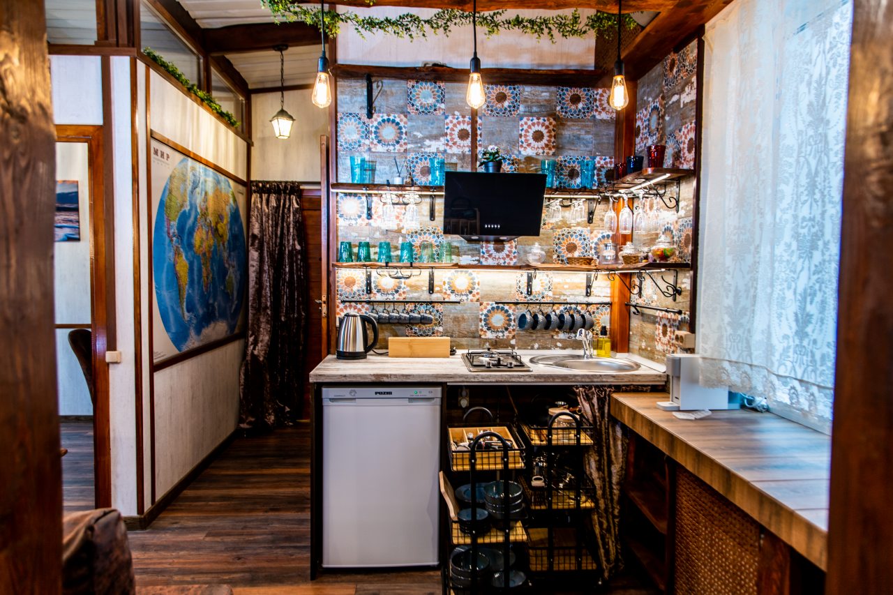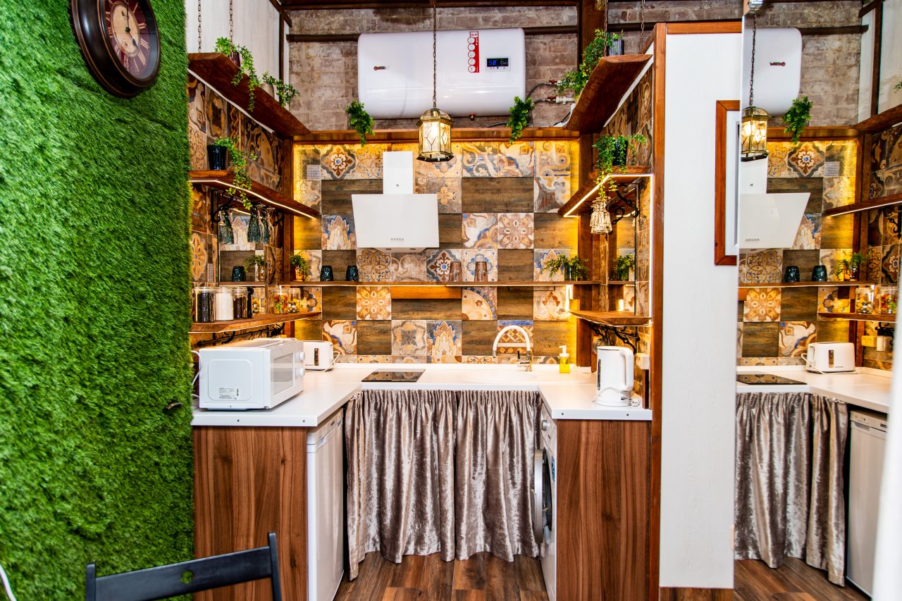 В гостевом доме имеется кухня, в которой располагаются холодильник, микроволновая печь и другие нужные принадлежности для приготовления еды. Неподалеку располагаются кафе и магазин продуктов питания.