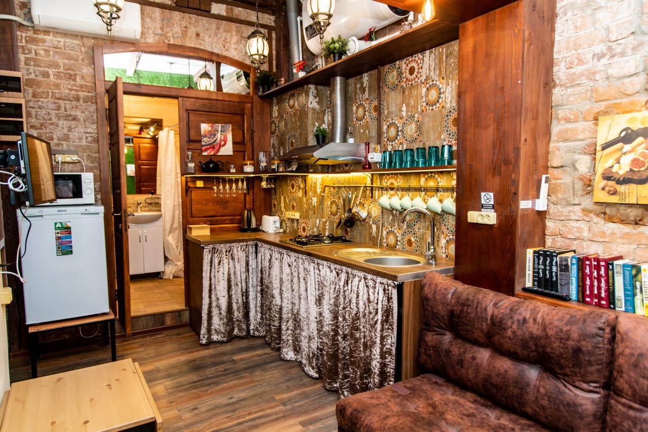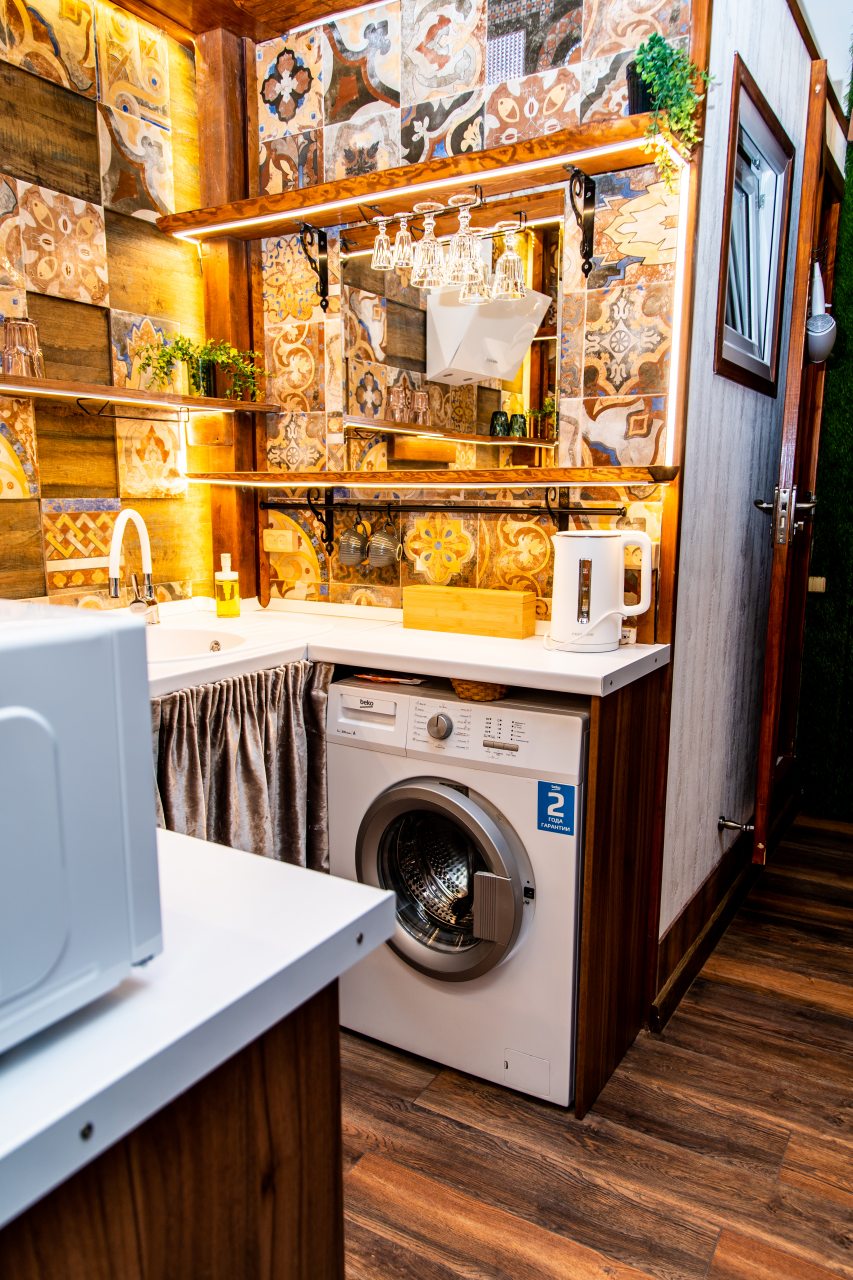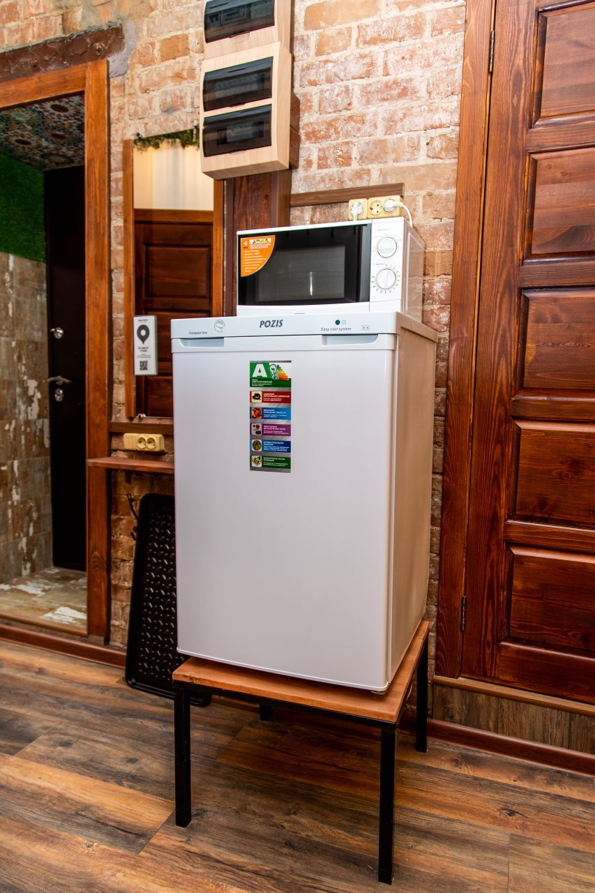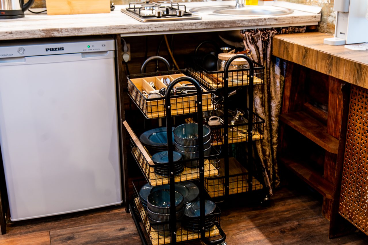 В гостевом доме имеется кухня, в которой располагаются холодильник, микроволновая печь и другие нужные принадлежности для приготовления еды. Неподалеку располагаются кафе и магазин продуктов питания.