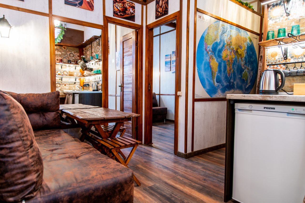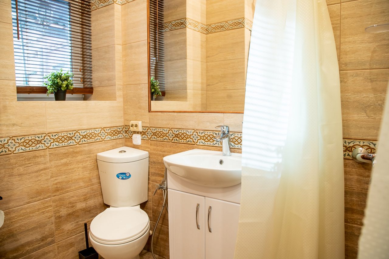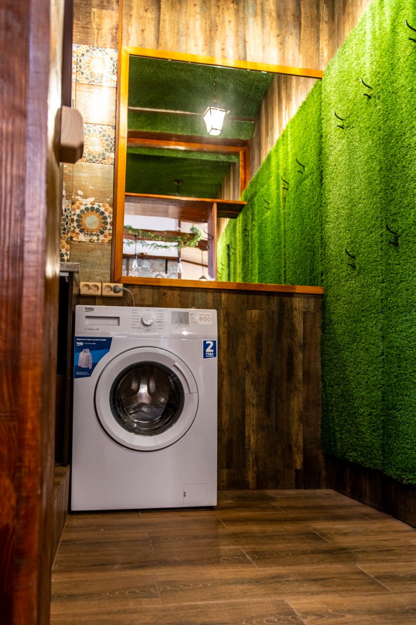 В гостевом доме предусмотрена вся нужная мебель, а также балкон, отопление, ванная комната с феном, есть стиральная машина. На крыше размещена веранда.
